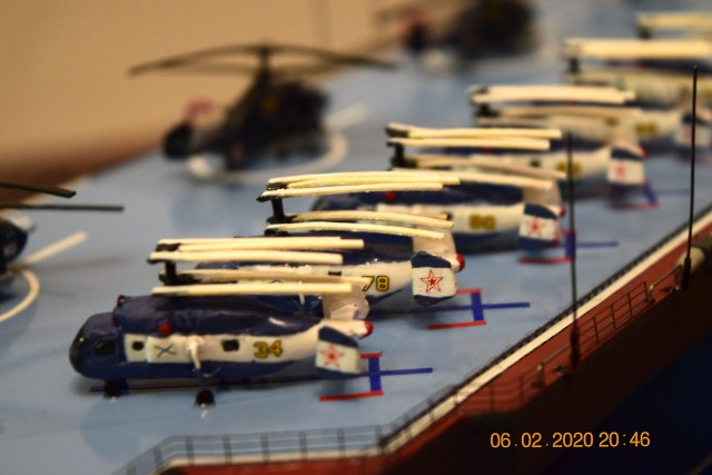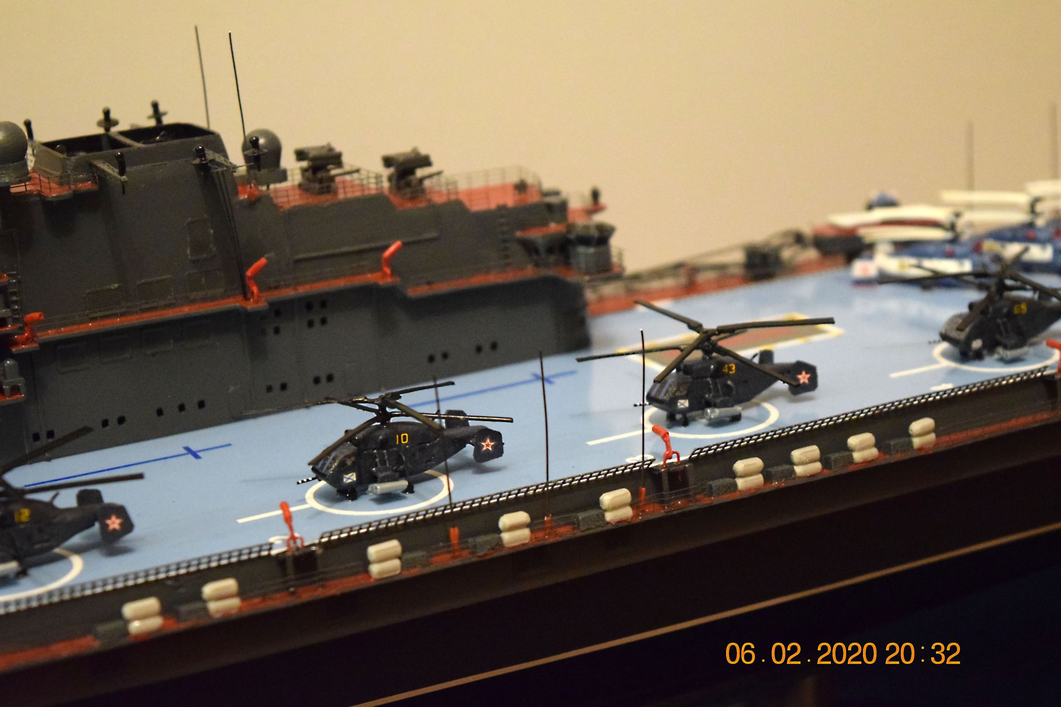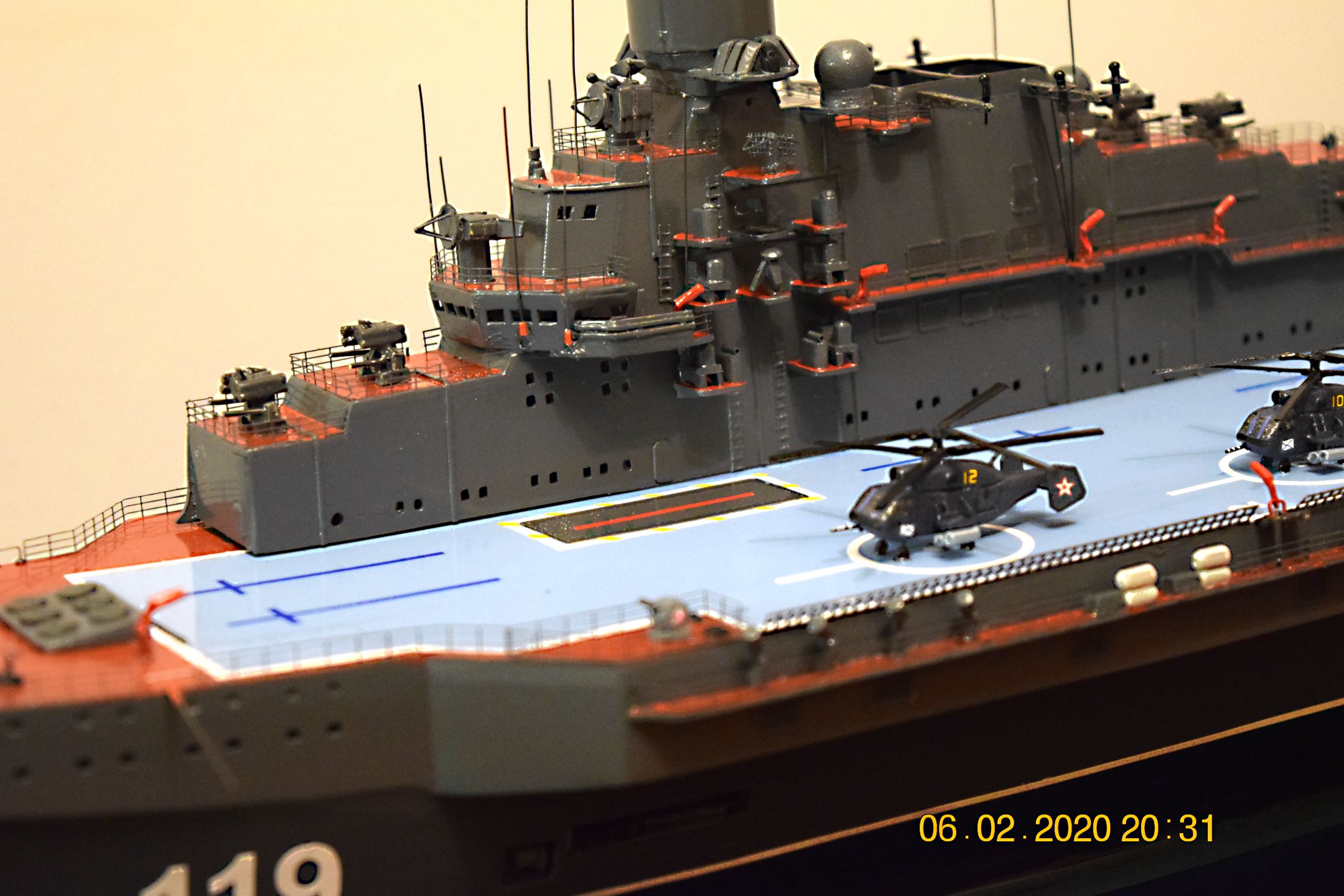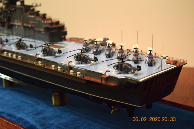 Модель выполнена вручную традиционно из листового ПВХ 3 мм и листового полипропилена 1 мм . Окраска корпуса, палубы, производилась полиамидными эмалями. Бортовой номер, разметка полетной палубы, КВЛ выполнены из самоклеющейся пленки. Из готовых изделий использовано ФТД: стойки лееров в масштабе 1\250-300 от фирмы SudoModelist. Локаторы и антенные посты изготовлены из стальной проволоки сечения 0,35 мм. Било использовано также ФТД (вьюшки) от фирмы Микродизайн. Авиация выполнена путем литья с применением двухкомпонентного жидкого пластика.