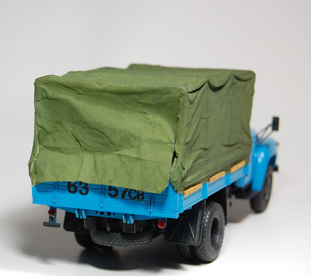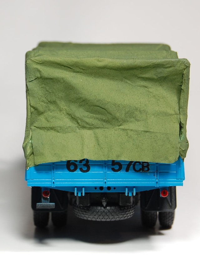 На заднем борту продублирован номер с помощью сухих декалей,маленькие номера еще не готовы.Красил Тамией X-14,XF-80-кабина и кузов,тент-XF-58.
