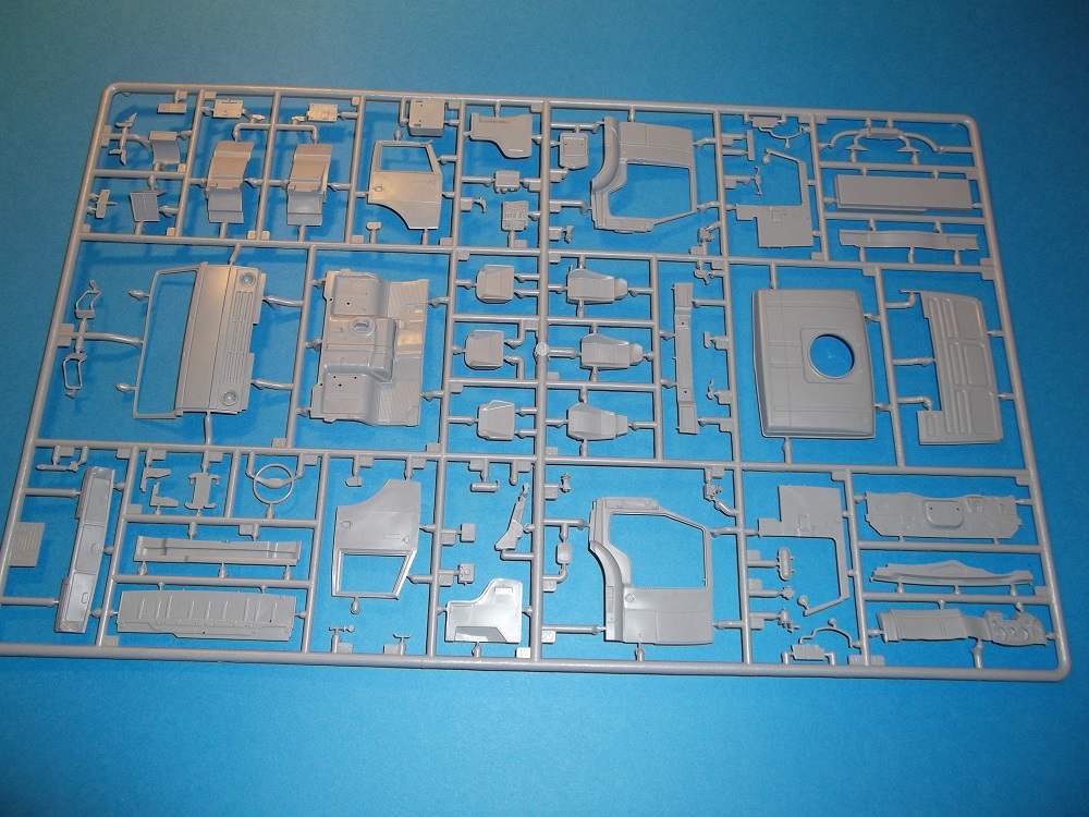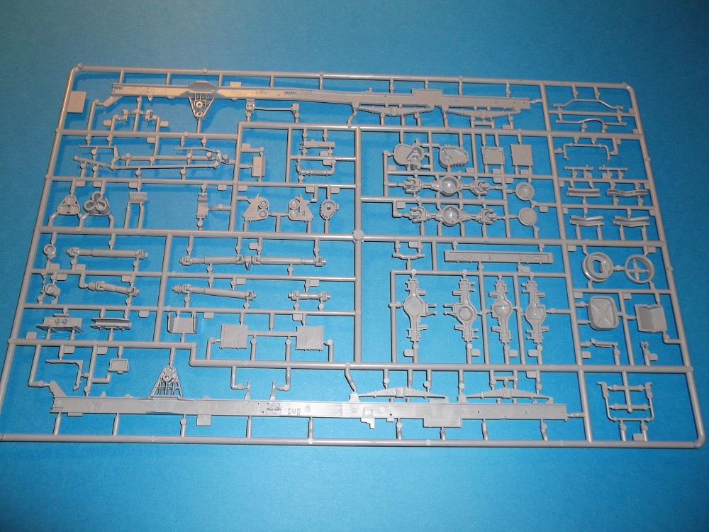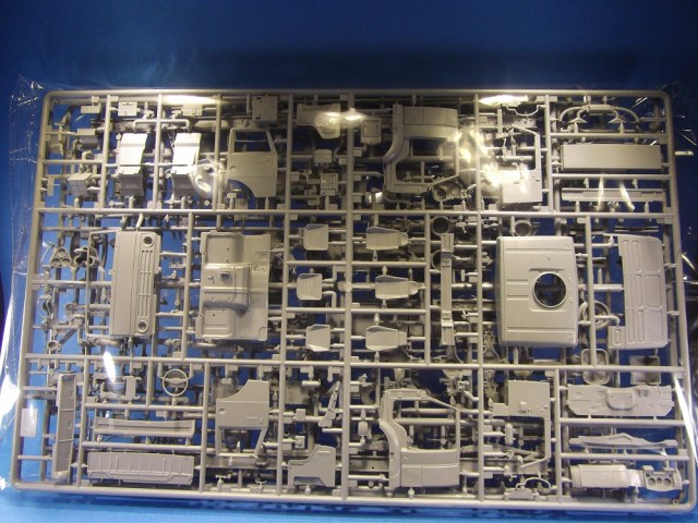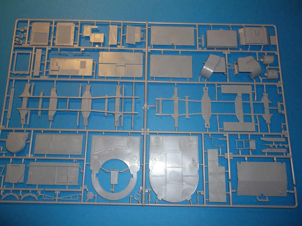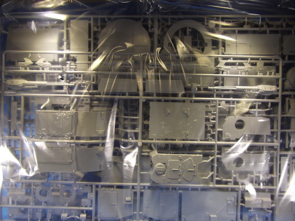В первом пакете 4 литника с деталями серого цвета(кабины, двигателя, трансмиссий и рамы). Во втором пакете также 4 литника боевого модуля и трансмиссий.