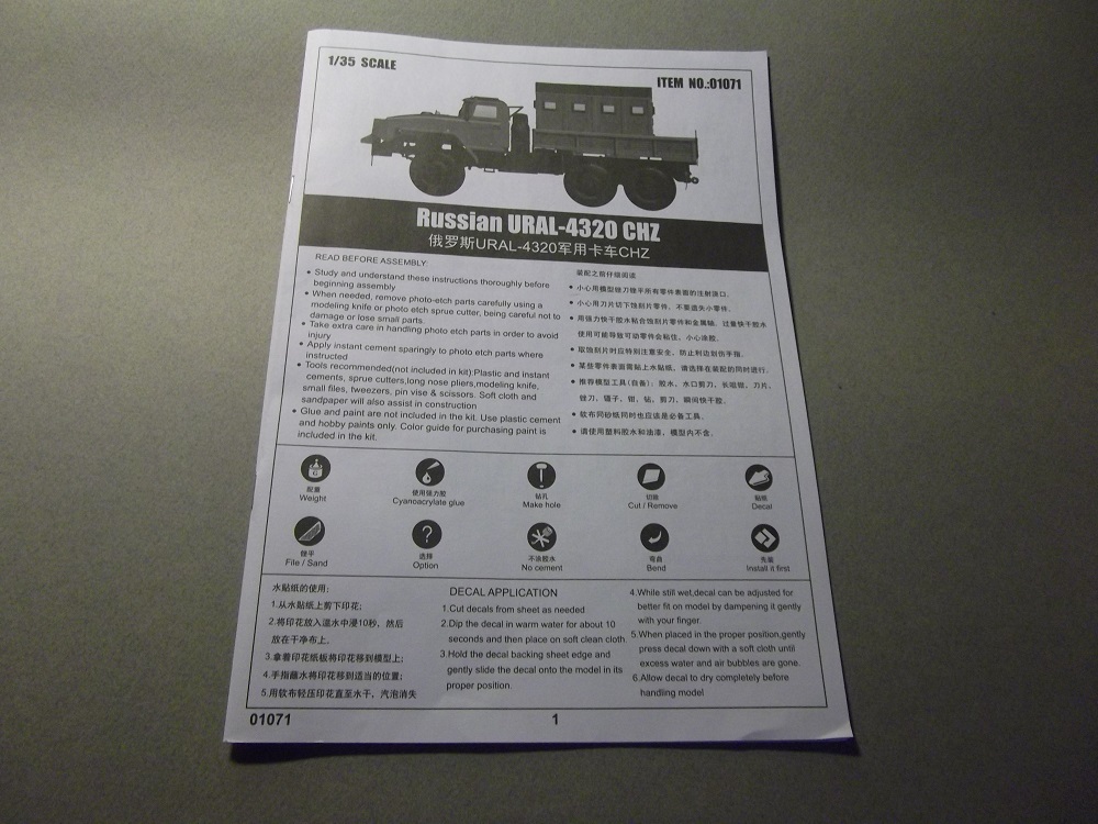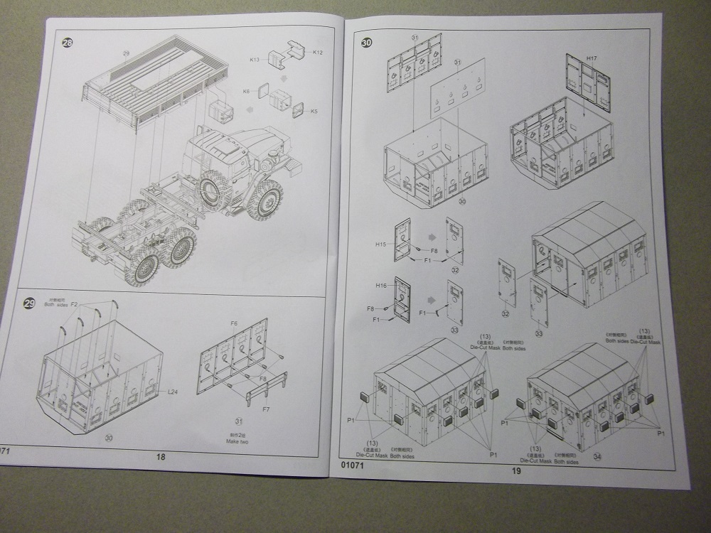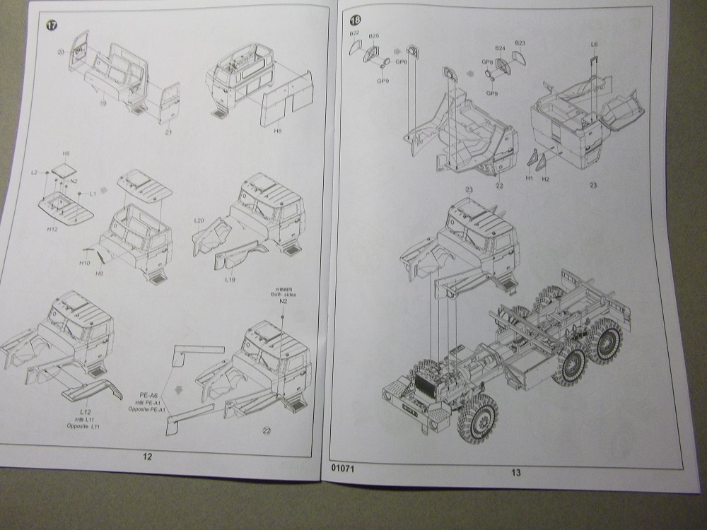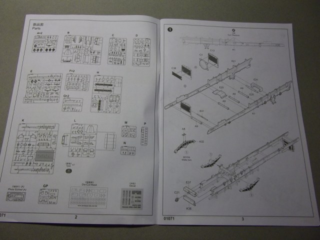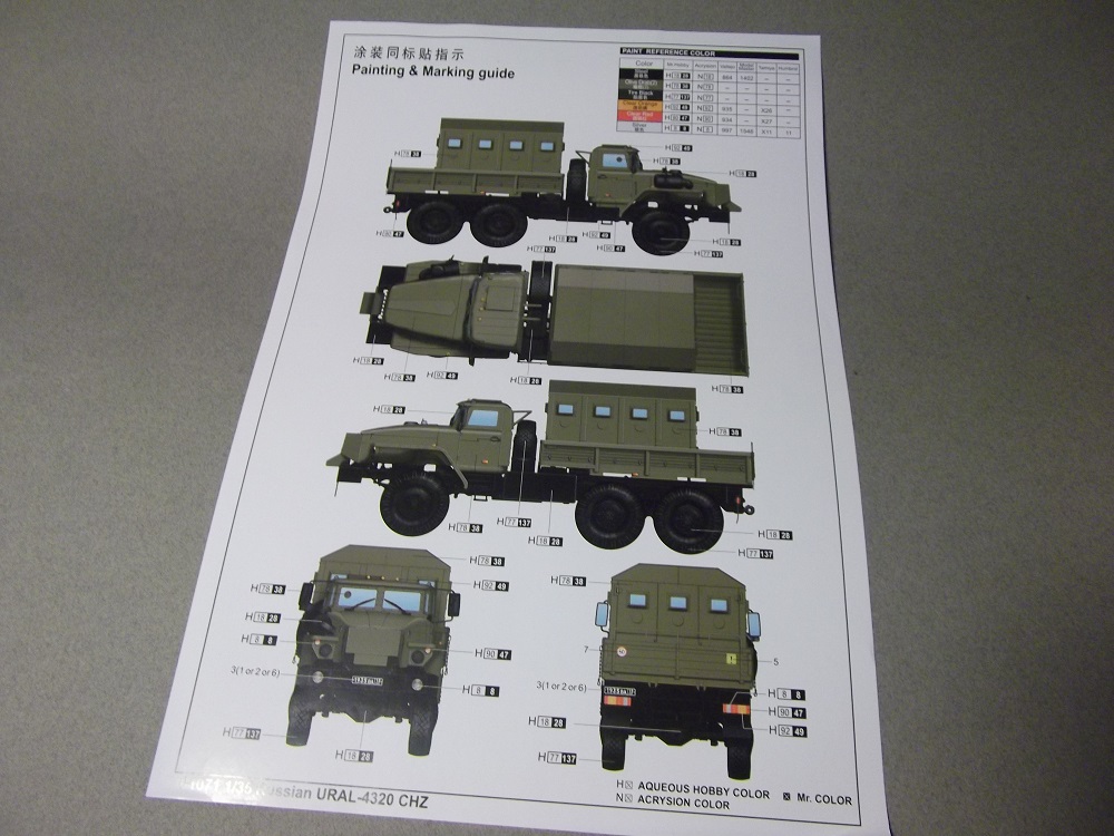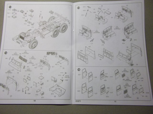 Содержит 13 литников серого пластика, (+ часть кабины и кузовной бокс одной деталью), 4 литника прозрачного пластика,декаль,2 платы фототравления , 7 колёс, маски для стекл(что очень радует ), инструкцию, лист с вариантом окраски и реклама продукции производителя.