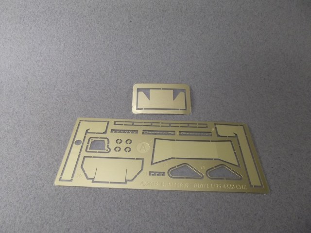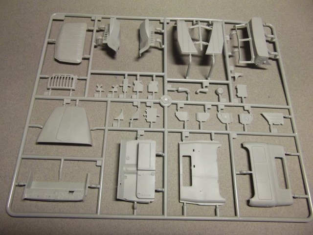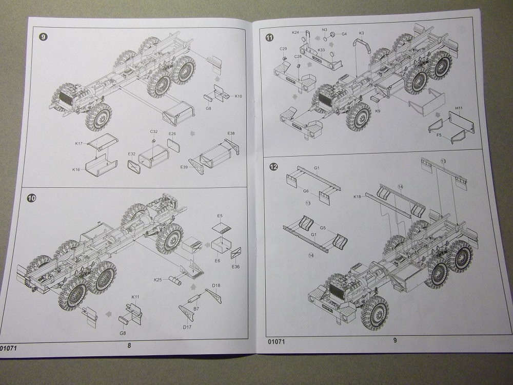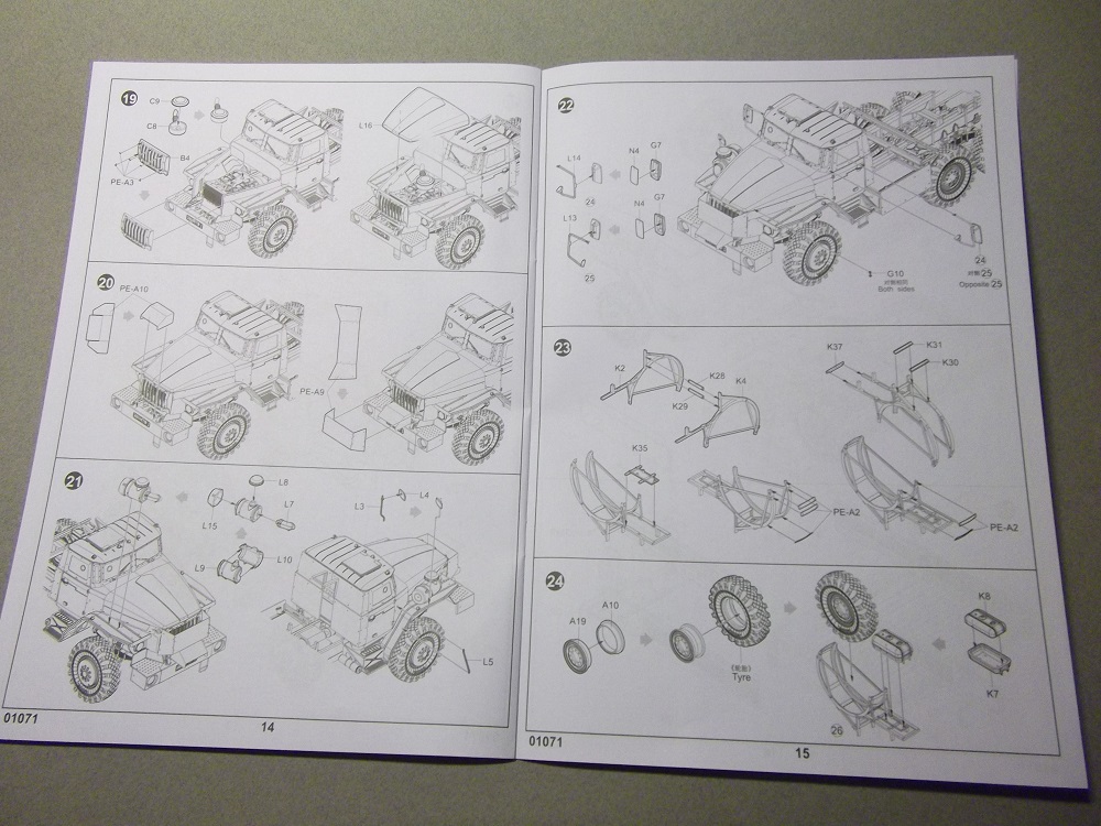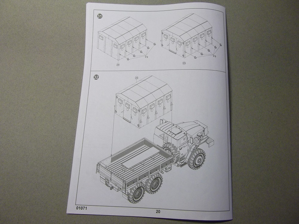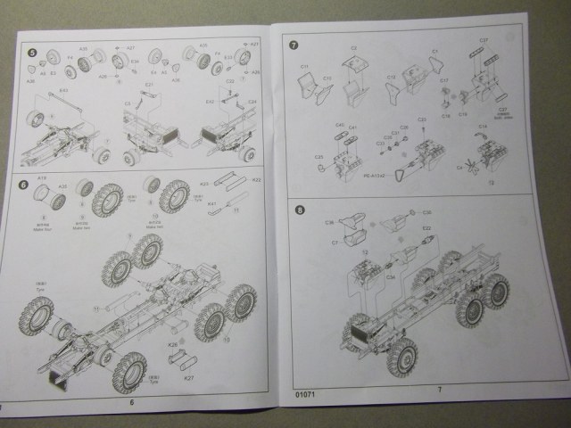 Содержит 13 литников серого пластика, (+ часть кабины и кузовной бокс одной деталью), 4 литника прозрачного пластика,декаль,2 платы фототравления , 7 колёс, маски для стекл(что очень радует ), инструкцию, лист с вариантом окраски и реклама продукции производителя.