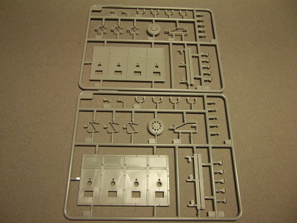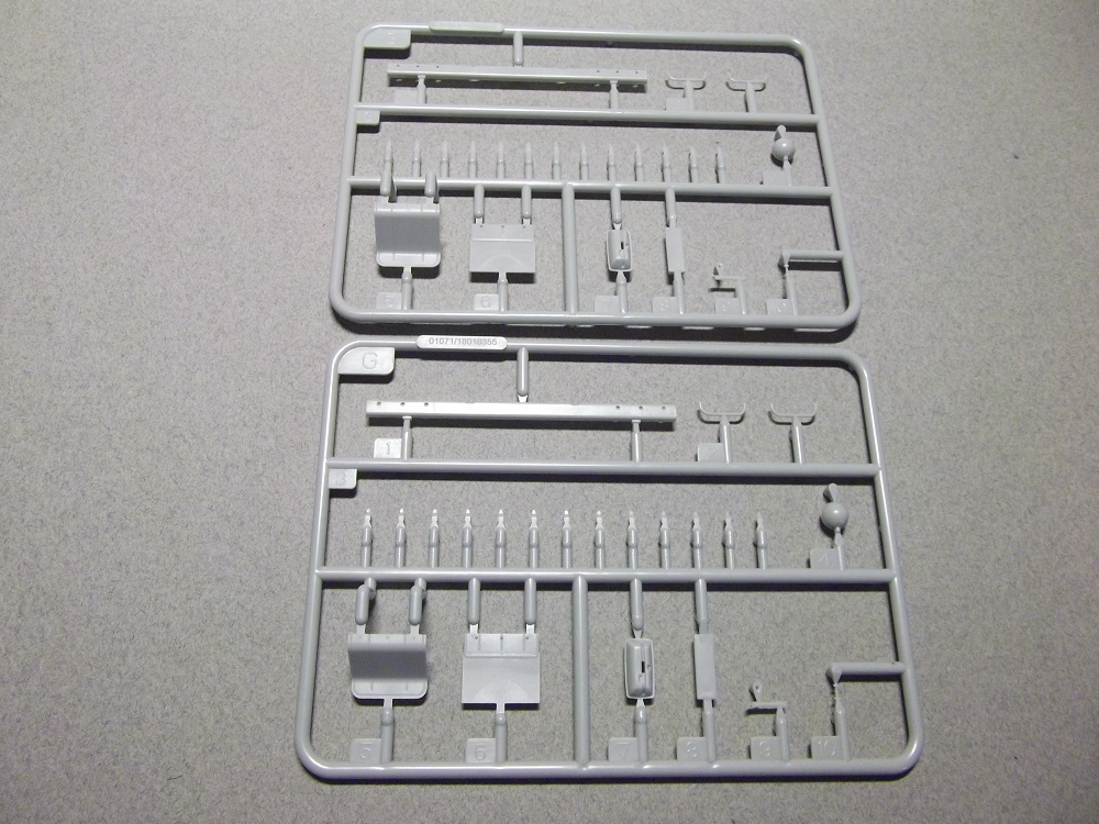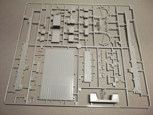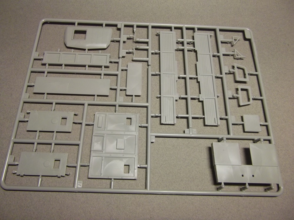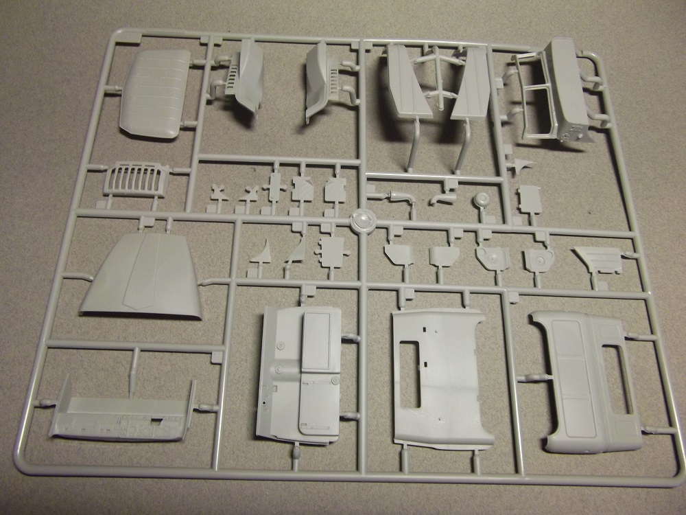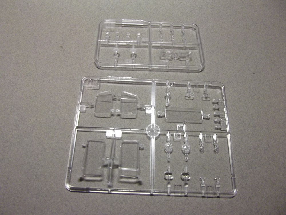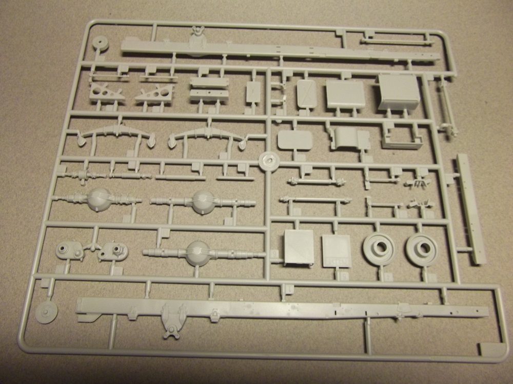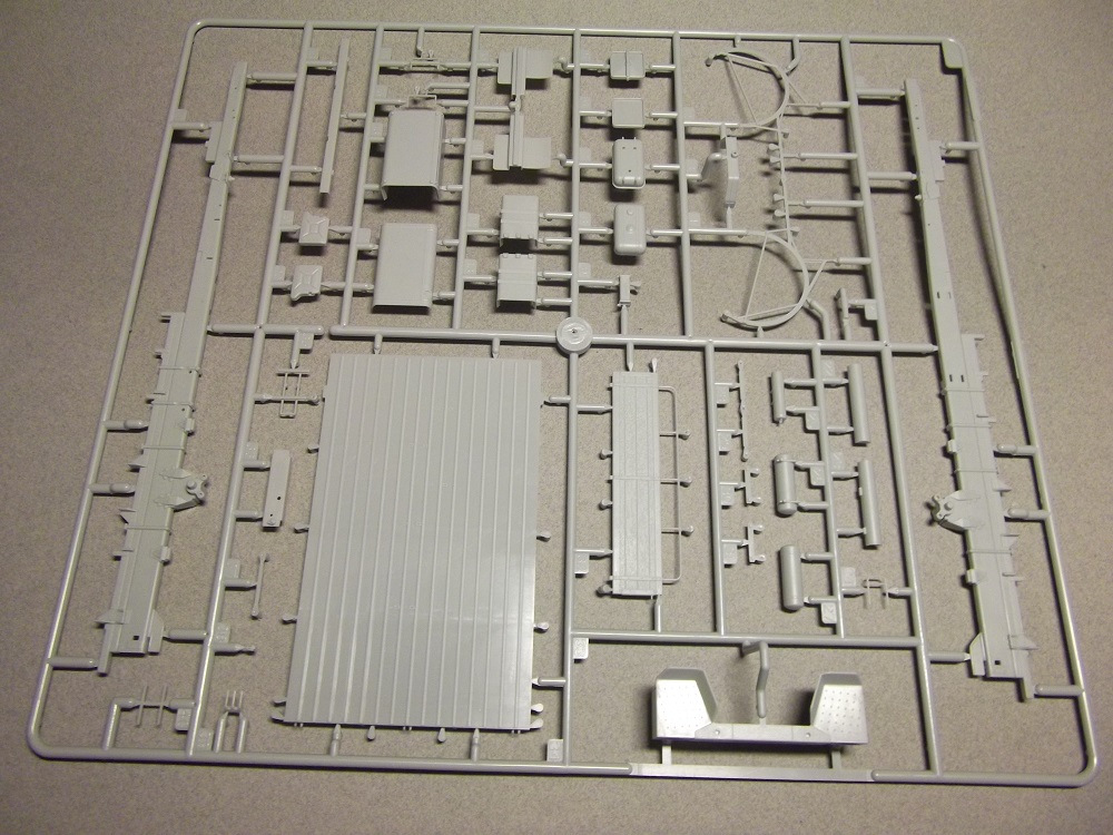 Серый пластик знакомого хорошего качества. Большинство литников упаковано дополнительно мягкой защитной лентой. Присутствует двигатель, дана трансмиссия, коробка передач. Много мелких деталей.