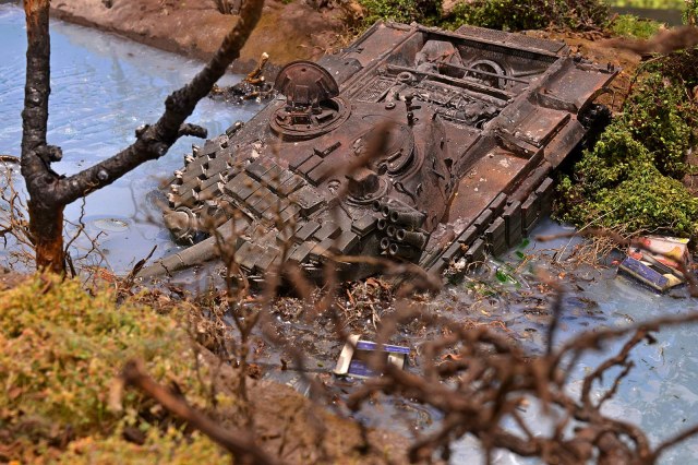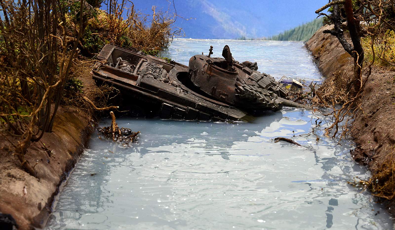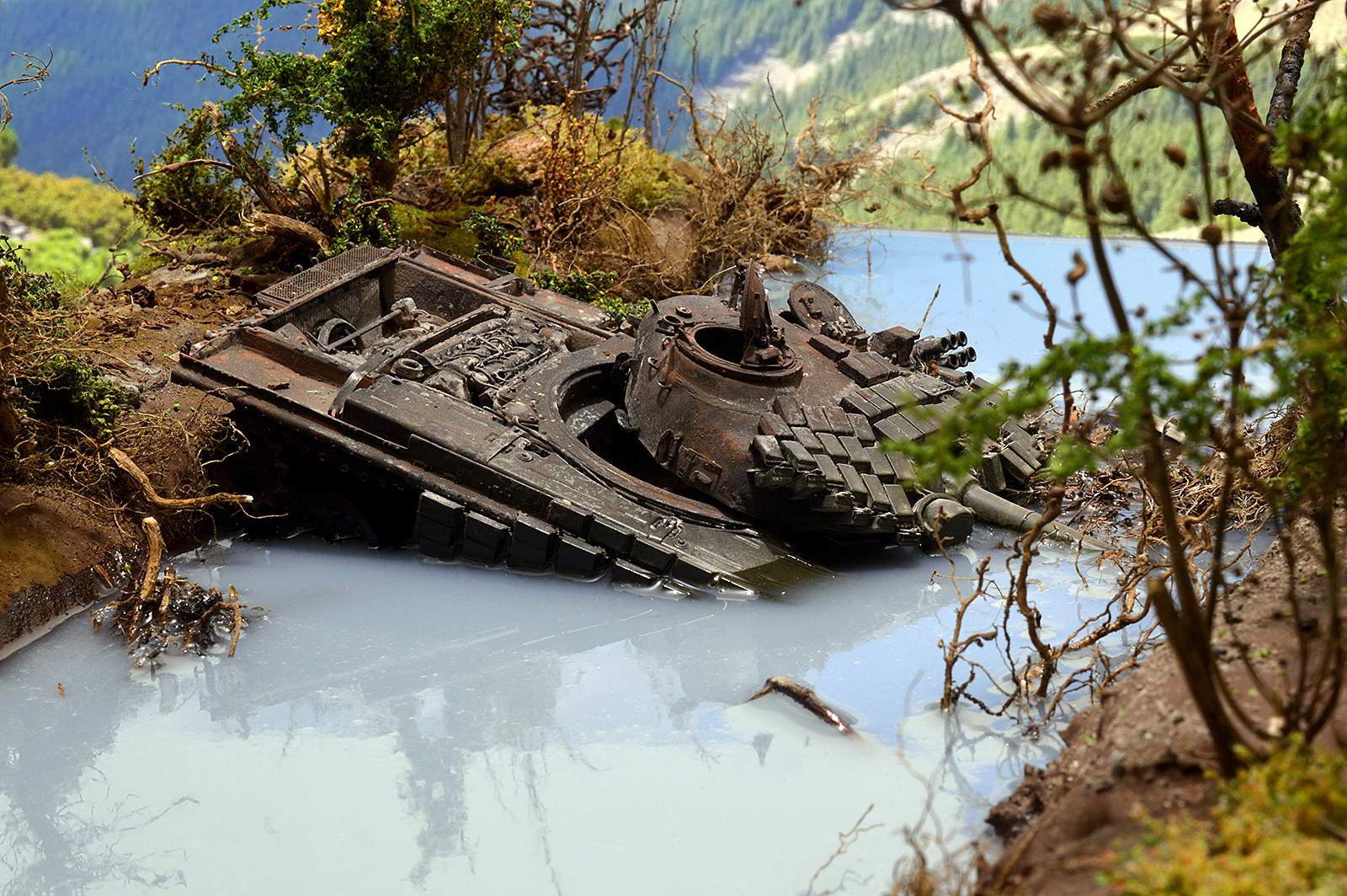 Сделал вот такую неординарную композицию… Действие происходит в 2008-м году в оросительном канале между селом Никози и Цхинвалом Южная Осетия. Мысли грузинских танкистов непонятны. То ли они хотели перепрыгнуть оросительный канал сходу, то ли, увидев мою водицу, подумали, что бетонка, проскочим. А оказалась вода, кисельные берега. А может, и бобры перетащили танЬчик… для переправы. В общем, результат вот такой получился.