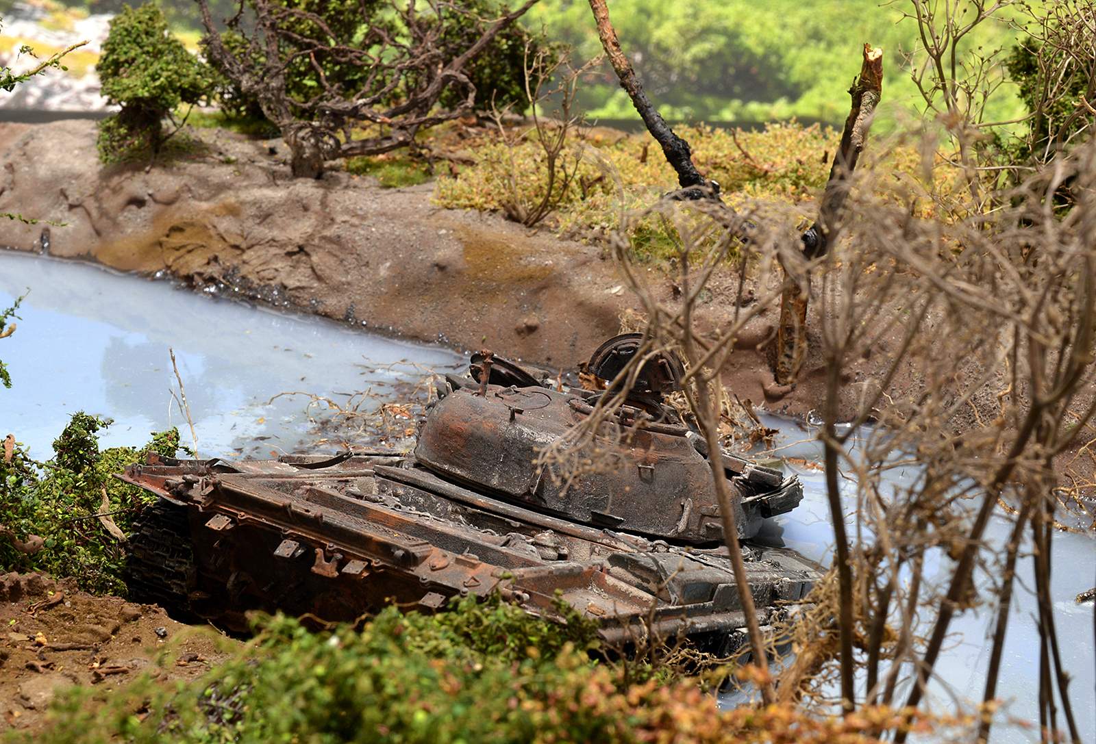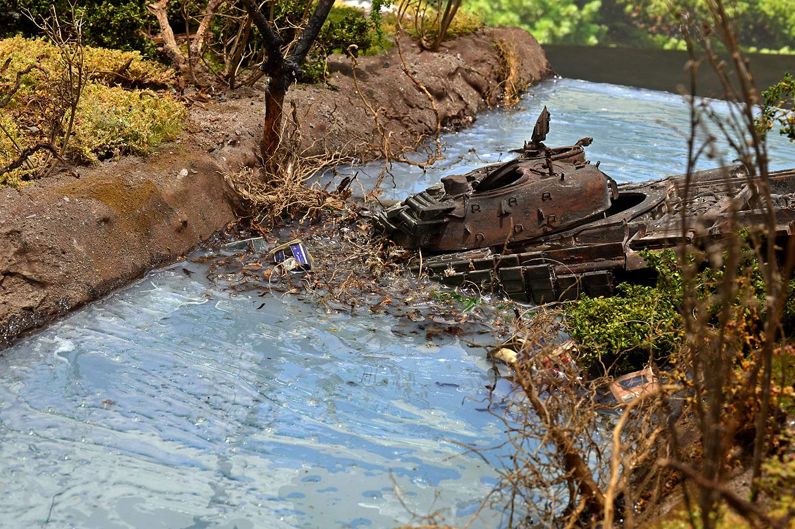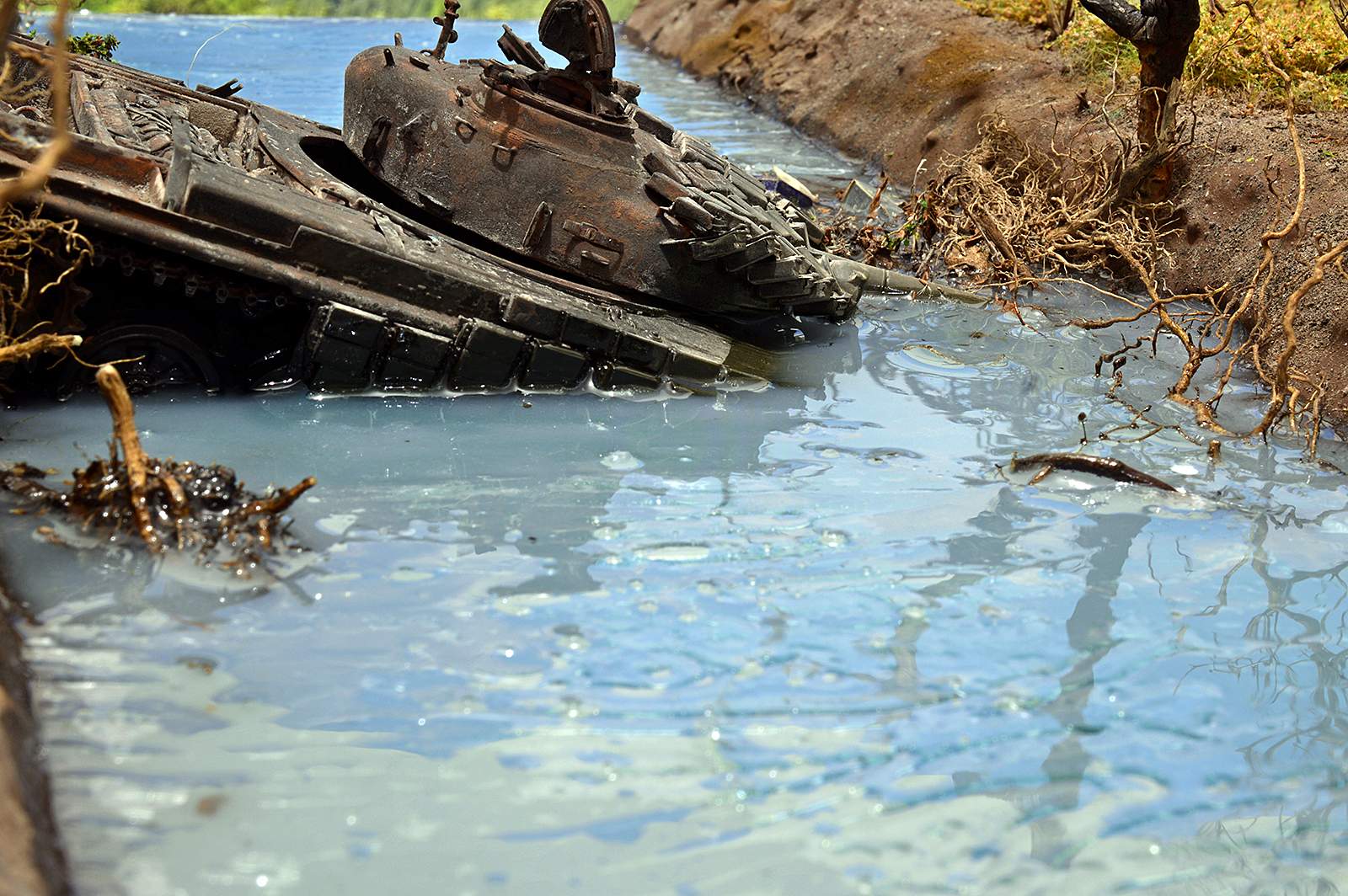 Сделал вот такую неординарную композицию… Действие происходит в 2008-м году в оросительном канале между селом Никози и Цхинвалом Южная Осетия. Мысли грузинских танкистов непонятны. То ли они хотели перепрыгнуть оросительный канал сходу, то ли, увидев мою водицу, подумали, что бетонка, проскочим. А оказалась вода, кисельные берега. А может, и бобры перетащили танЬчик… для переправы. В общем, результат вот такой получился.