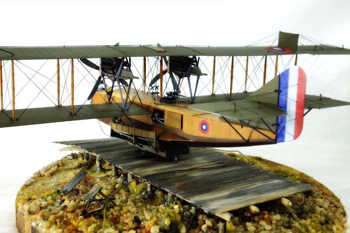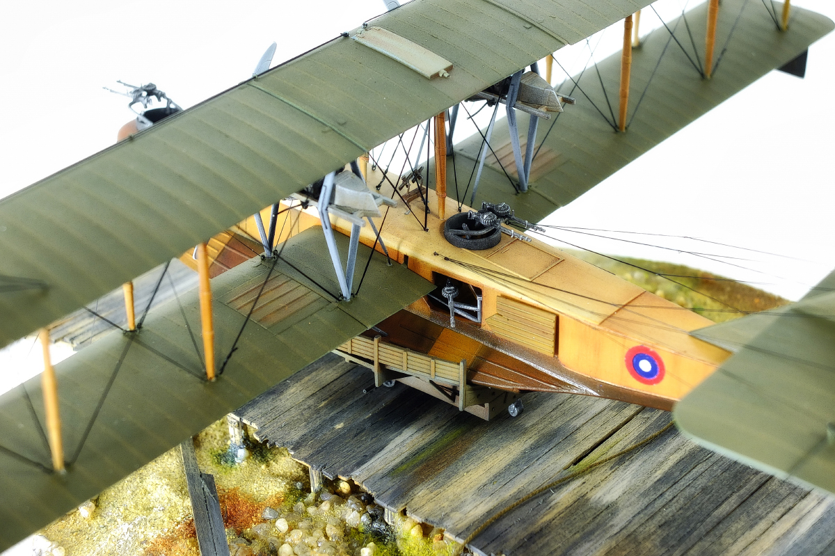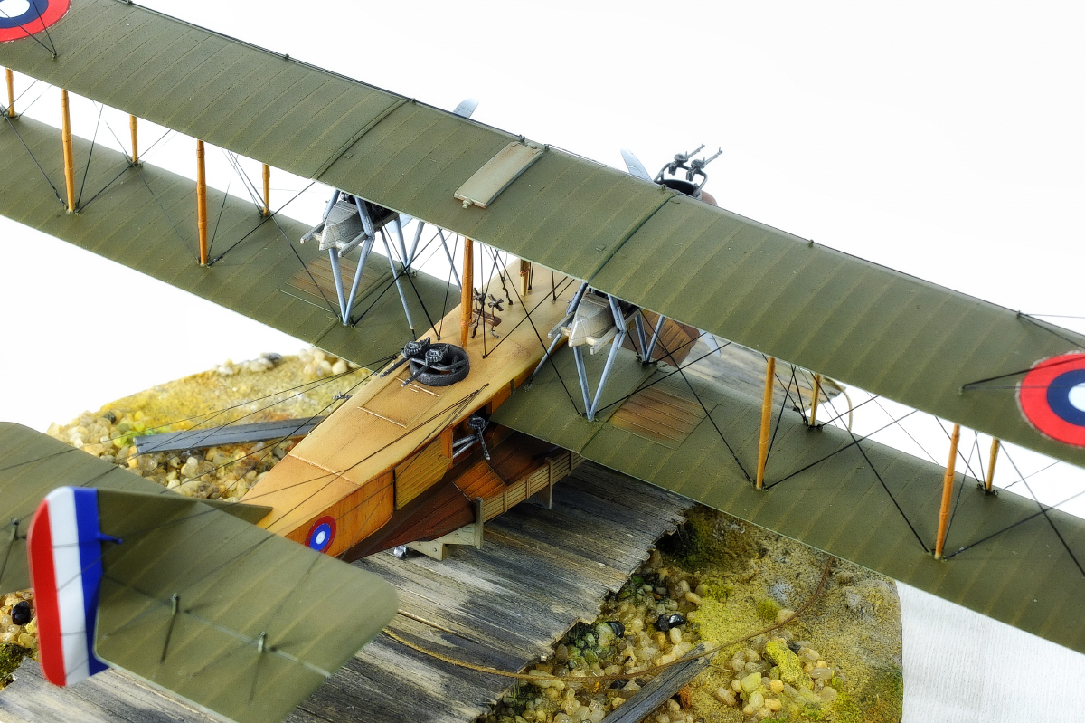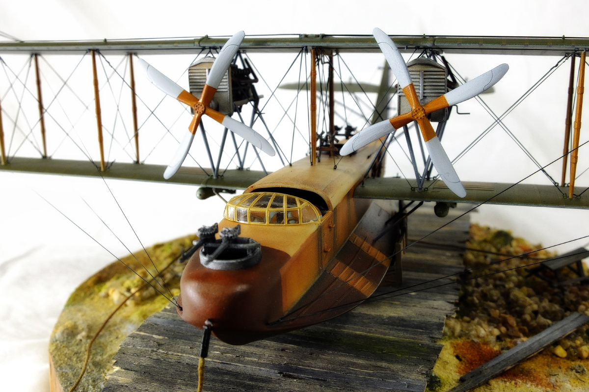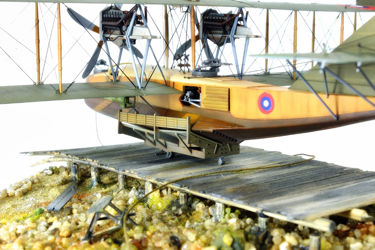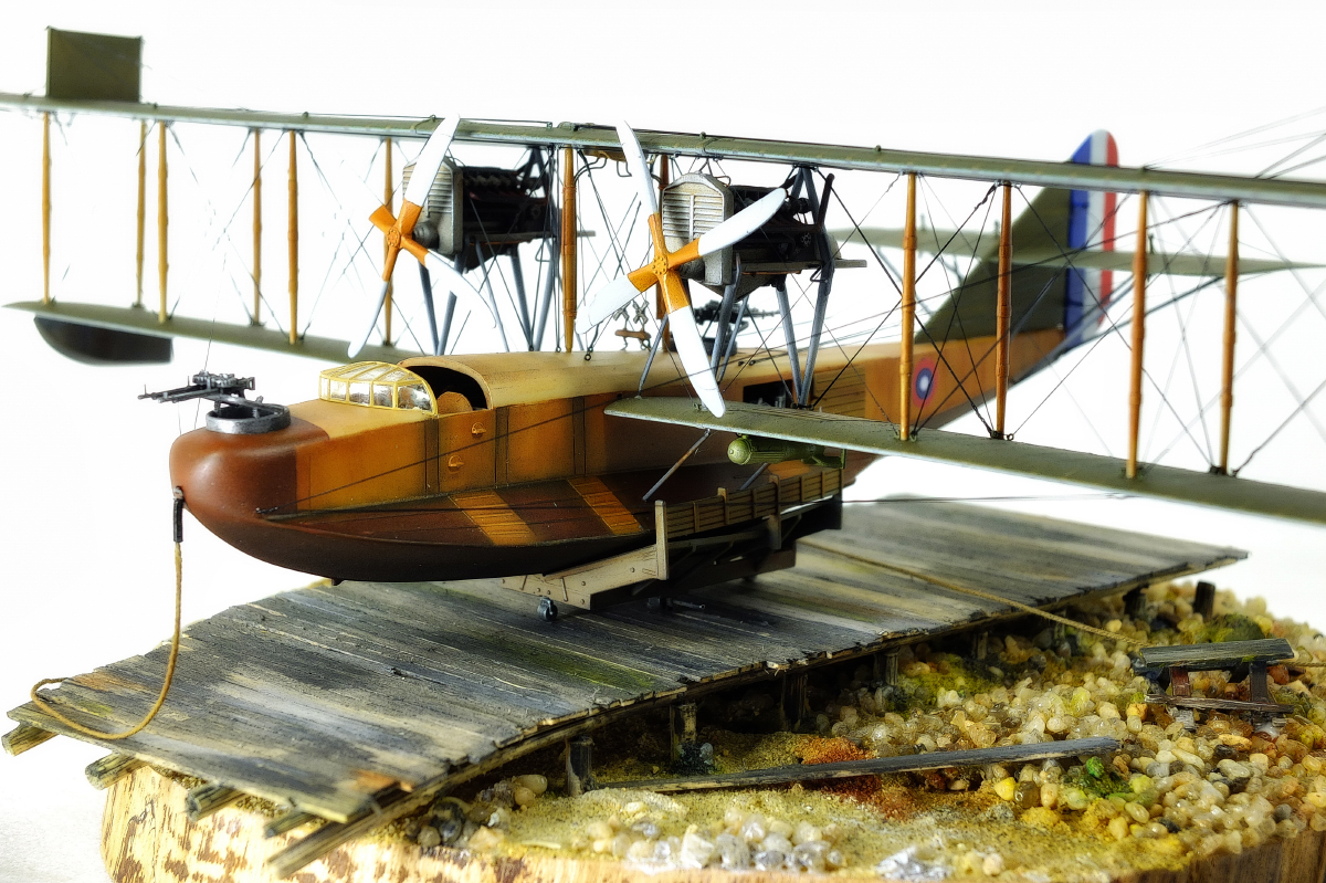 Набор украинской фирмы RODEN. Набор мне понравился. Облоя, утяжен и прочих дефектов литья нет. Стыкуемость деталей хорошая. Проработка деталей тоже на высоте. В плане сборки самолет не показался мне простым, хотя небольшой опыт сборки «швейных машинок» у меня имеется. Уж больно сложный кандибобер получался в процессе стройки. Бипланная коробка, даже расчаленная представляет собой весьма нежную конструкцию. Приходилось засверливать торцы крыльев, использовать иглы для более прочной стыковки. Да и очередность сборки не соответствовала инструкции. В процессе окраски не сильно придерживался наставлений, хотел вскрыть корпус художественным маслом, показать структуру фанеры, не знаю, насколько это мне удалось. Отдельно хочется остановиться на декалях. Легли легко, без проблем на глянцевую поверхность. Однако утром был неприятно удивлен тем, что края декалей приподнялись, появилось серебрение по краям. Кокарда с корпуса вообще при попытки довести ее до ума просто отклеилась от него. Ладно, раз так, думаю, уберу декали, сделаю трафареты, напылю кокарды и номера. Но не тут-то было. Номера с корпуса не хотели убираться полностью никак. Пришлось сошлифовывать всю свою имитацию фанеры и все рисовать заново. Крылья не стал трогать, наносить снова имитацию нервюр (зашивки нервюр), прешейдинг, не хватило на это духу, так и оставил серебрение на них, чуть уменьшив эффект нанесением матового лака. В остальном стройка шла как обычно, немного повозился с двигателями, по инструкции должны были быть Liberty, а на деле производитель положил Rolls-Royce Eagle IV. Пришлось изворачиваться. Сымитировал интерьер салона, хотя его довольно сложно рассмотреть на модели, обилие растяжек, тяг и прочего «такелажа» вызывает опасение лишний раз брать модель в руки. Растяжки были изготовлены из спандекса, продетые в 0,3 мм медные колечки, вклеенные в пластик, окраска - акриловые и масляные краски.