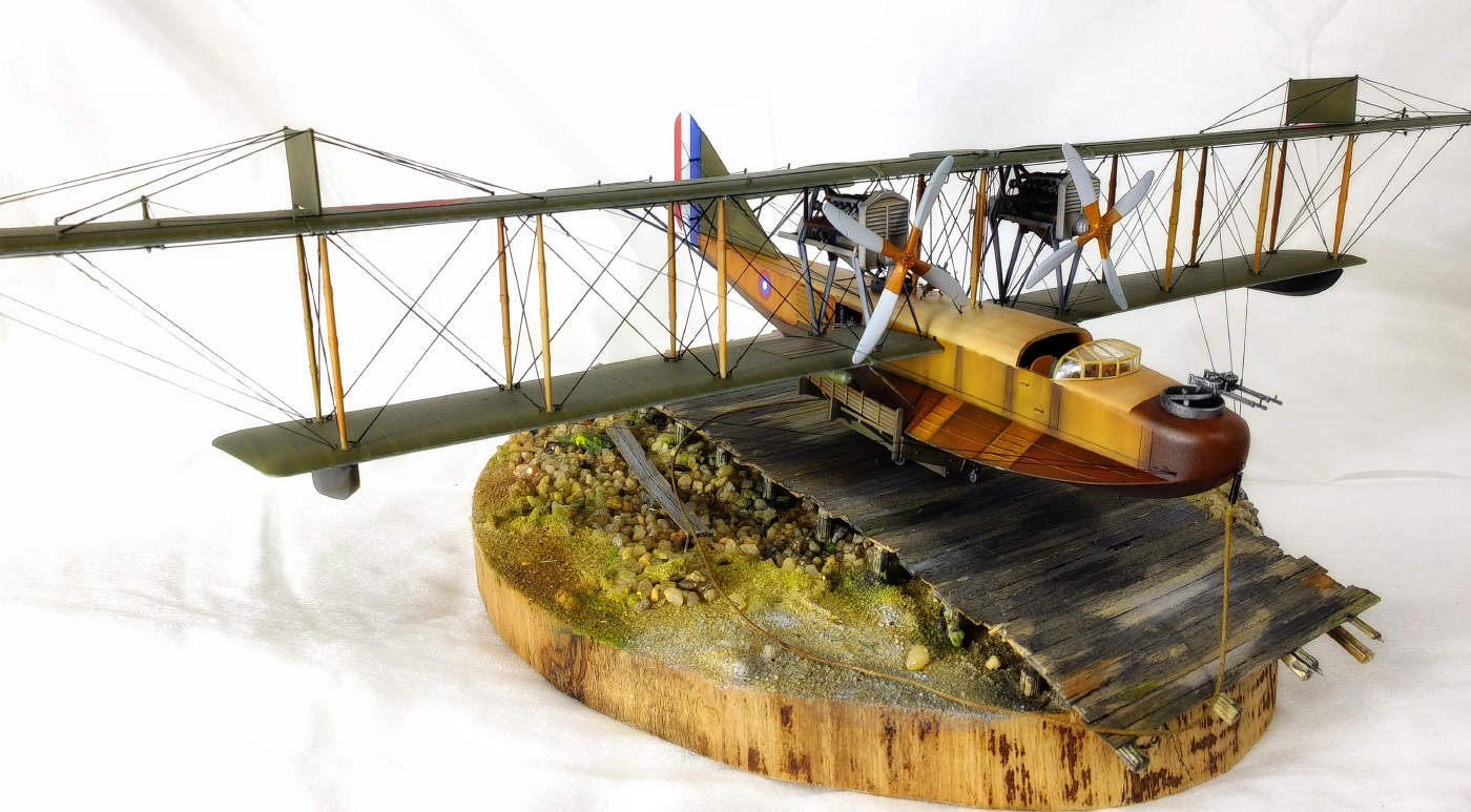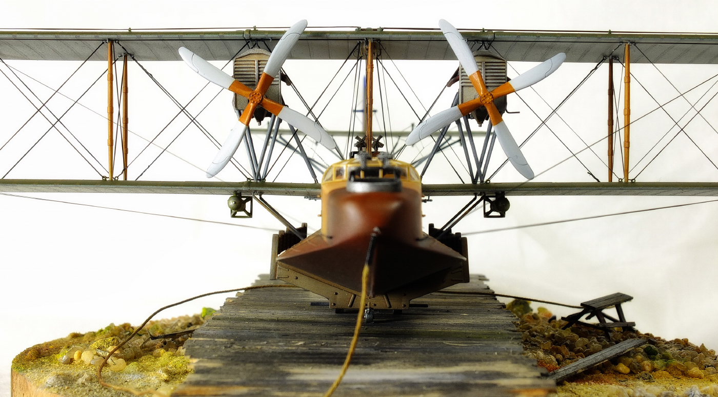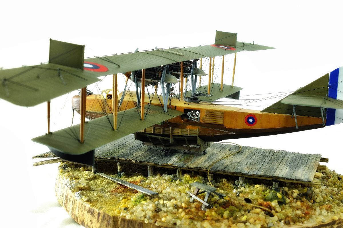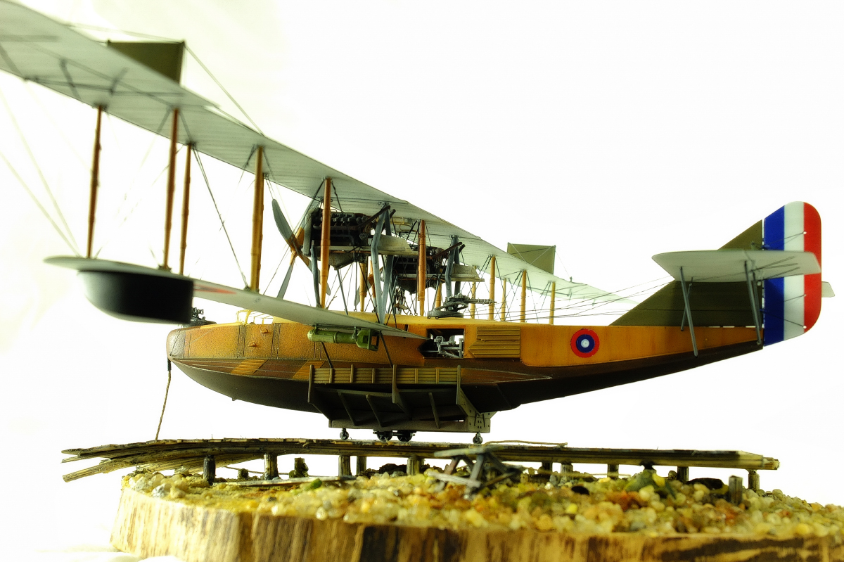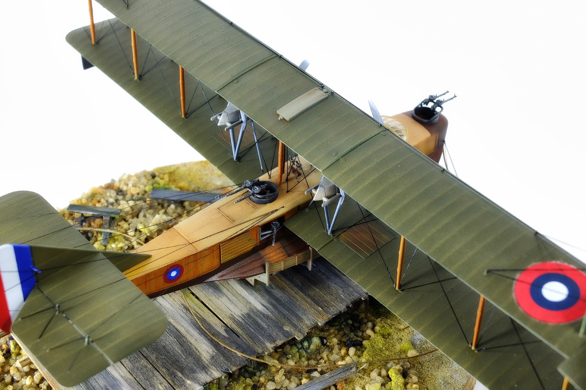 Набор украинской фирмы RODEN. Набор мне понравился. Облоя, утяжен и прочих дефектов литья нет. Стыкуемость деталей хорошая. Проработка деталей тоже на высоте. В плане сборки самолет не показался мне простым, хотя небольшой опыт сборки «швейных машинок» у меня имеется. Уж больно сложный кандибобер получался в процессе стройки. Бипланная коробка, даже расчаленная представляет собой весьма нежную конструкцию. Приходилось засверливать торцы крыльев, использовать иглы для более прочной стыковки. Да и очередность сборки не соответствовала инструкции. В процессе окраски не сильно придерживался наставлений, хотел вскрыть корпус художественным маслом, показать структуру фанеры, не знаю, насколько это мне удалось. Отдельно хочется остановиться на декалях. Легли легко, без проблем на глянцевую поверхность. Однако утром был неприятно удивлен тем, что края декалей приподнялись, появилось серебрение по краям. Кокарда с корпуса вообще при попытки довести ее до ума просто отклеилась от него. Ладно, раз так, думаю, уберу декали, сделаю трафареты, напылю кокарды и номера. Но не тут-то было. Номера с корпуса не хотели убираться полностью никак. Пришлось сошлифовывать всю свою имитацию фанеры и все рисовать заново. Крылья не стал трогать, наносить снова имитацию нервюр (зашивки нервюр), прешейдинг, не хватило на это духу, так и оставил серебрение на них, чуть уменьшив эффект нанесением матового лака. В остальном стройка шла как обычно, немного повозился с двигателями, по инструкции должны были быть Liberty, а на деле производитель положил Rolls-Royce Eagle IV. Пришлось изворачиваться. Сымитировал интерьер салона, хотя его довольно сложно рассмотреть на модели, обилие растяжек, тяг и прочего «такелажа» вызывает опасение лишний раз брать модель в руки. Растяжки были изготовлены из спандекса, продетые в 0,3 мм медные колечки, вклеенные в пластик, окраска - акриловые и масляные краски.
