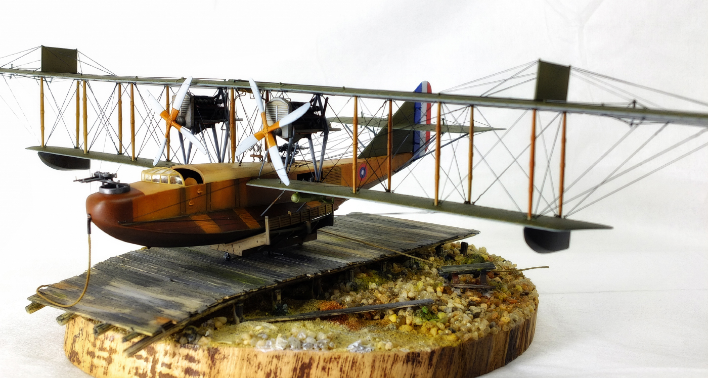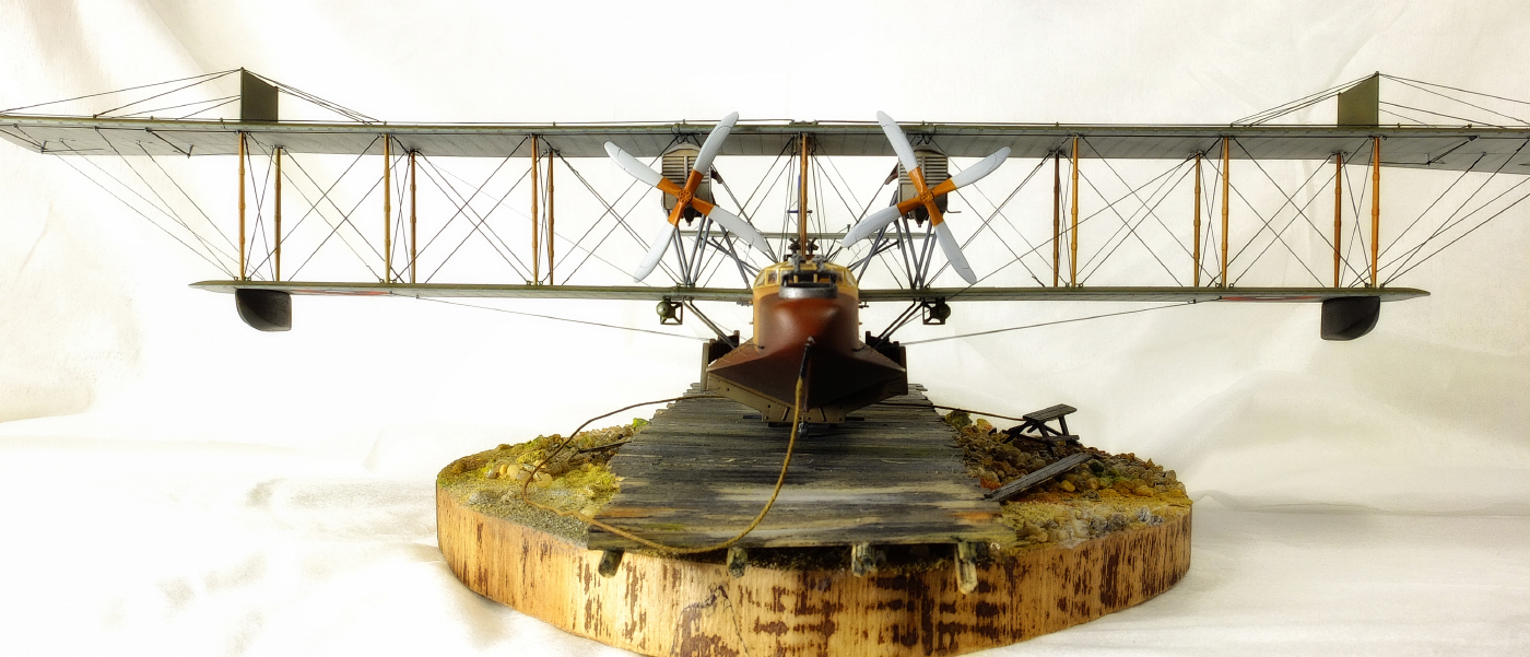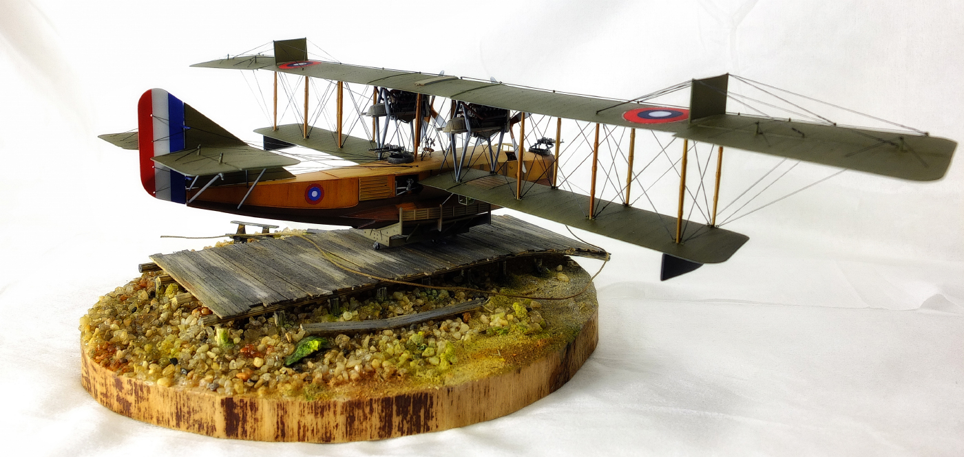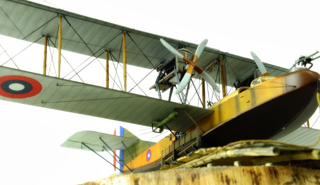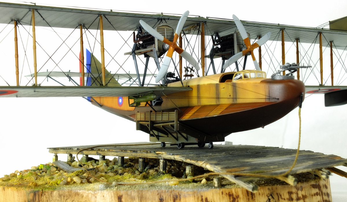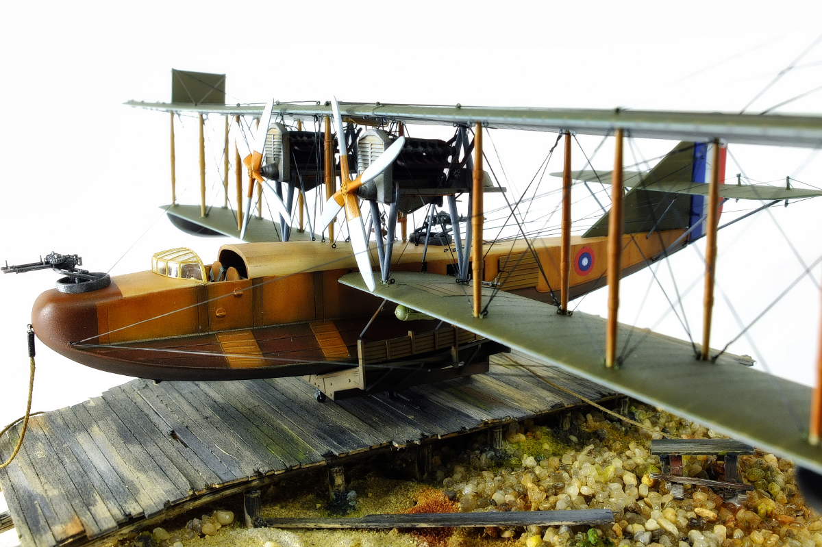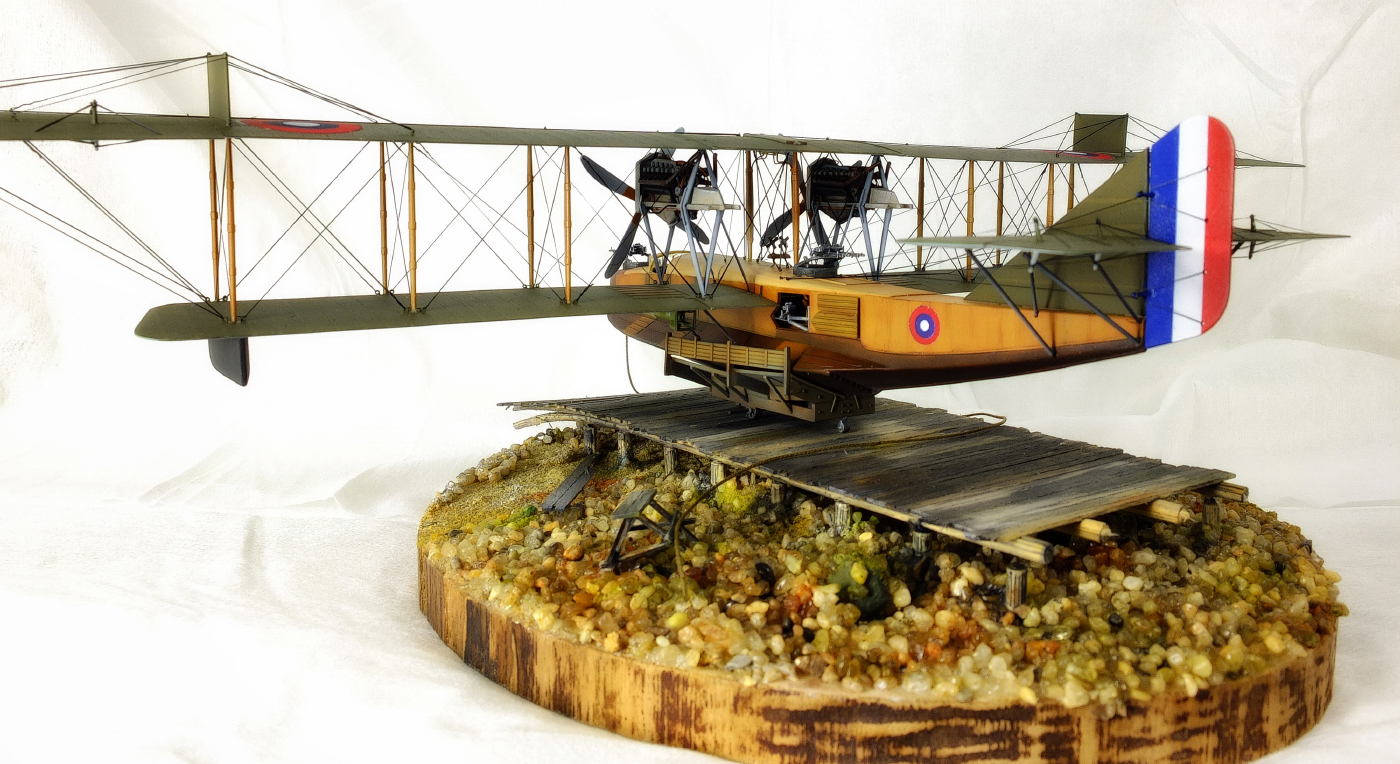 Набор украинской фирмы RODEN. Набор мне понравился. Облоя, утяжен и прочих дефектов литья нет. Стыкуемость деталей хорошая. Проработка деталей тоже на высоте. В плане сборки самолет не показался мне простым, хотя небольшой опыт сборки «швейных машинок» у меня имеется. Уж больно сложный кандибобер получался в процессе стройки. Бипланная коробка, даже расчаленная представляет собой весьма нежную конструкцию. Приходилось засверливать торцы крыльев, использовать иглы для более прочной стыковки. Да и очередность сборки не соответствовала инструкции. В процессе окраски не сильно придерживался наставлений, хотел вскрыть корпус художественным маслом, показать структуру фанеры, не знаю, насколько это мне удалось. Отдельно хочется остановиться на декалях. Легли легко, без проблем на глянцевую поверхность. Однако утром был неприятно удивлен тем, что края декалей приподнялись, появилось серебрение по краям. Кокарда с корпуса вообще при попытки довести ее до ума просто отклеилась от него. Ладно, раз так, думаю, уберу декали, сделаю трафареты, напылю кокарды и номера. Но не тут-то было. Номера с корпуса не хотели убираться полностью никак. Пришлось сошлифовывать всю свою имитацию фанеры и все рисовать заново. Крылья не стал трогать, наносить снова имитацию нервюр (зашивки нервюр), прешейдинг, не хватило на это духу, так и оставил серебрение на них, чуть уменьшив эффект нанесением матового лака. В остальном стройка шла как обычно, немного повозился с двигателями, по инструкции должны были быть Liberty, а на деле производитель положил Rolls-Royce Eagle IV. Пришлось изворачиваться. Сымитировал интерьер салона, хотя его довольно сложно рассмотреть на модели, обилие растяжек, тяг и прочего «такелажа» вызывает опасение лишний раз брать модель в руки. Растяжки были изготовлены из спандекса, продетые в 0,3 мм медные колечки, вклеенные в пластик, окраска - акриловые и масляные краски.