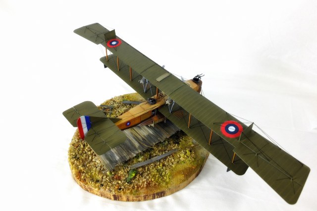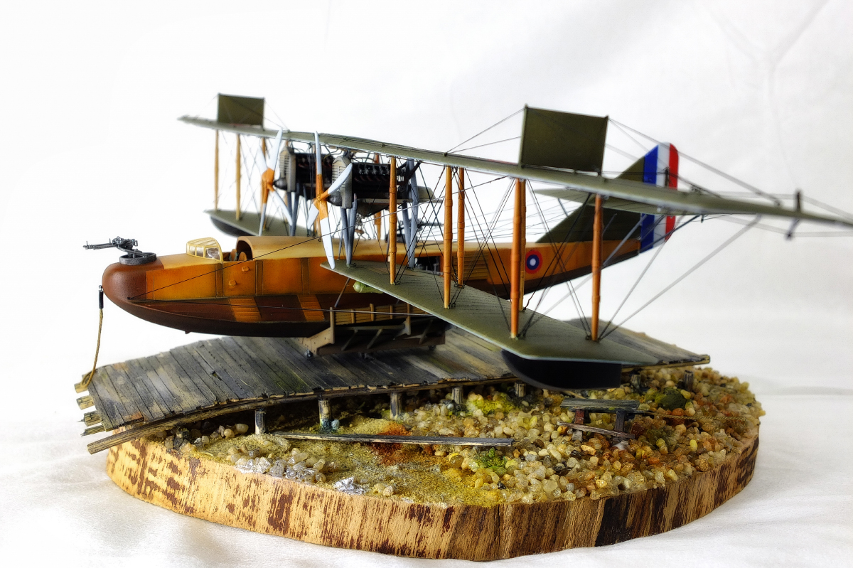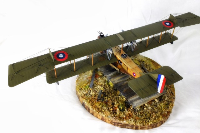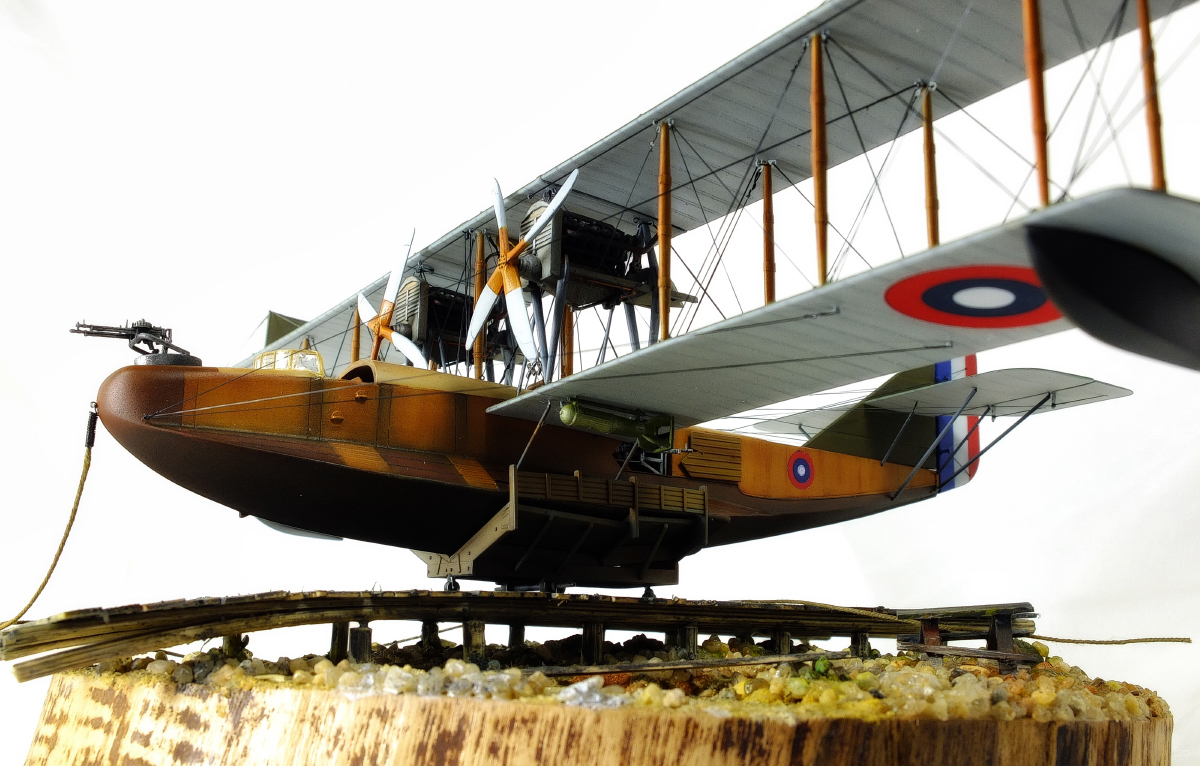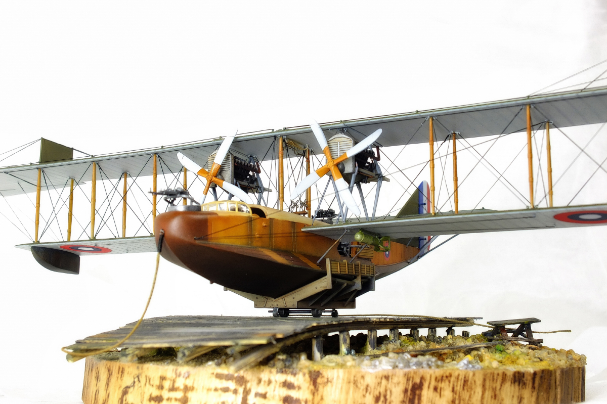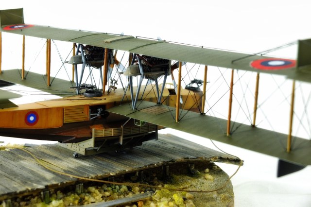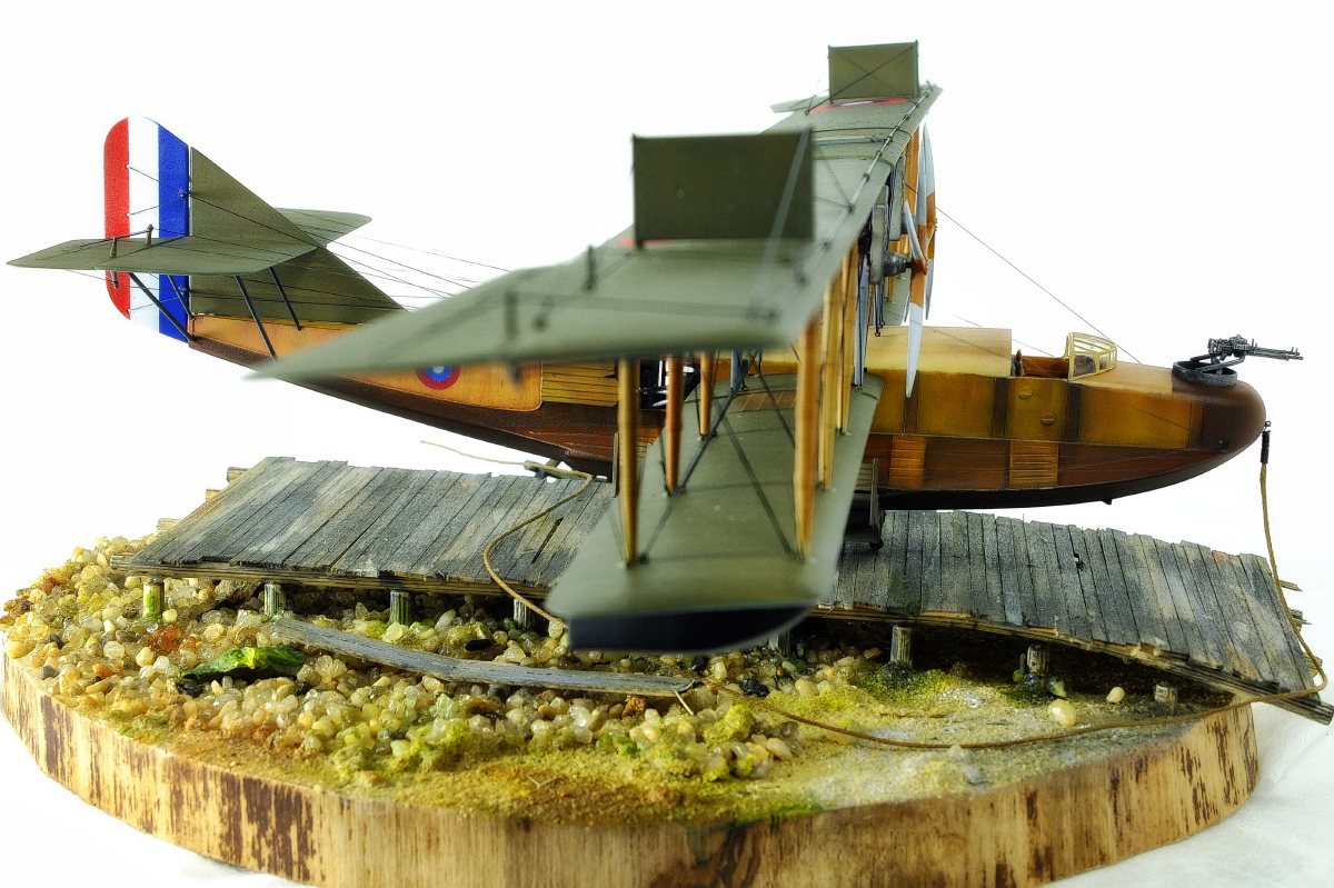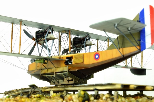Набор украинской фирмы RODEN. Набор мне понравился. Облоя, утяжен и прочих дефектов литья нет. Стыкуемость деталей хорошая. Проработка деталей тоже на высоте. В плане сборки самолет не показался мне простым, хотя небольшой опыт сборки «швейных машинок» у меня имеется. Уж больно сложный кандибобер получался в процессе стройки. Бипланная коробка, даже расчаленная представляет собой весьма нежную конструкцию. Приходилось засверливать торцы крыльев, использовать иглы для более прочной стыковки. Да и очередность сборки не соответствовала инструкции. В процессе окраски не сильно придерживался наставлений, хотел вскрыть корпус художественным маслом, показать структуру фанеры, не знаю, насколько это мне удалось. Отдельно хочется остановиться на декалях. Легли легко, без проблем на глянцевую поверхность. Однако утром был неприятно удивлен тем, что края декалей приподнялись, появилось серебрение по краям. Кокарда с корпуса вообще при попытки довести ее до ума просто отклеилась от него. Ладно, раз так, думаю, уберу декали, сделаю трафареты, напылю кокарды и номера. Но не тут-то было. Номера с корпуса не хотели убираться полностью никак. Пришлось сошлифовывать всю свою имитацию фанеры и все рисовать заново. Крылья не стал трогать, наносить снова имитацию нервюр (зашивки нервюр), прешейдинг, не хватило на это духу, так и оставил серебрение на них, чуть уменьшив эффект нанесением матового лака. В остальном стройка шла как обычно, немного повозился с двигателями, по инструкции должны были быть Liberty, а на деле производитель положил Rolls-Royce Eagle IV. Пришлось изворачиваться. Сымитировал интерьер салона, хотя его довольно сложно рассмотреть на модели, обилие растяжек, тяг и прочего «такелажа» вызывает опасение лишний раз брать модель в руки. Растяжки были изготовлены из спандекса, продетые в 0,3 мм медные колечки, вклеенные в пластик, окраска - акриловые и масляные краски.