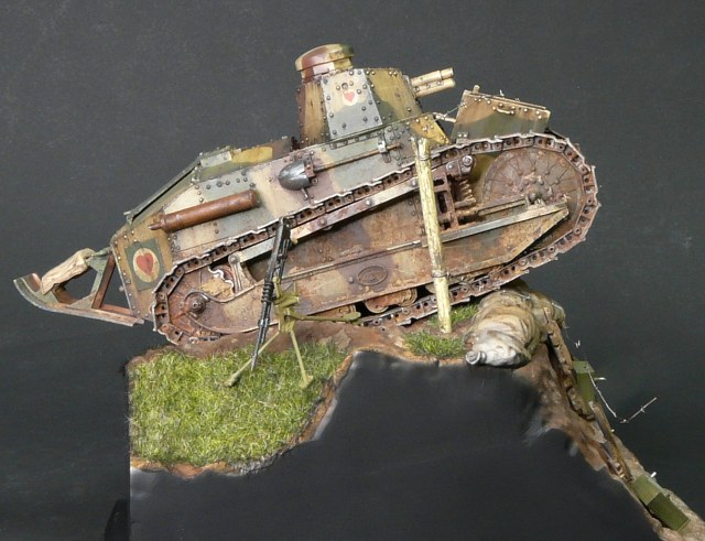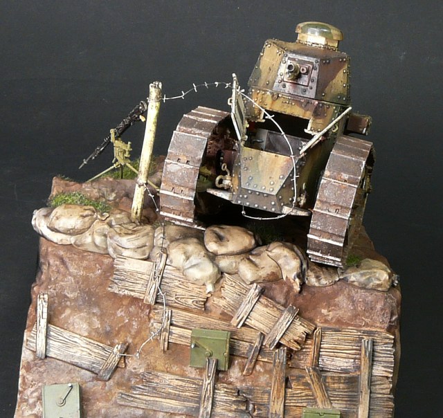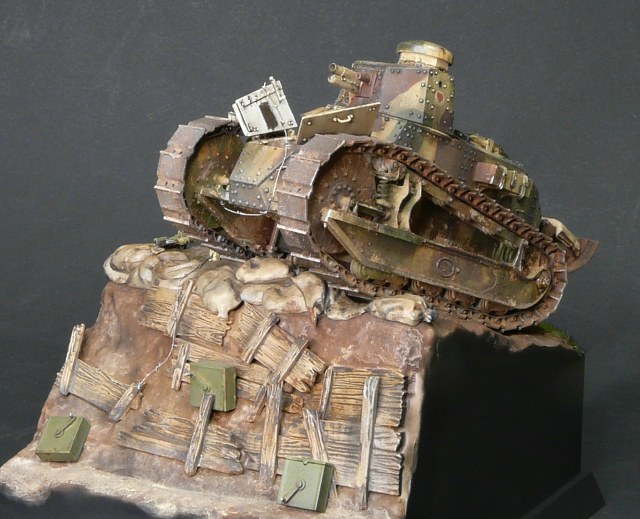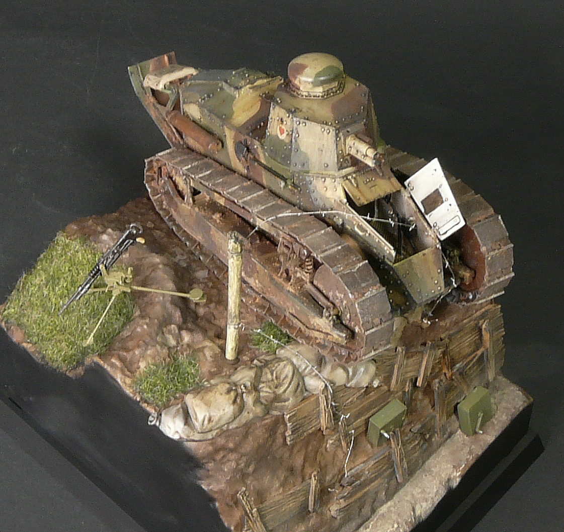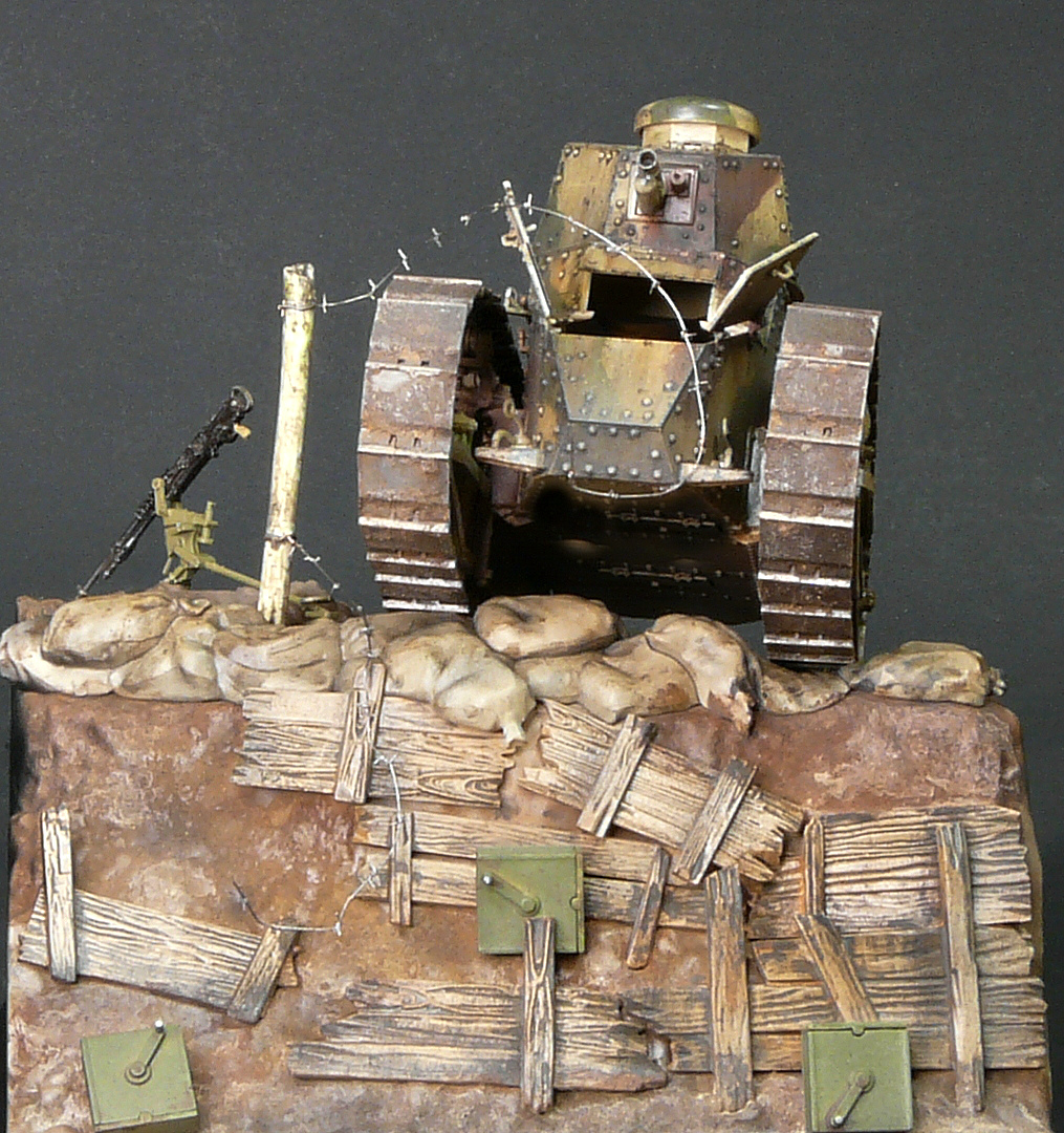 Отличная работа. А из придиризмов - неясно, почему рядом с явно замершим у бошевской траншеи наступающим танком - станковый пулемёт Гочкисс. Логичнее было бы немецкий пулемёт поставить и немецкие патронные ящики. Тогда лучше "сыграл" бы антураж.