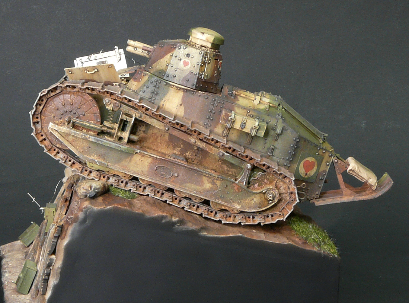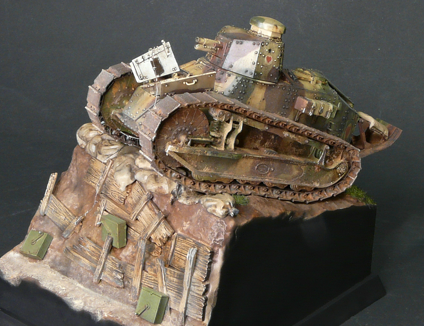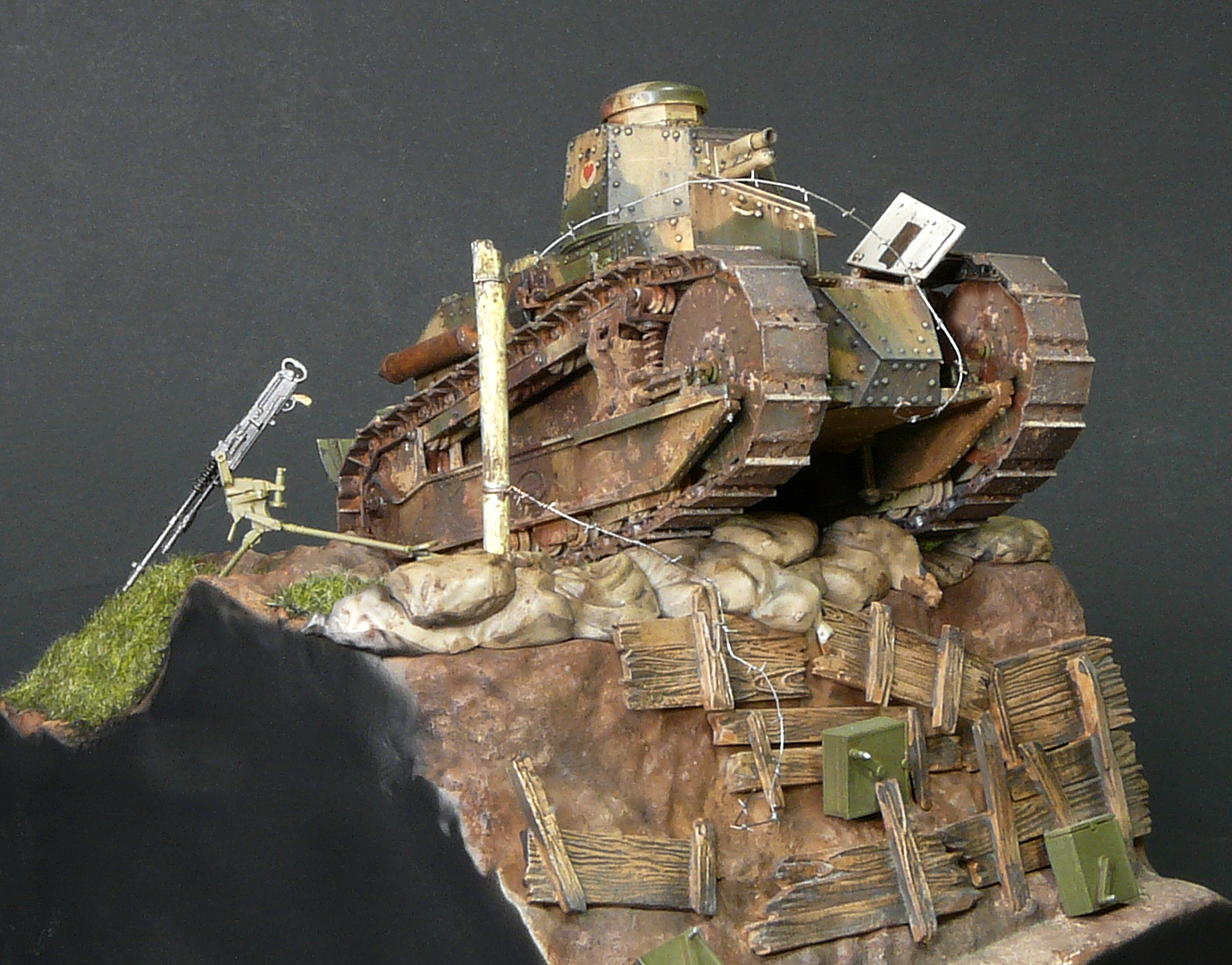 Отличная работа. А из придиризмов - неясно, почему рядом с явно замершим у бошевской траншеи наступающим танком - станковый пулемёт Гочкисс. Логичнее было бы немецкий пулемёт поставить и немецкие патронные ящики. Тогда лучше "сыграл" бы антураж.
