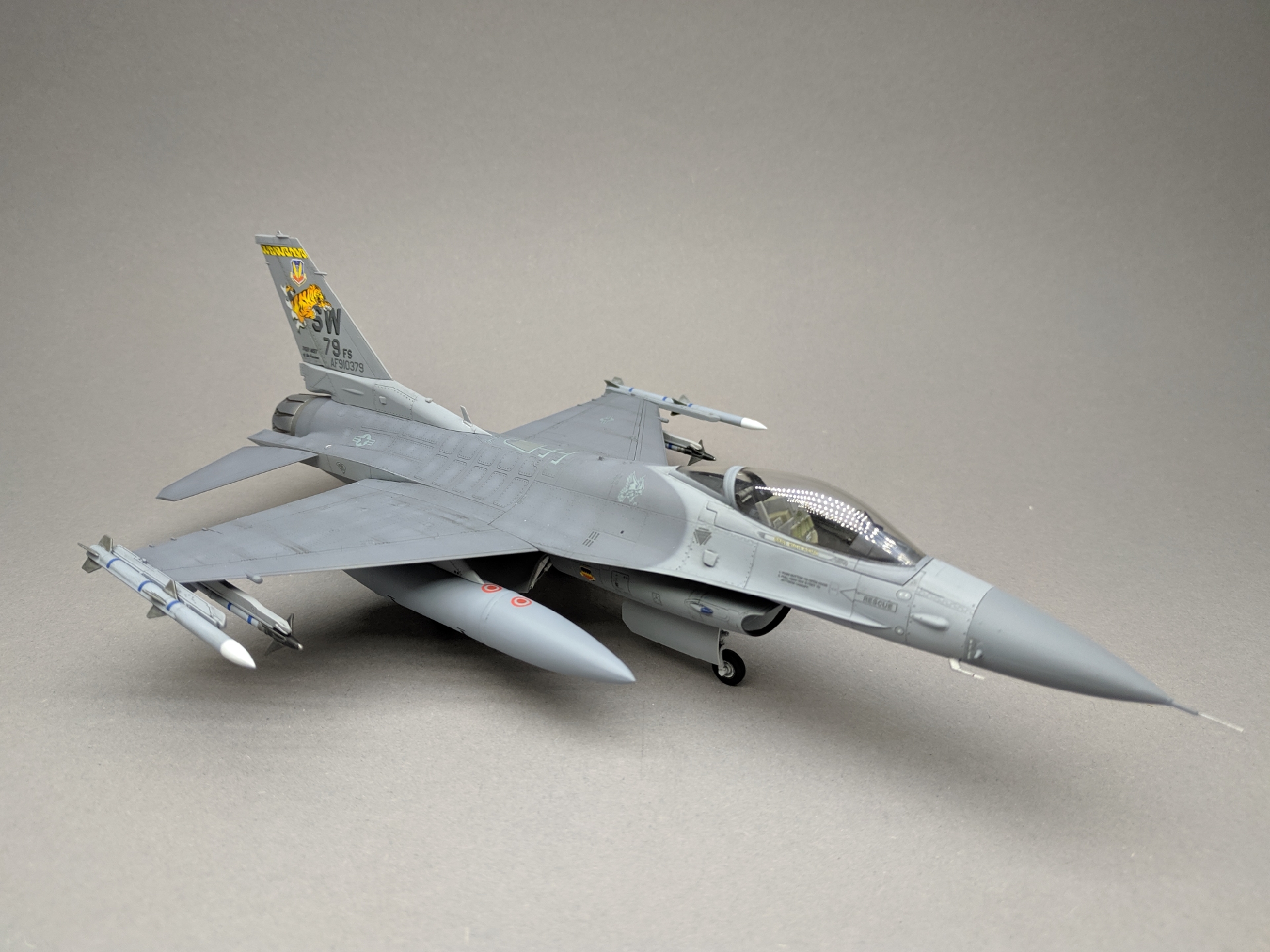 Здравствуйте. Данную модель приобрел по случаю с большой скидкой. На мой взгляд - лучшая модель f-16 в 72 масштабе. Однако есть ложка дёгтя - моя это ,,лайт версия''. В ней отсутствуют топливные баки и пилоны для ракет. На выбор есть ракетное вооружение, крепить которое предполагается на законцовках крыльев. Декали даны на боевые ракеты, однако представленный вариант носил только учебные. Есть пилоны для топливных баков. В итоге баки изготовил из оставшихся от Хасиного f-18. Пилоны для aim-9 тоже от него. К слову ,,фулл версия'' стоит на 1000 деревянных дороже.