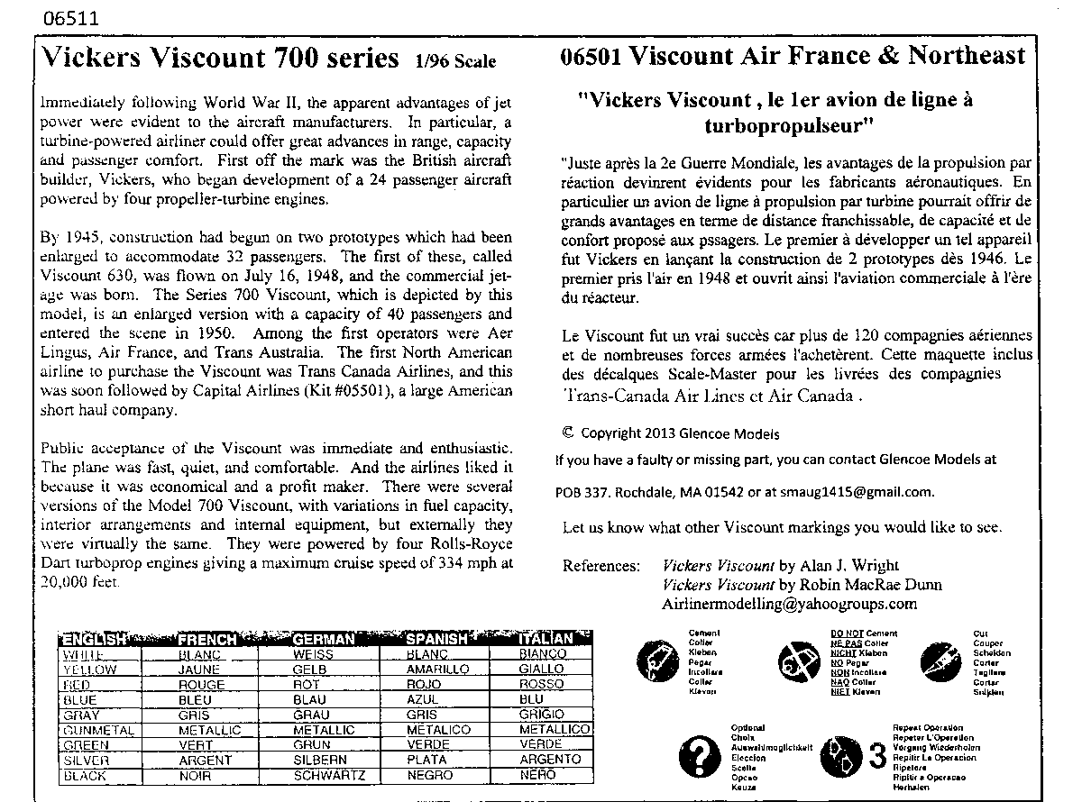 Всем доброго дня или вечера. Показываю обзор на очередную модель в стиле «ретро» - Vickers Viscount в масштабе 1/96. Сама модель разработана штатовской фирмой Hawk в 1956 году (замечу в скобках, что именно Hawk выпустила самую первую в мире сборную модель из полистирола). С 1989 года и по настоящее время модель выпускается штатовской же фирмой Glencoe Models в трех исполнениях, отличающихся декалями (Capital Airlines, Air France + Northeast Airlines, Air Canada + TCA). Модель простенькая и вполне соответствует 50-м годам, весьма напоминает тогдашний Frog (который, кстати, в 1957 году тоже выпустил модель этого же самого самолета и в том же самом масштабе, только в Союз она не попала и является раритетом). Крой наружный, довольно аккуратный. Внутренность полностью отсутствует, при этом входные двери даны отдельными деталями, в наборе имеются трап и фигурки людей. Качество литья так себе, половинки крыльев изрядно покороблены, утешает только, что верхние и нижние половинки покороблены навстречу друг другу, так что при склейке они, возможно, выправятся. Присутствует облой. Декаль хорошего качества, в моем наборе на два канадских варианта. Инструкция вполне понятная. Имеется также рекламка некоего издательства. Все упаковано в прочную коробку из толстого гофрокартона, с верхней загрузкой. В заключение могу сказать, что моделей этого весьма популярного лайнера в разное время и в разных масштабах было выпущено так примерно с десяток, но большинство из них в настоящее время малодоступны. Самая доступная в настоящее время – от ВЭ в 1/144. Правда, цена у нее...