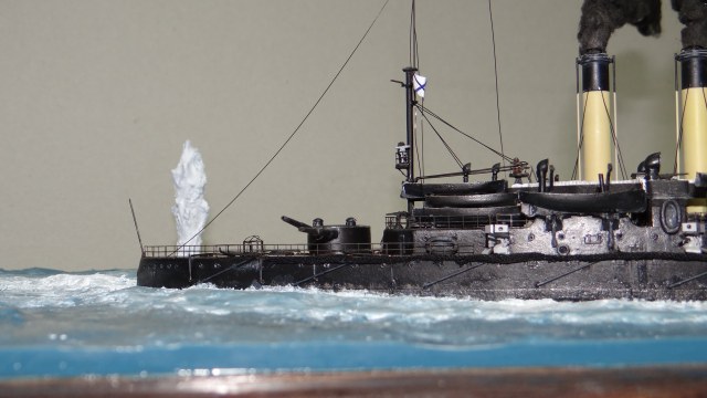 Диорама - Последний бой броненосца береговой обороны "Адмирал Ушаков" 15 мая 1905г - на следующий день после Цусимского сражения. Корабль навел свои пушки на противника и видны всплески от японских пристрелочных выстрелов.