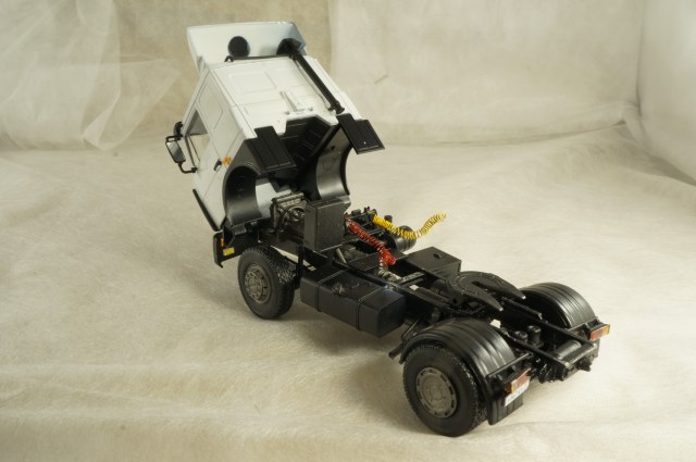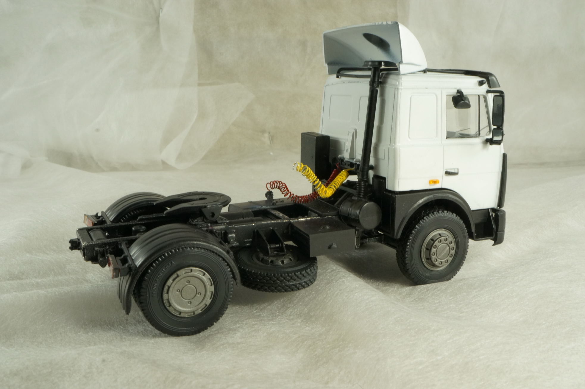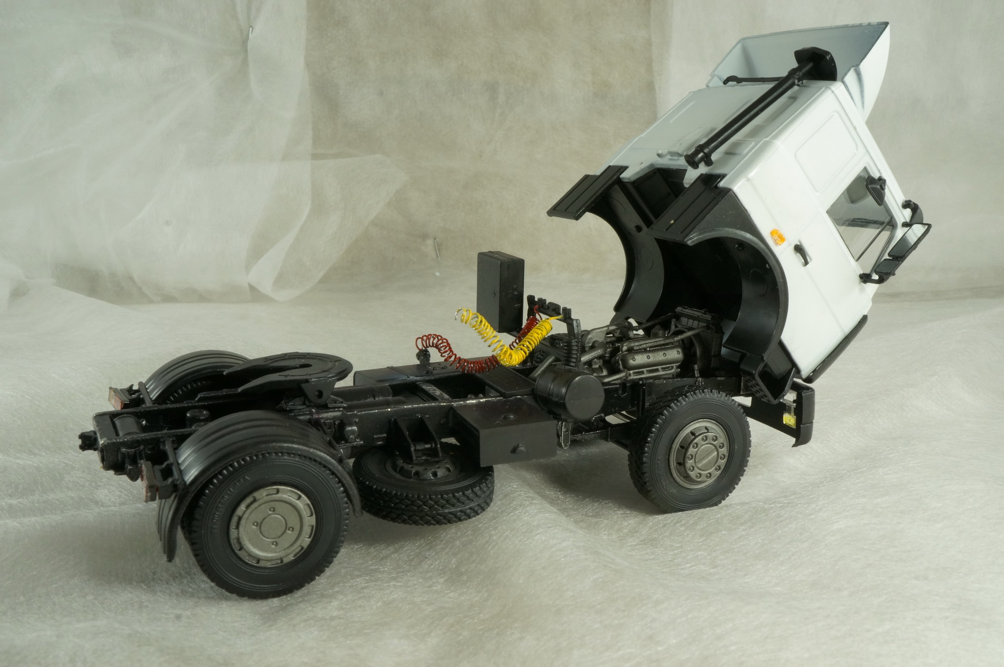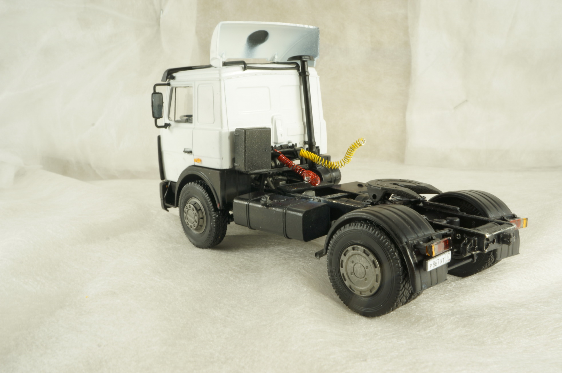 Что касается данного конкретного набора. Сборка из коробки. В наборе идут дворники фототравлением. В целом впечатления приятные, для себя лично понял что масштаб 1/43 для меня мелковат. По сборке есть пара недочетов: выемка на коробке передач не совпадает с перекладиной на раме тягача, пришлось выпиливать и немало, фото этого места постарался сделать покрупнее. Задняя ось прицепа тоже не очень гладко собирается, пришлось укорачивать рычаги.