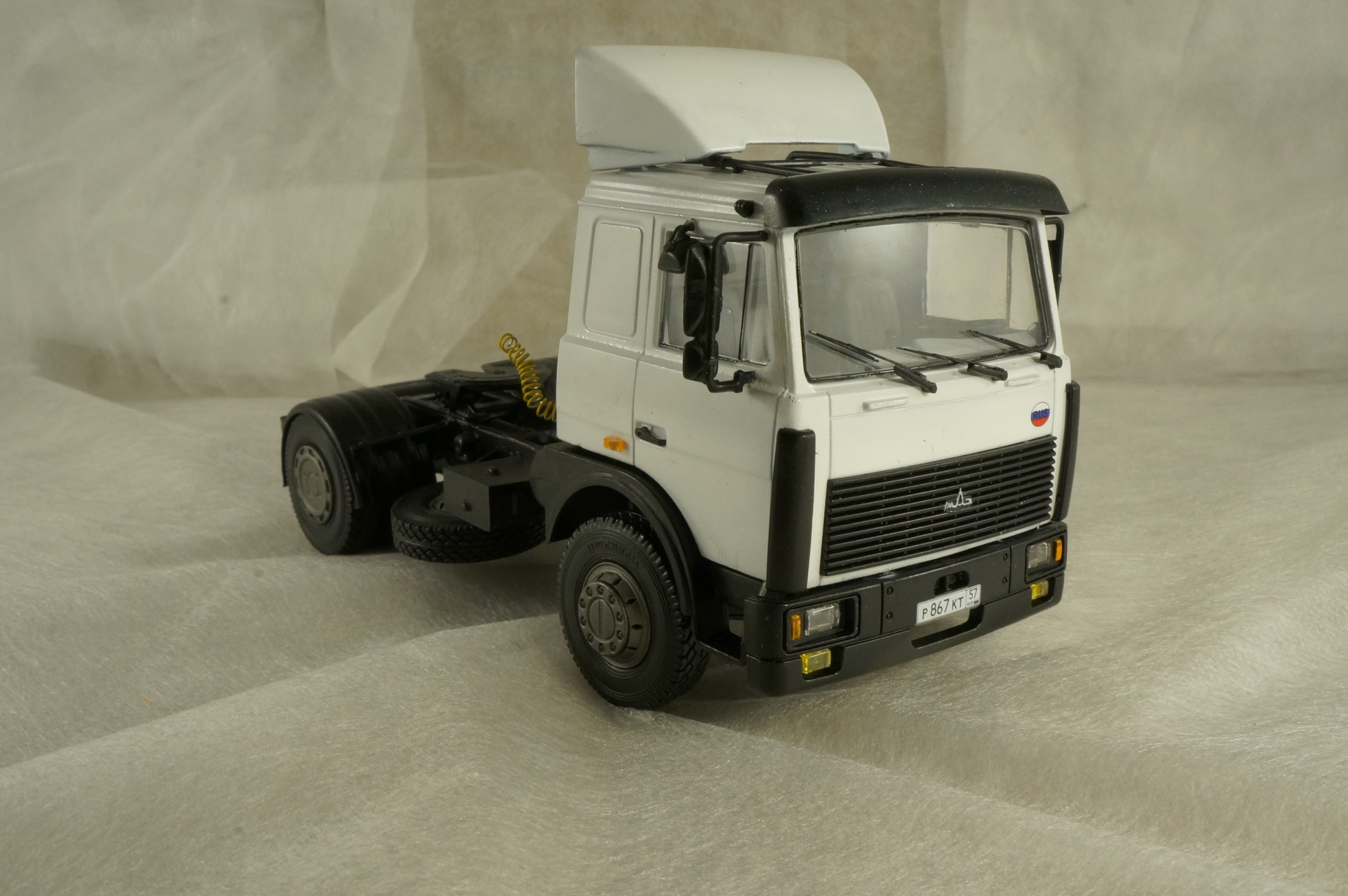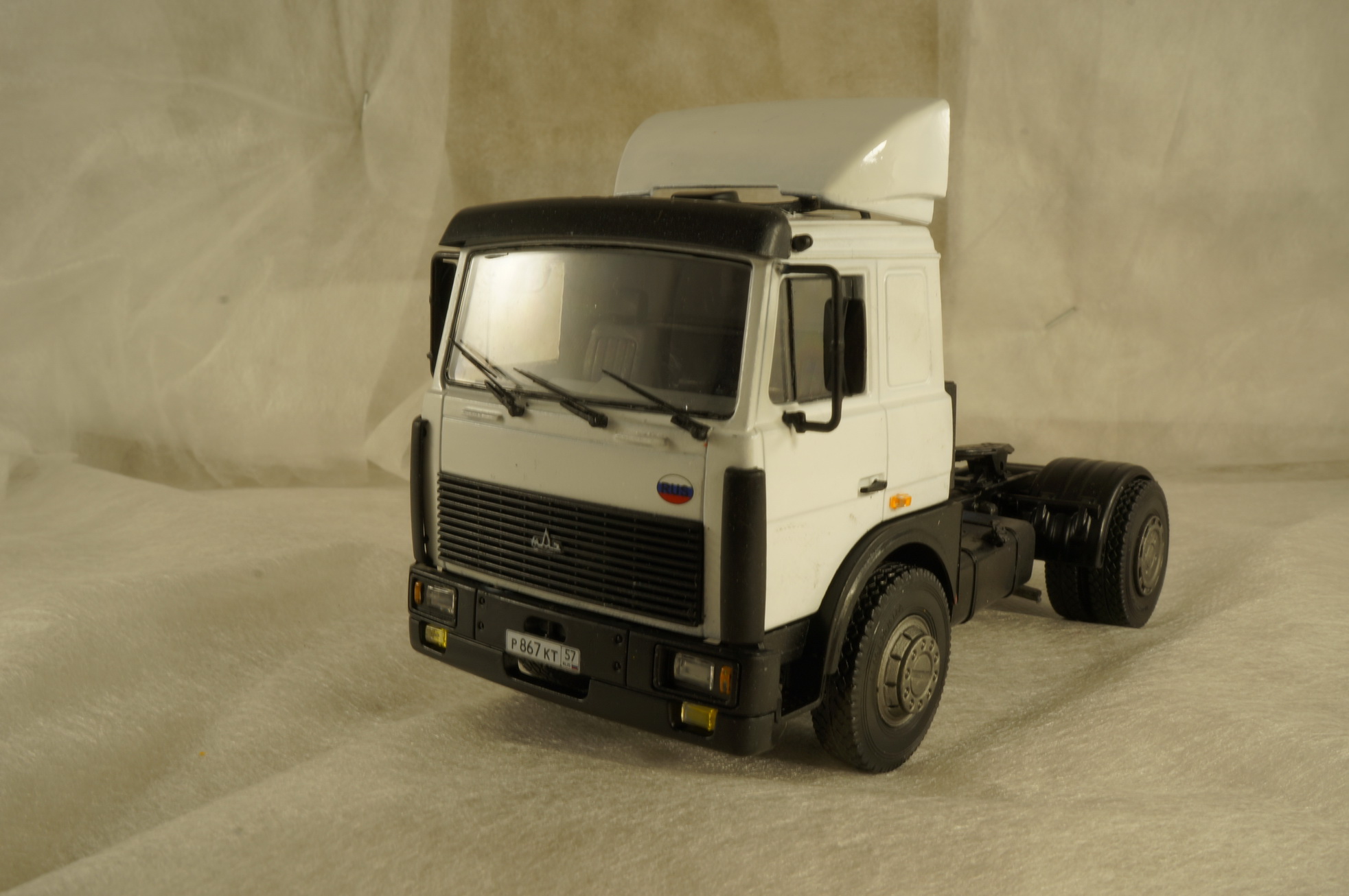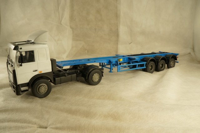 Прошу принять модель МАЗ-5432 с прицепом-контейнеровозом МАЗ-938920. Техническое описание находится легко, нового добавить нечего не смогу. От себя могу добавить следующее: когда-то один из самых распространенных вариантов для транспортировки контейнеров по суше. При слове "тягач-контейнеровоз" немедленно всплывал образ либо КАМАЗа морковной расцветки, либо такого МАЗа. Сейчас их количество конечно поубавилось, но все же не редкость. По отзывам водителей МАЗ любят за низкооборотистый, но тяговитый движок, который не нужно "крутить" (в отличие от КАМАЗа) чтобы машина ехала.