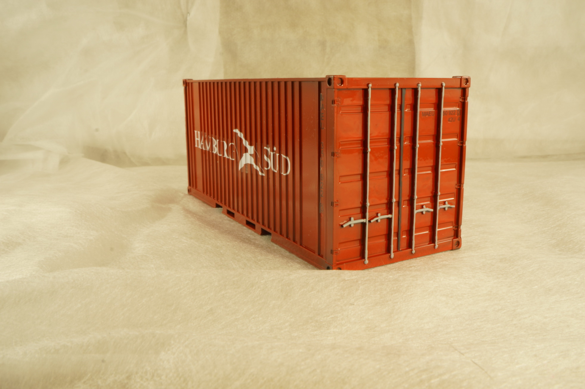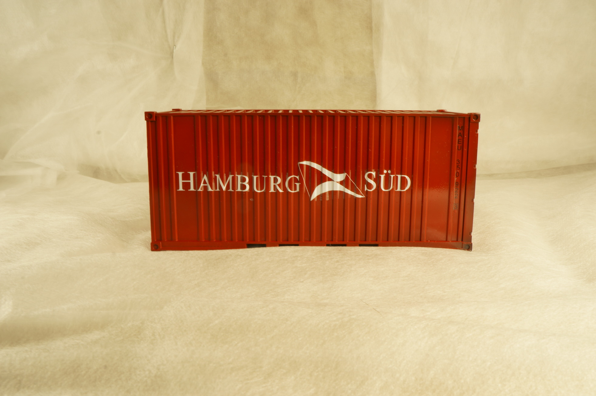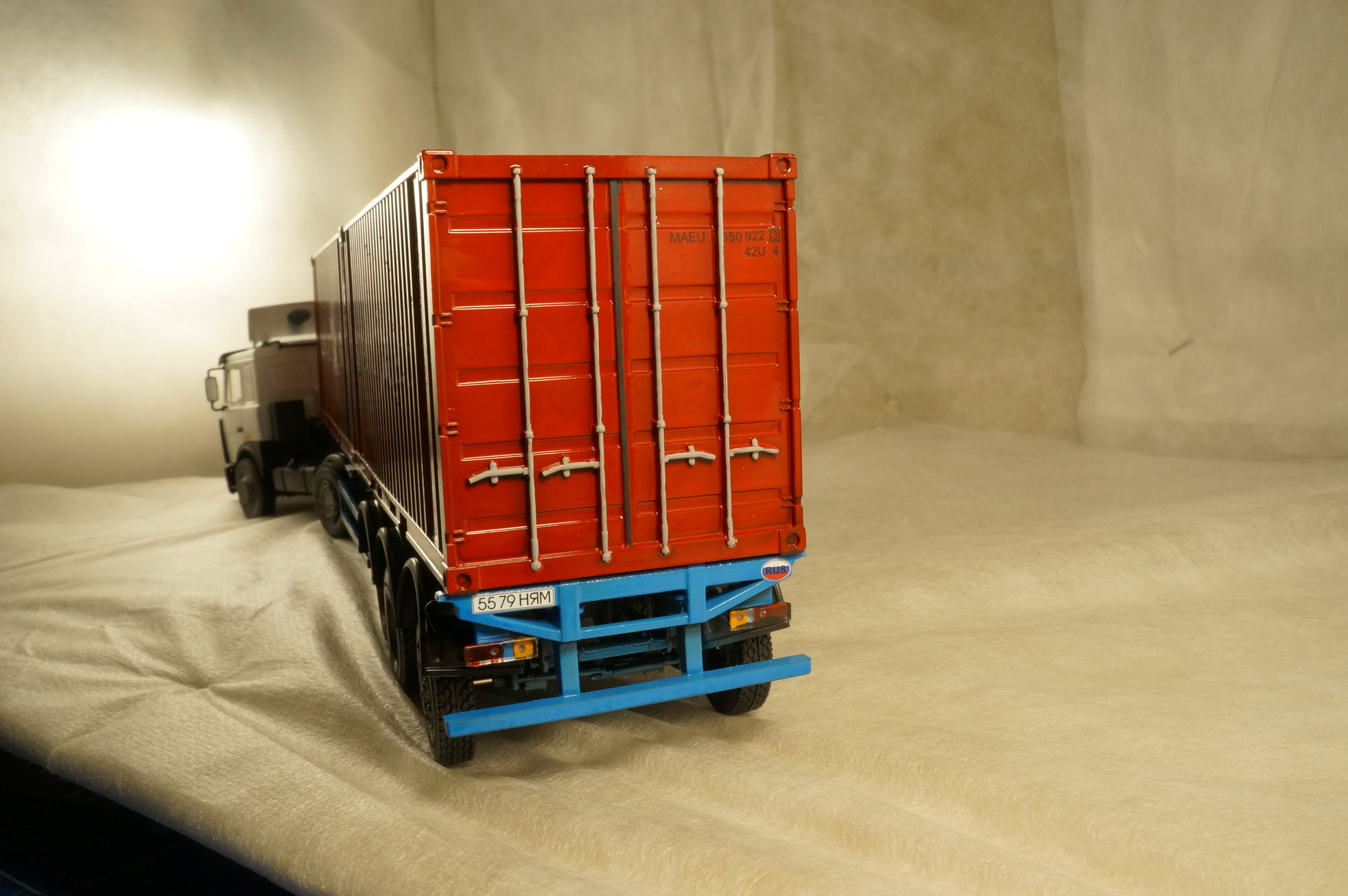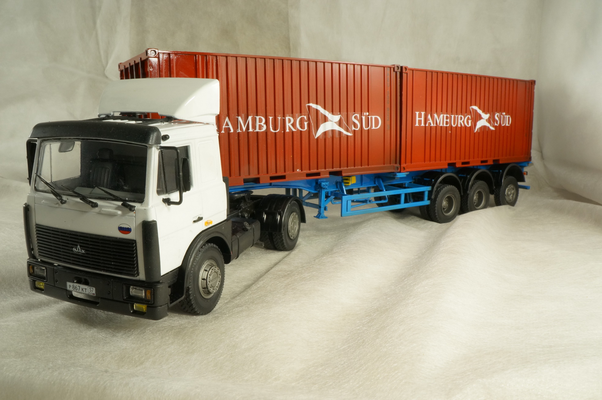 Декали для контейнера немного неверны. Номера контейнера которые идут в наборе - не этой линии (MAEU это Маерск, серые контейнера), у этой линии должны быть SUDU. Кроме этого именно у этой линии номера контейнеров располагаются на белом фоне (белый прямоугольник, поверх него черные цифры), в целом два двадцатифутовых контейнера на одном прицепе говорят о том что либо это порожняк, либо ввезут плитку, но в таком случае идет дикий перевес (под 50 тонн) и МАЗ такое просто не потянет.