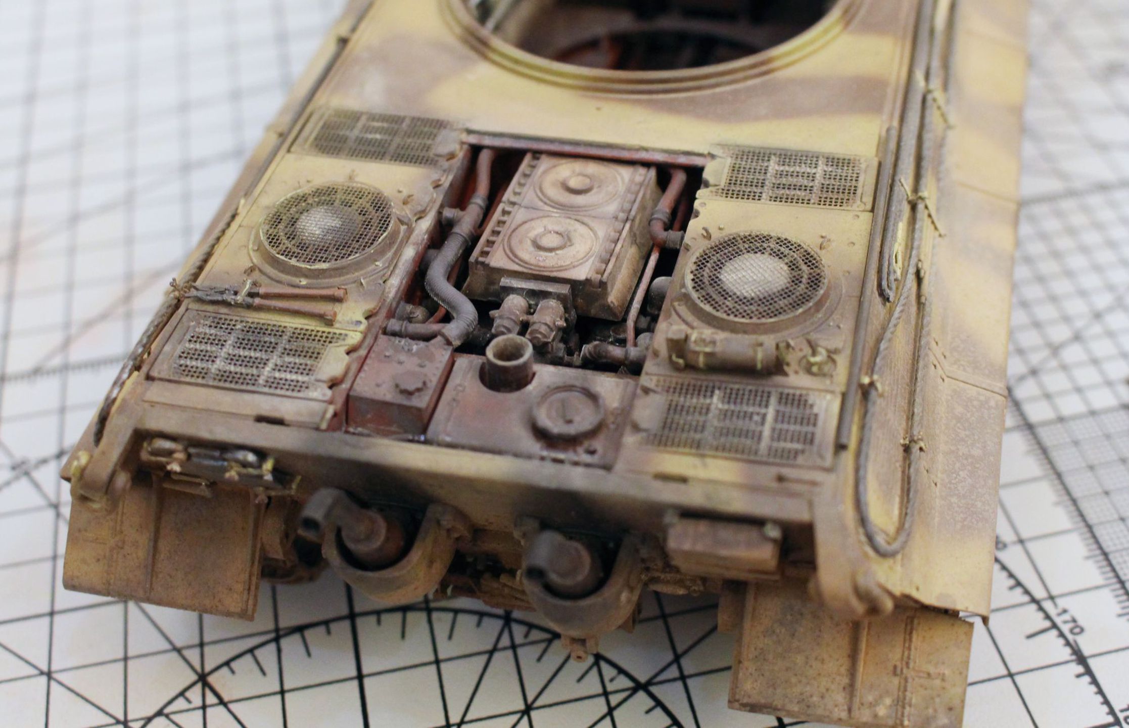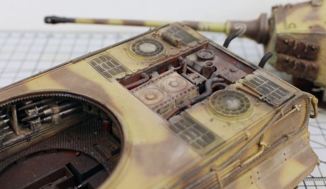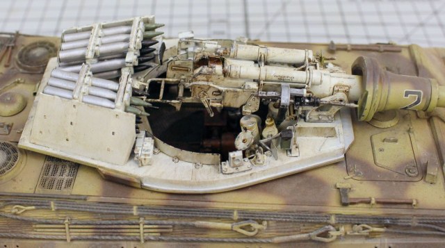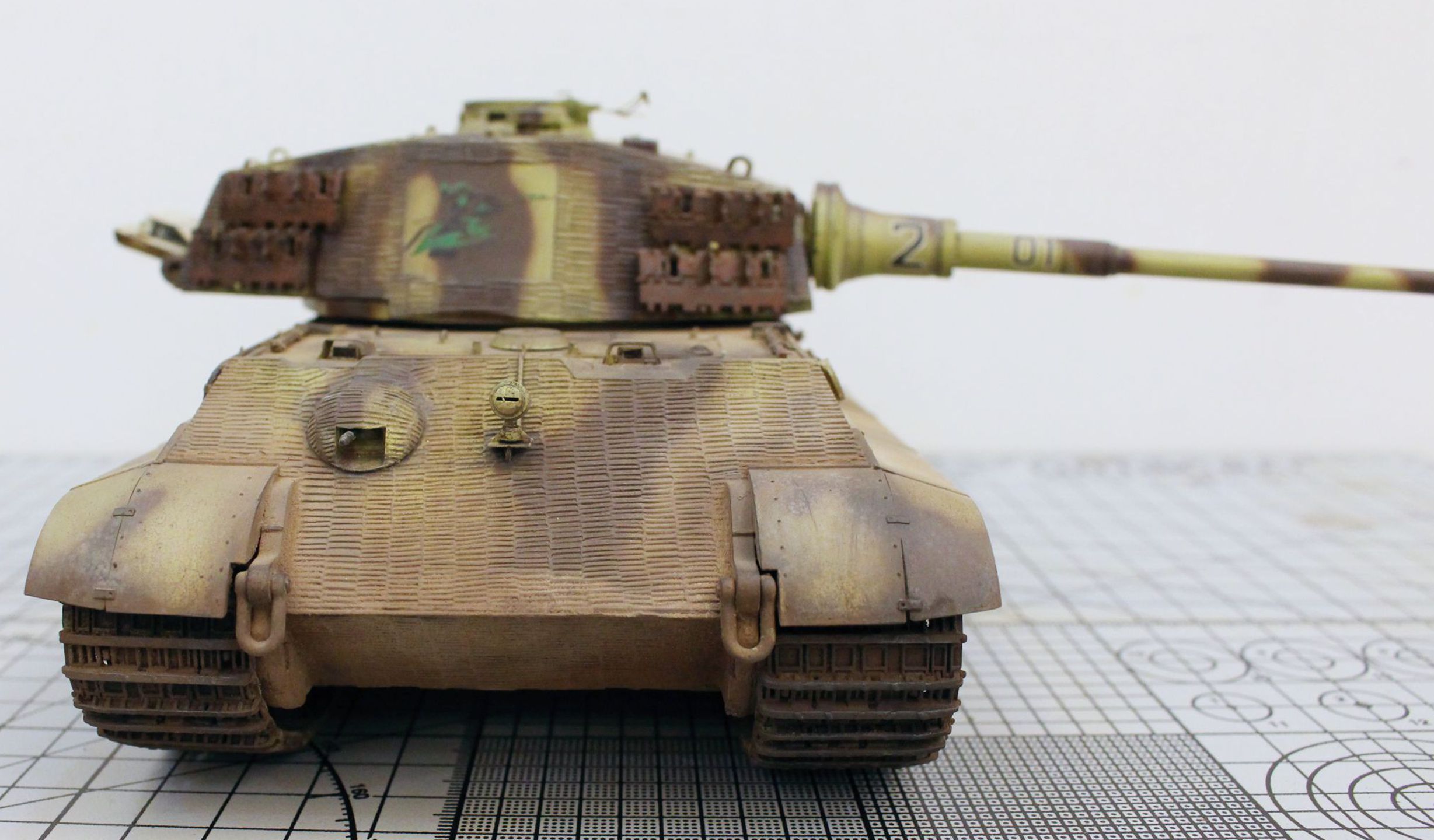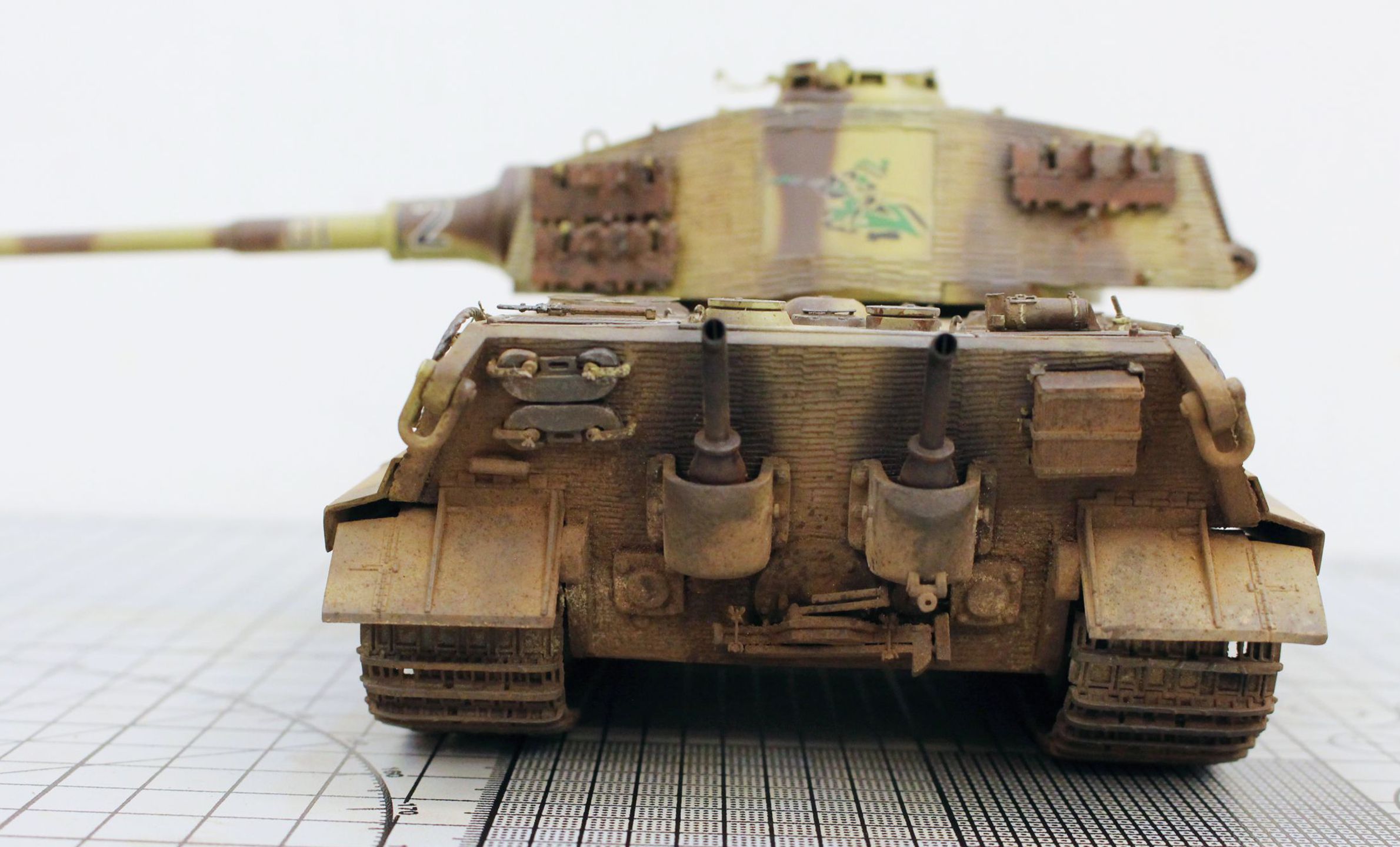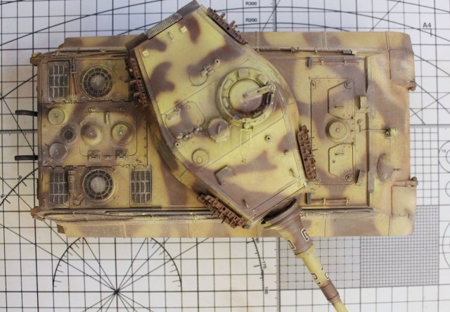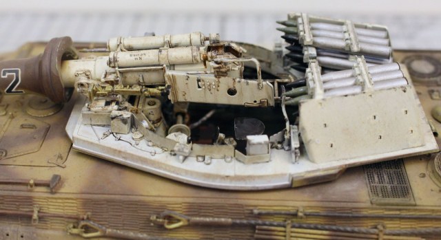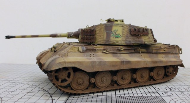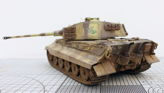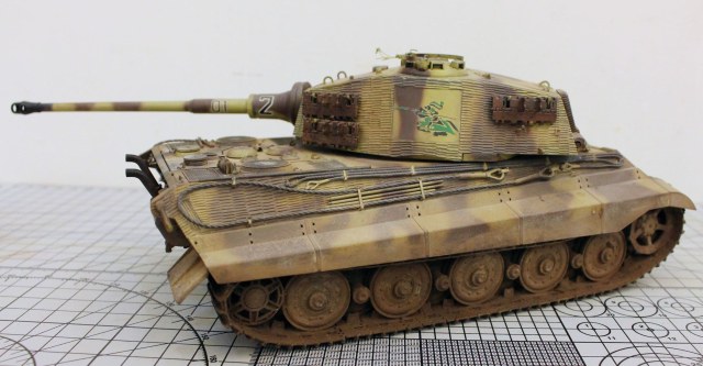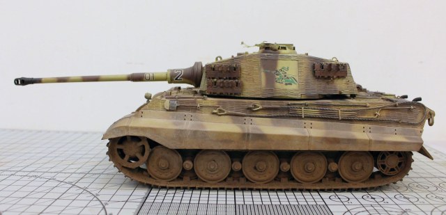 Корпус модели и башенная коробка покрыты циммеритом «из коробки». Определенные вопросы вызвало циммеритное покрытие башенной коробки. В соответствии с архивными фото, на бортах башен всех машин 505-го тяжелого танкового батальона, оставляли квадратные зоны без покрытия, куда наносилась эмблема батальона «Скачущий рыцарь с копьем». Это подтверждено многими фотографиями из архивных съемок машин этого батальона, при этом все фото приводятся на период, когда батальон был оснащен танками модели Pz. Kpfw. VI Tiger I. Производитель по умолчанию отобразил это и на модель «Королевского Тигра». Каких-либо архивных снимков, подтверждающих или опровергающих этот факт для машин Tiger II, найдено не было. Поэтому я решил оставить вариант циммеритного покрытия так, как предложил сам производитель.