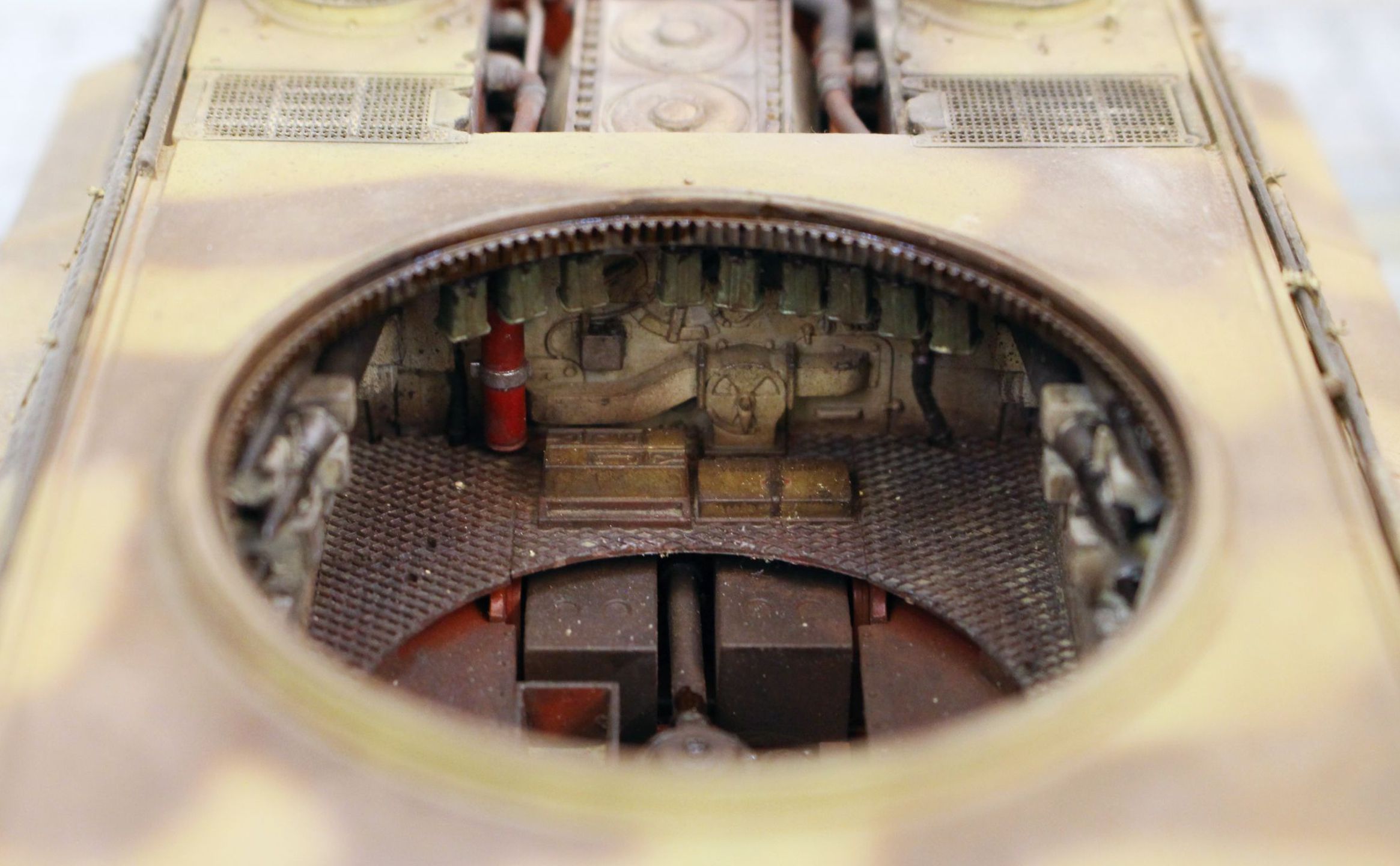 Сама модель исполнена с интерьером. Изначально, я планировал сделать модель разъемной и не склеивать верхнюю броне-коробку с ванной корпуса. Но в ходе работы выяснилось, что верхняя часть корпуса имеет производственный дефект, чрезмерную выгнутость и при соединении с ванной образует не просто щели, а вообще полная не стыковка по геометрии. Является ли этот дефект массовым или просто мне так попалось я не знаю. В итоге, ванну корпуса и верхнюю коробку пришлось склеить и скрыть большую часть интерьера под броней. Для доступа к интерьеру и двигателю оставил не вклеенным съемный верхний броне-лист для демонтажа трансмиссии, и верхний броне-лист над моторным отделением. Ну и конечно остался смотровой вид через погон башни.