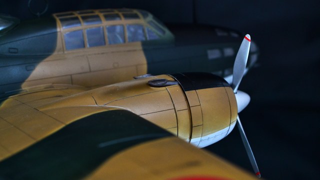 К сборке вопросов нет, а вот к покраске таки есть- масса непрокрасов по границе коричневого и зеленого; для японца ни одного скола до металла- не верю, такое ощущение, что они уже с завода ободранные выходили; слишком чистый, даже при сходе с конвейера практически любой самолет имеет хоть минимальный, но разнотон по панелям (тем более, что у японцев качество краски всегда было не очень)