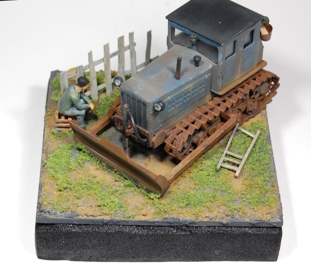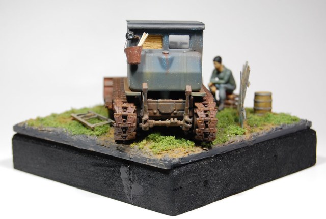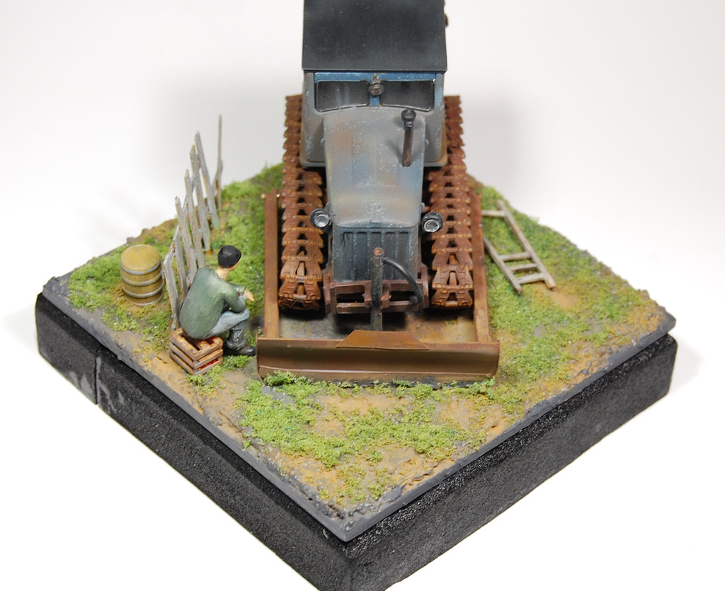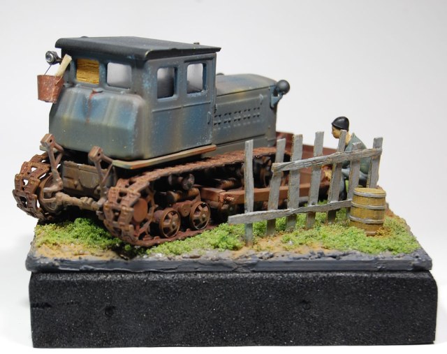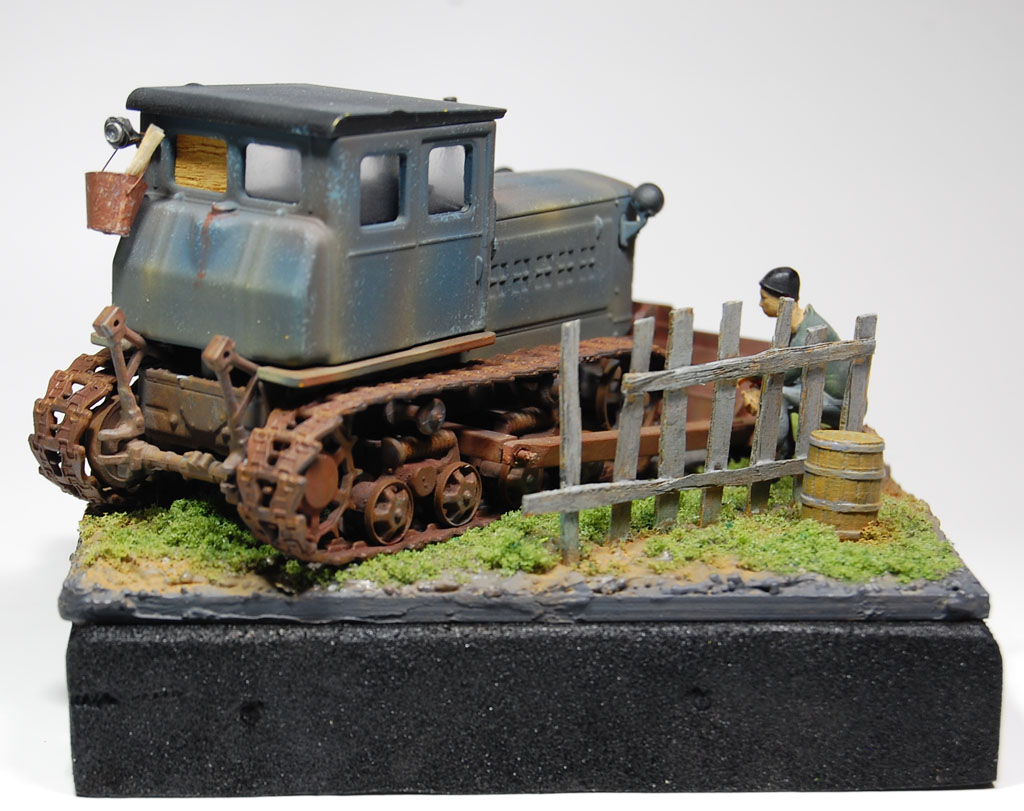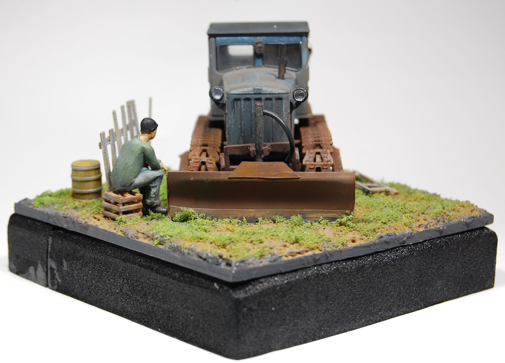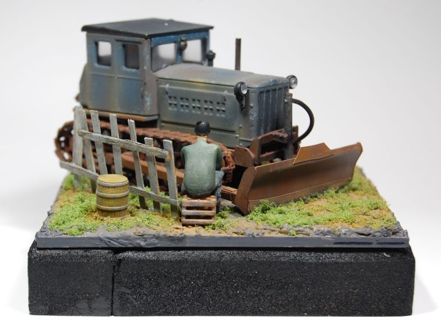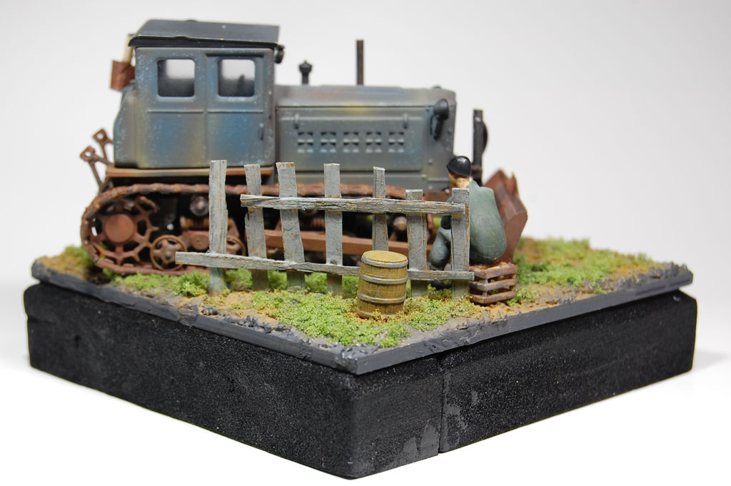 Используемые материалы;подставка-пенополистирол+имитация земли из шпатлевки по дереву и песка,трава-Morrison,забор-шпон,бочка-АВД,фигурка распечатана на 3Д принтере,отвал-доширак пластик и тамия,ведро скручено из фольги.Вот вроде и все!)