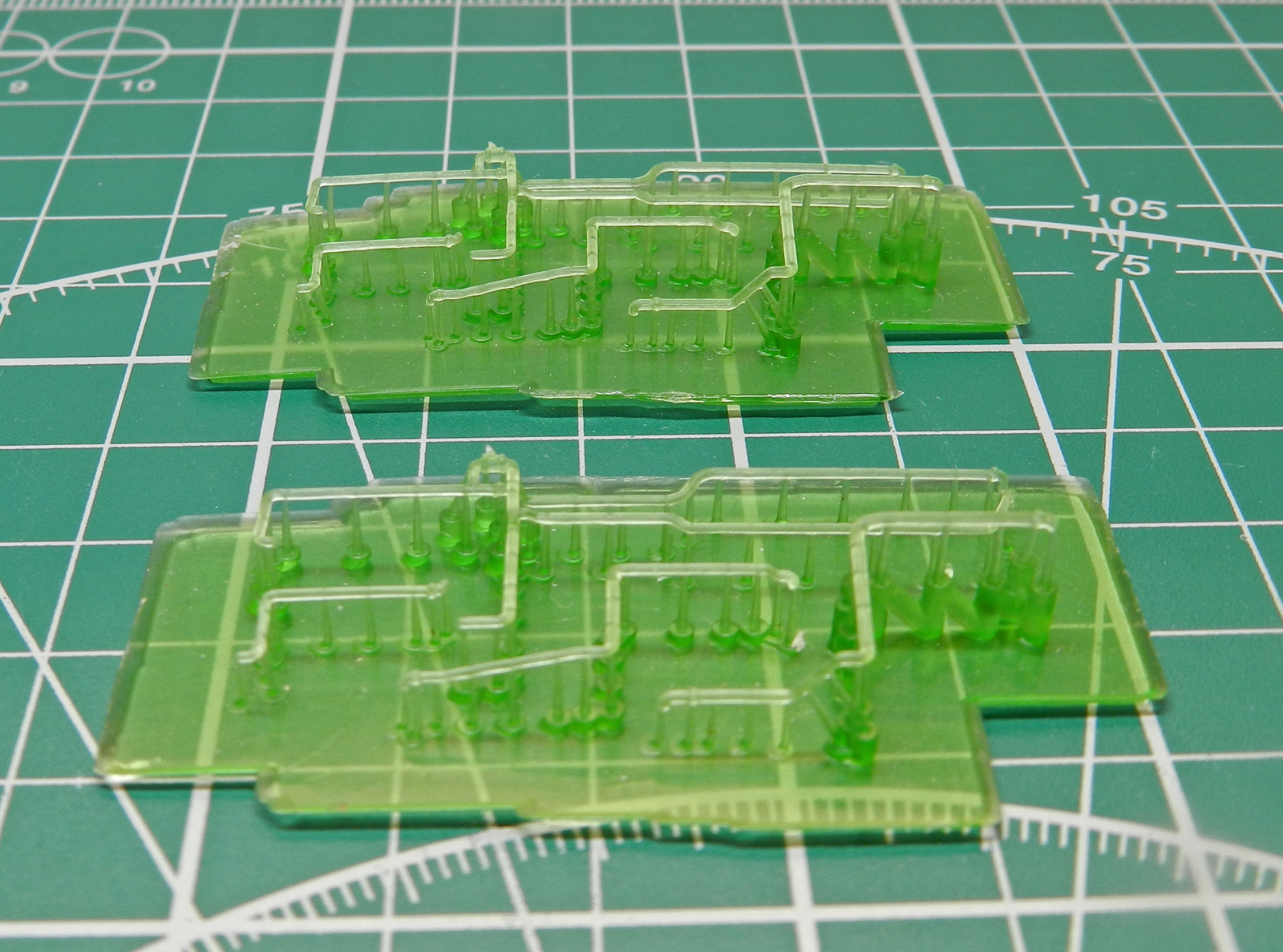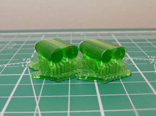 Решение давать мелкие детали в тираже из фотополимера - весьма спорное. Фотополимер очень хрупок, снятие деталей из него с линий поддержки и обработка требует определенных навыков. Чаще всего линия поддержки норовит обломиться так, что "выгрызает" маленькую лунку на поверхности детали. Проще всего эти дефекты лечатся заделкой смеси циакрина с содой.