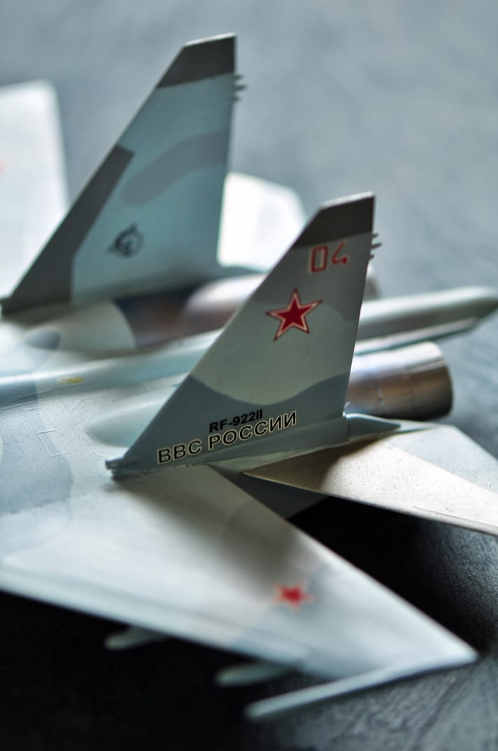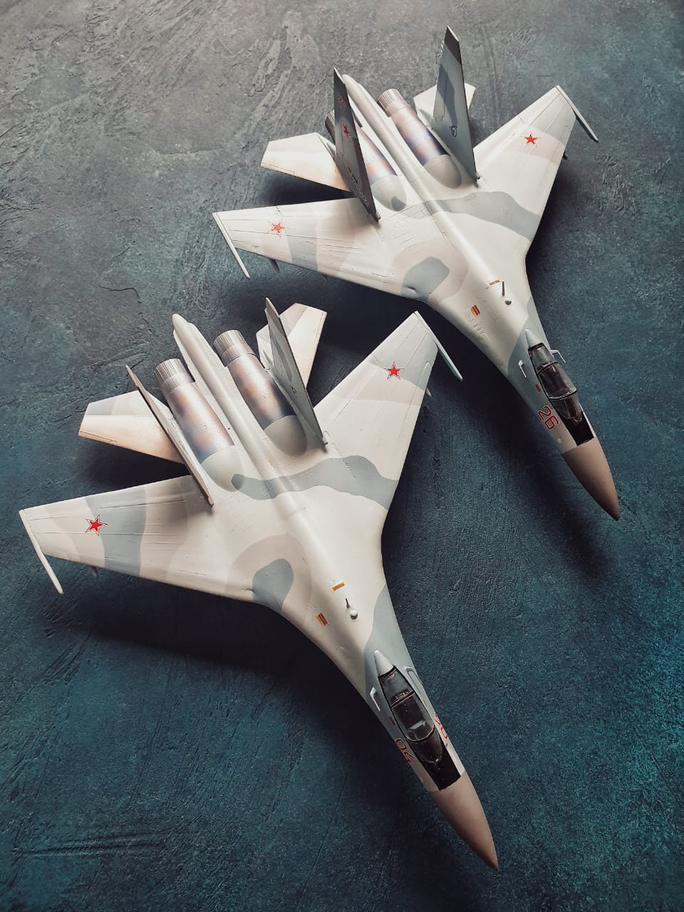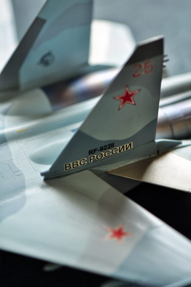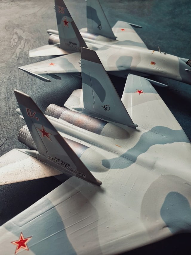 Су-35 от Звезды. Выполнены в полетной конфигурации. Срезаны ПГО. За копийностью не гнался, нужен был только образ для "пешего по летному". Окрашивал Аканом.