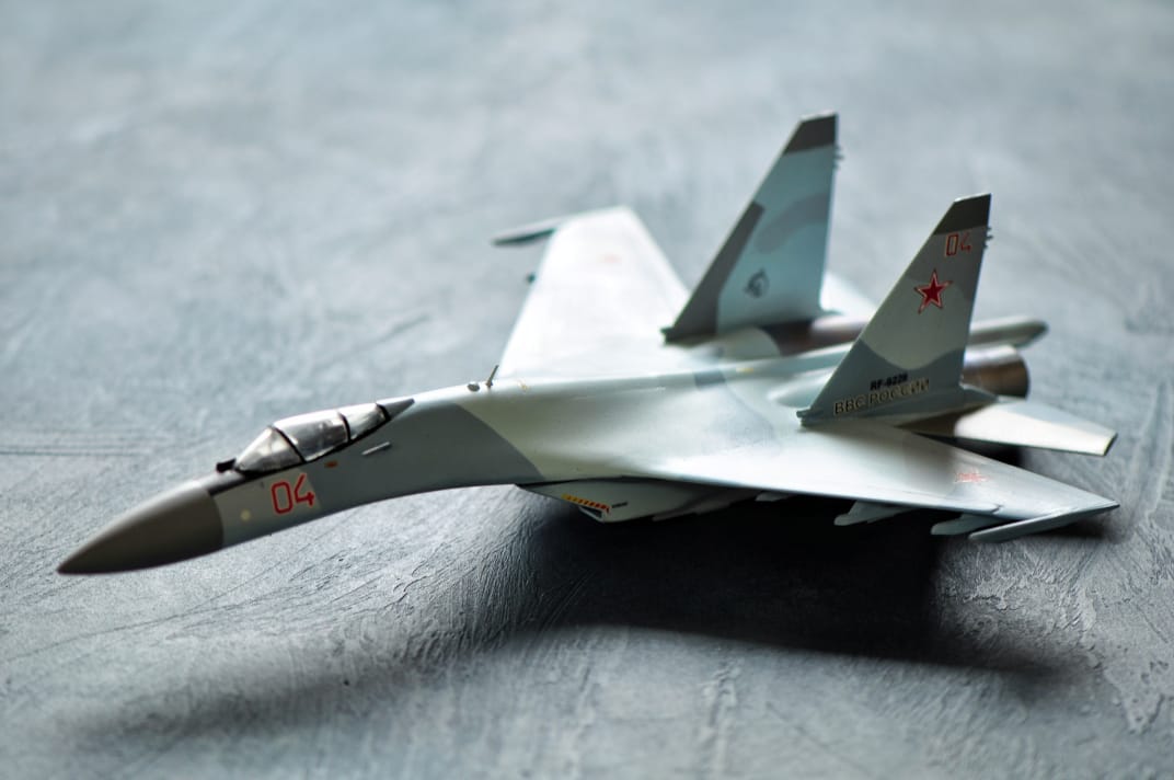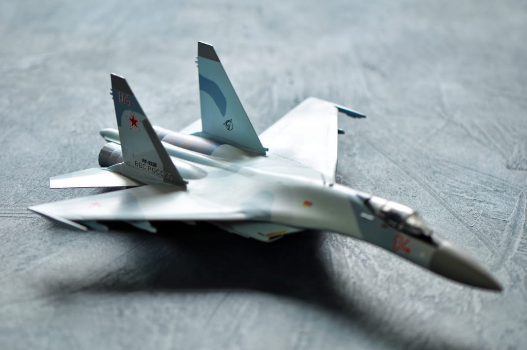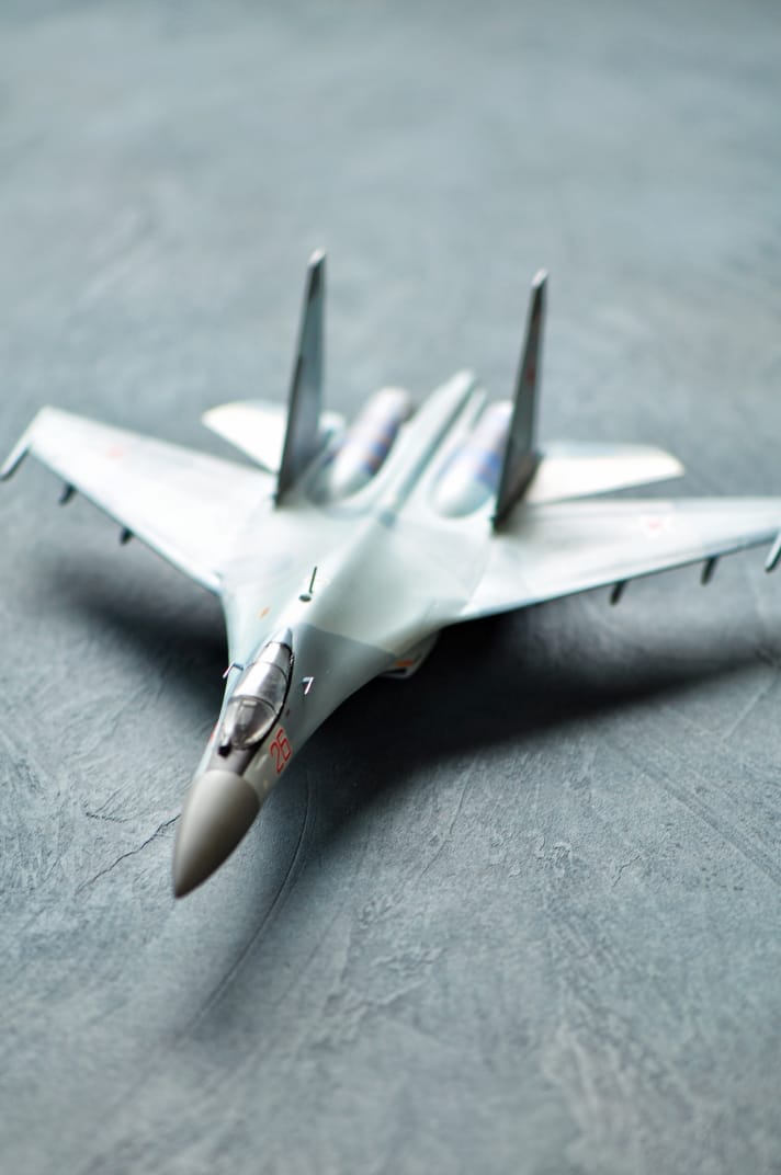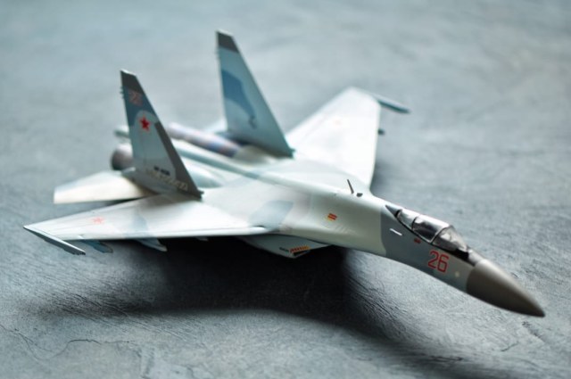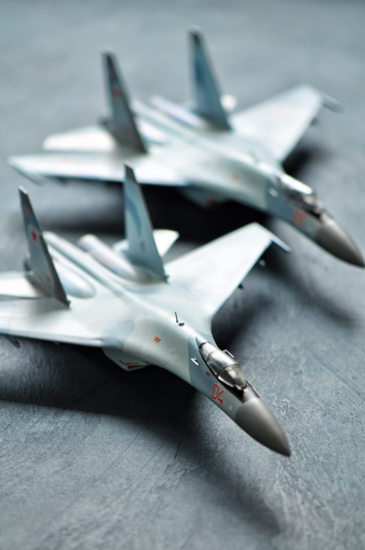 Су-35 от Звезды. Выполнены в полетной конфигурации. Срезаны ПГО. За копийностью не гнался, нужен был только образ для "пешего по летному". Окрашивал Аканом.