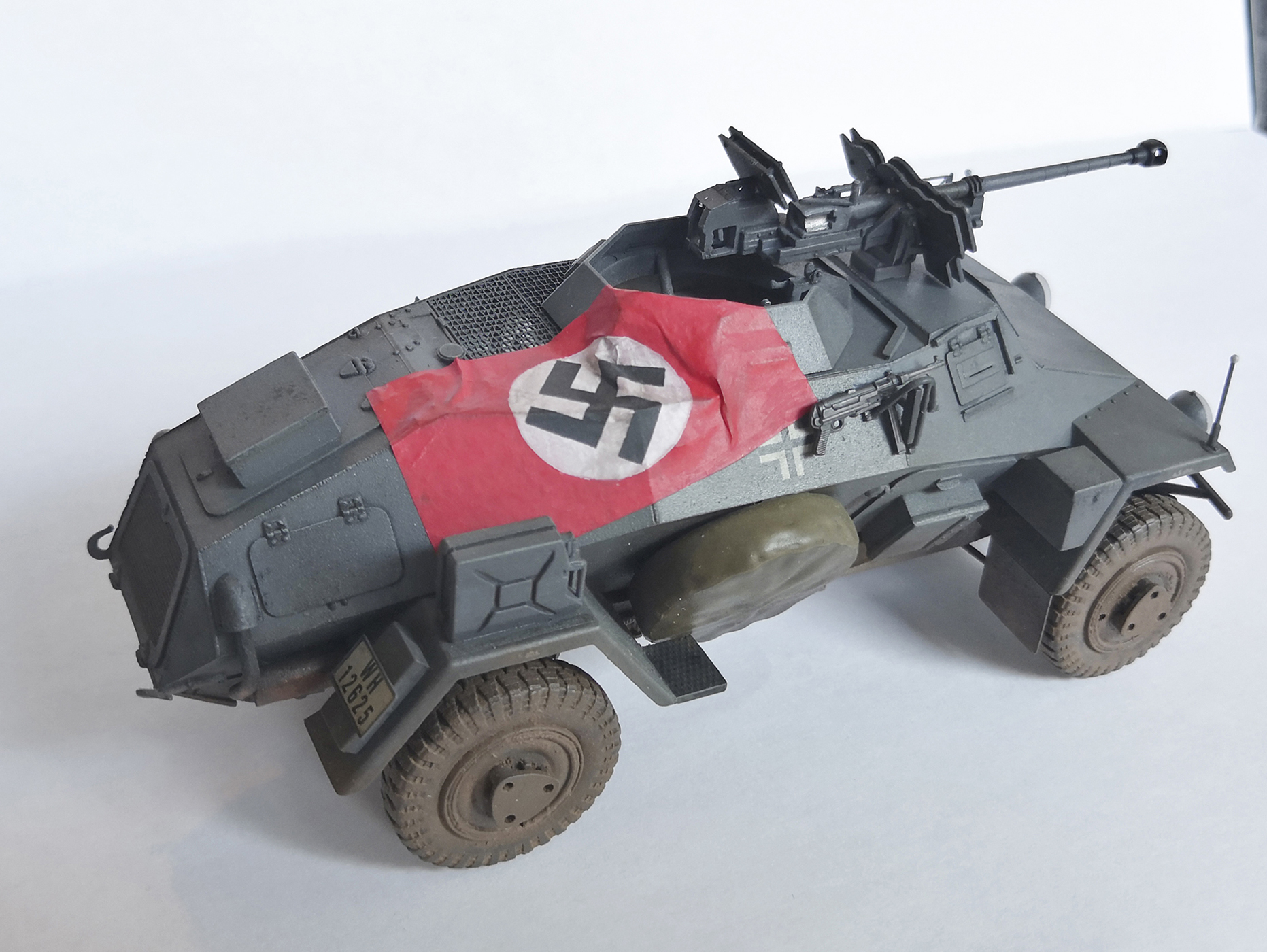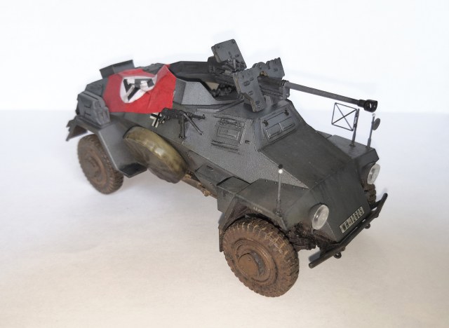 Выставляю на обозрение модель немецкого легкого бронеавтомобиля Sd.Kfz.221 (Le.Pz.Sp.Wg) с тяжелым противотанковым ружьем 2,8 см PzB 41. Окрашивал красками Tamiya. Смывка, тонировка и сколы от Wilder. Флаг делал из упаковочной бумаги для обуви. Свастику распечатал на принтере и с помощью иголочных отверстий по периметру сделал маску на малярном скотче и задул.