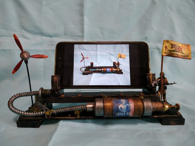 А чтобы держать марку держалка по мотивам " Фолыча Лас- Вегас" угол наклона смартофона меняется собрана из мусора.