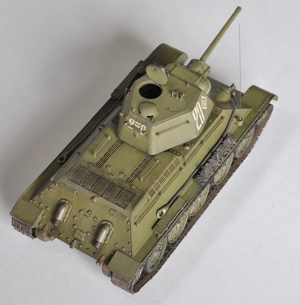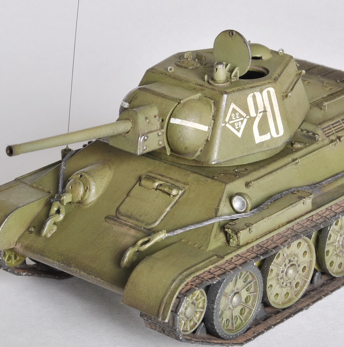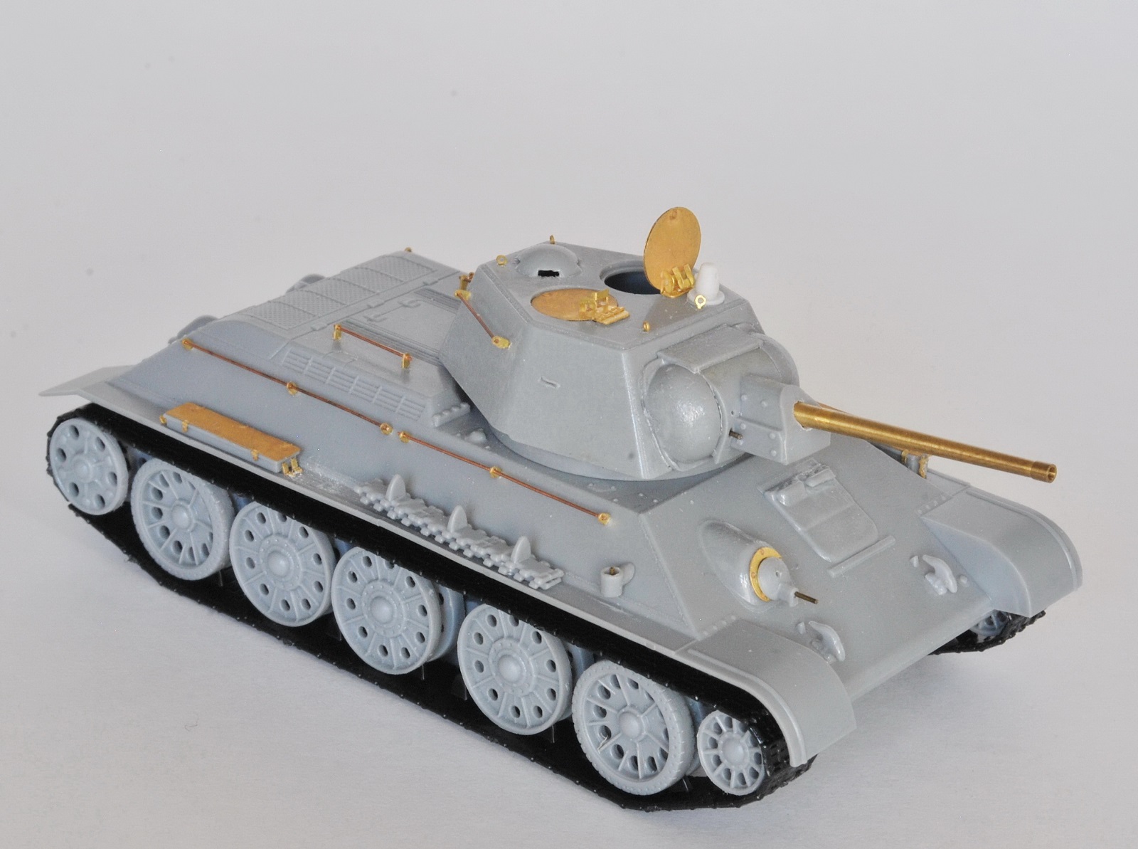 Немного поработал над исходником с помощью травления от Пингвина, заменив ствол, пулеметы, тросы и бронировку приборов наблюдения. Также проделал щели вентилятора, прицелы и добавил поручни, литую фактуру брони и сварные швы там, где нужно. Все доработки можно посмотреть на фото до покраски. В ходе доработок к известному фото прототипа не привязывался.