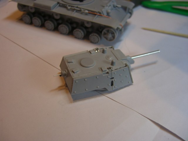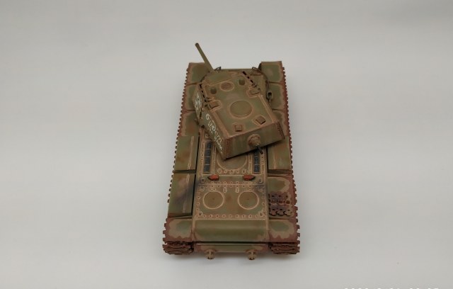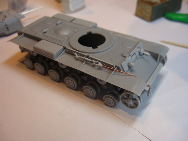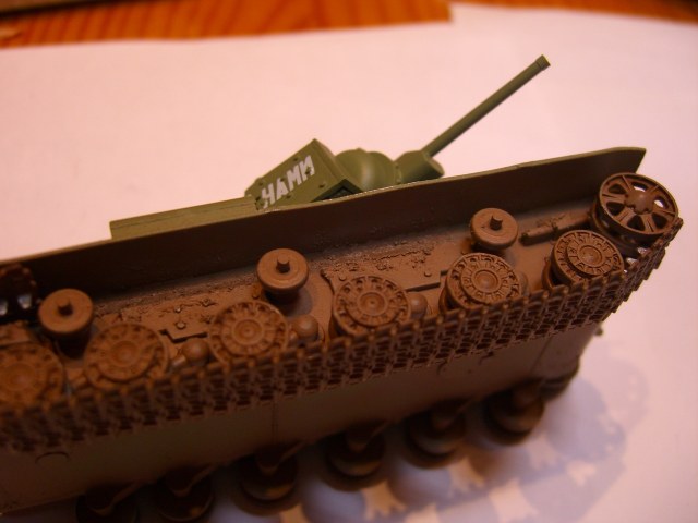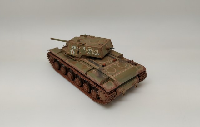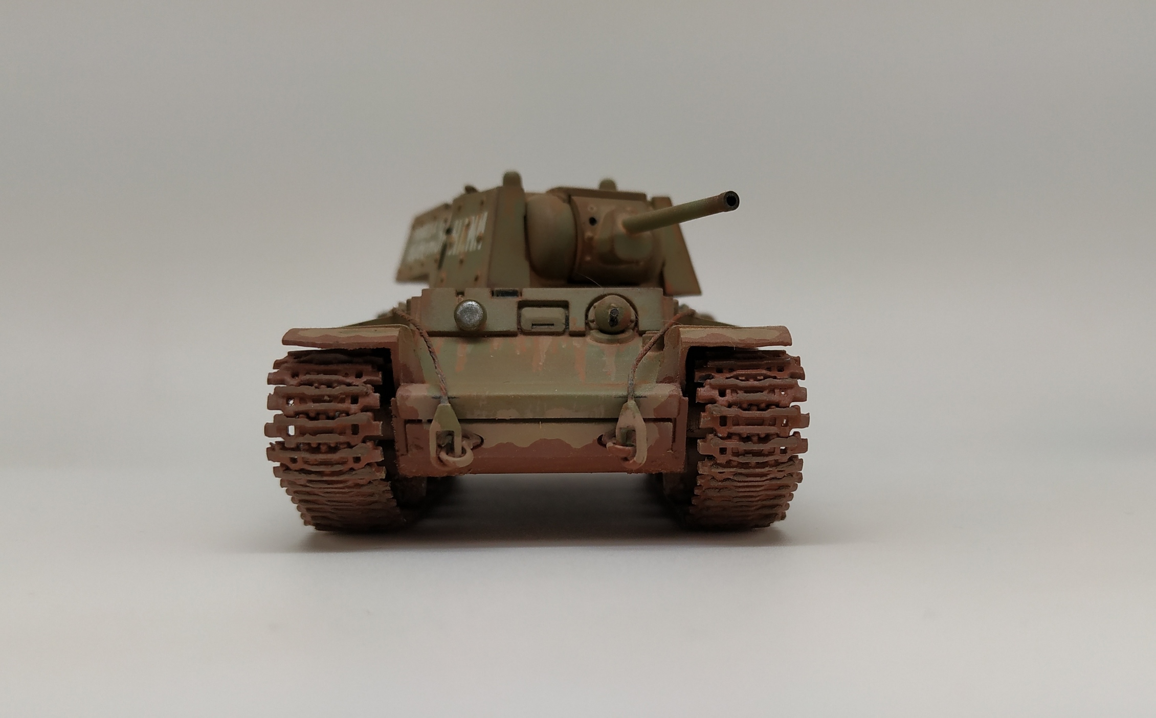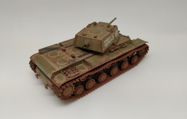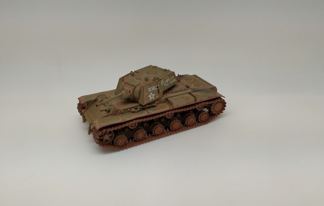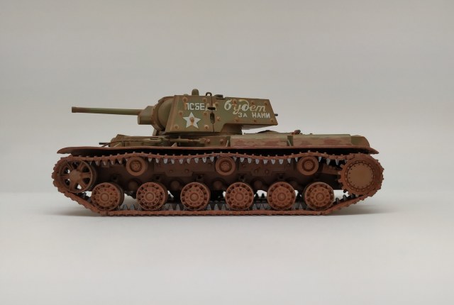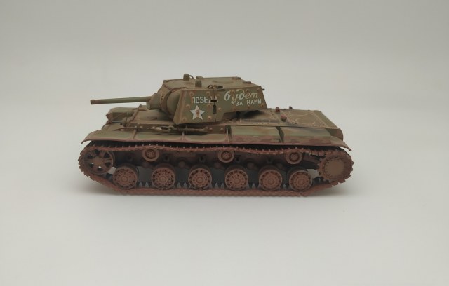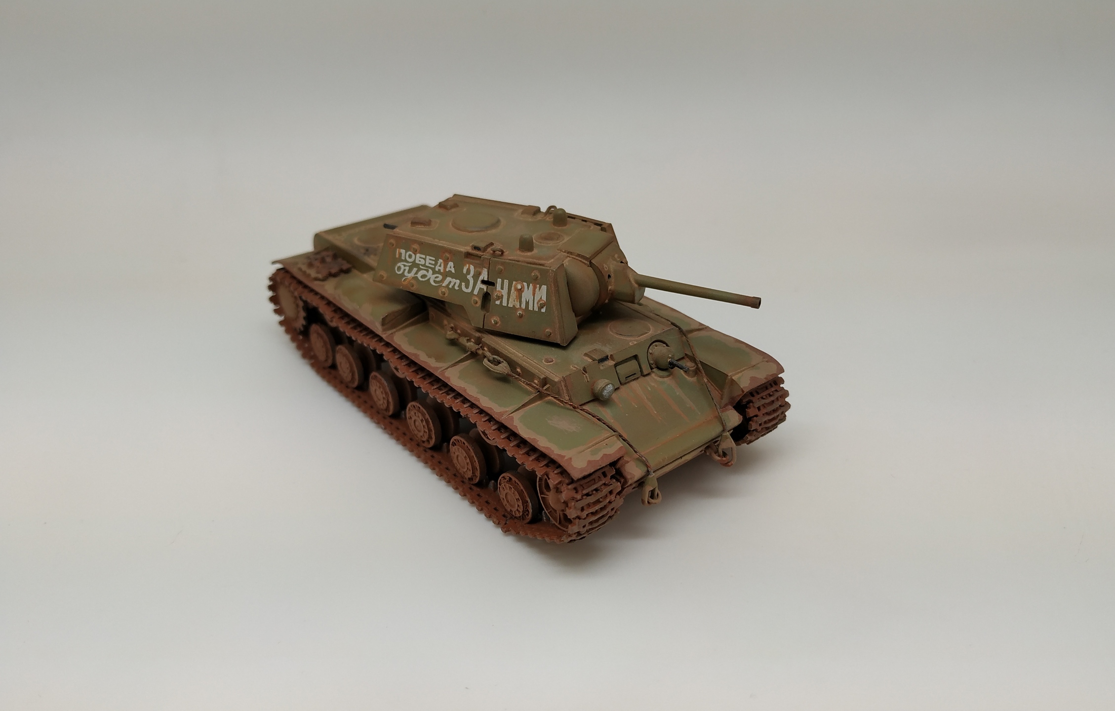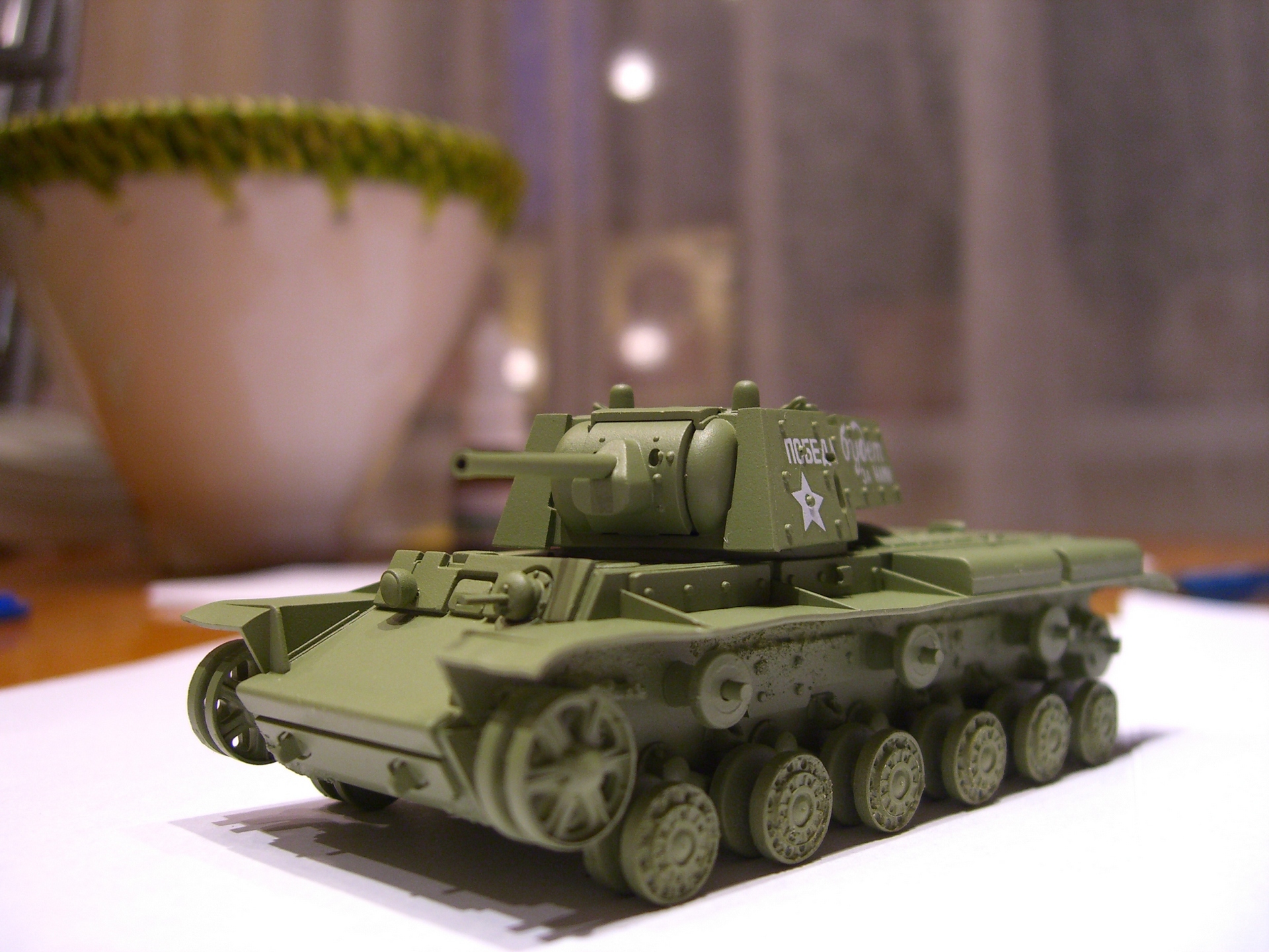 В 2009 году решил собрать модель КВ-1, очень понравился вариант с дополнительной защитой КВ-1Э. Купил набор от белорусской PSTиндекс 72016. Набор за свои деньги довольно неплохой, есть с чем сравнить. Конечно решил приобрести афтермаркет, ствол от фирмы ABER(ABR72-L34), тросы сделал сам из тонкой медной проволоки, проушины для демонтажа башни тоже из проволоки. Так же были куплены для копийности смоляные гусеницы. Честно не могу вспомнить что за изготовитель, но помню что они стоили как модель КВ-1 от HobbyBossв 1/48. Родные гусеницы конечно ужасные. При сборке смоляных гусениц модель выскользнула из рук и с высоты 3 см. приземлилась на модельный коврик. Примерно 10 траков разломились пополам. Мой бюджет покупки второго набора уже не выдерживал. Пришлось ставить родные траки от PST. Были так же заменены стволы курсового и заднего башенного пулемёта на самодельные. Красил модель акриловыми красками от фирмы Vallejo, основной цвет 71.017 4БО, высветлял добавлением жёлтого. Объемная грязь сода с клеем ПВА. Попытался сделать сочетание сухой и сырой грязи на бортах и на гусеничных полках. Тонировка, смывка и сухая кисть масляными красками «Сонет». Это была моя вторая модель бронетехники.