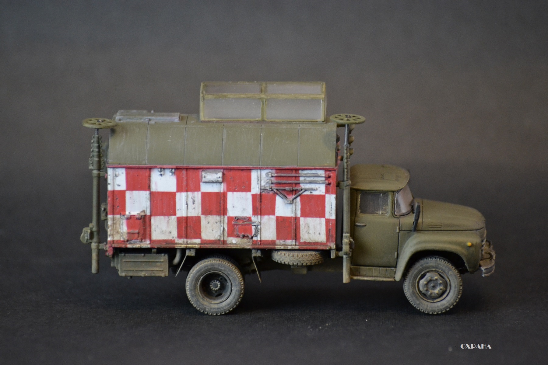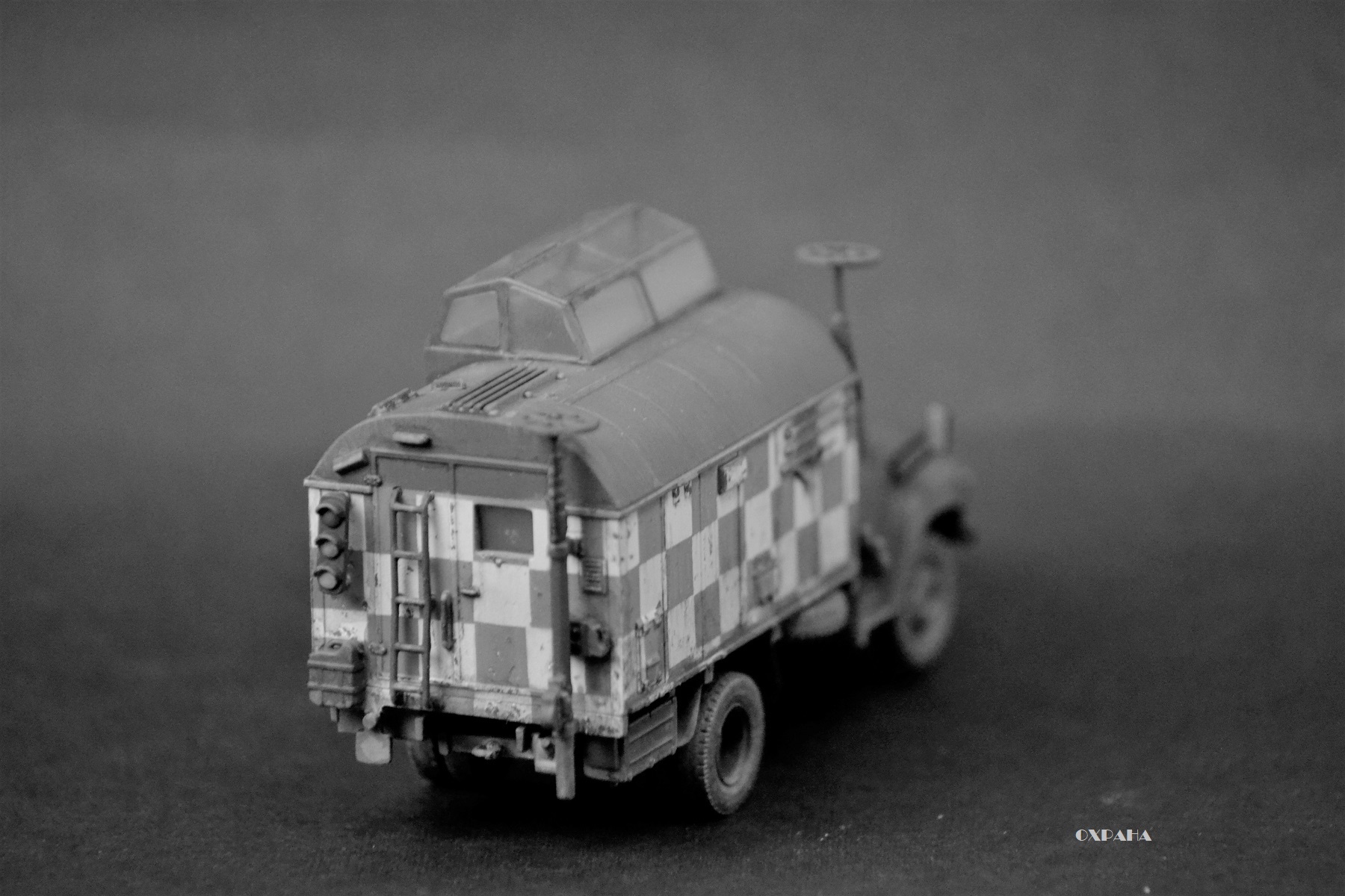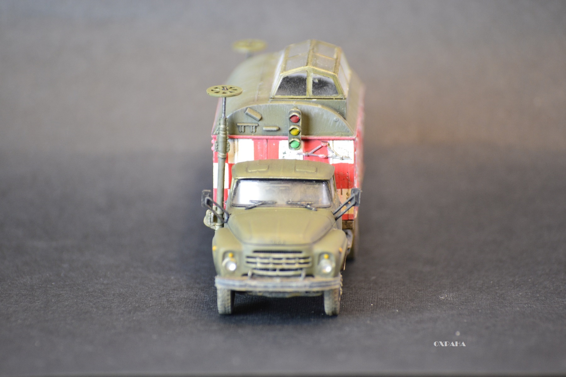 На самом деле есть ошибки, но не критические - на поворотниках забыл обозначить черным цветом уплотнитель, задний светофор закреплён не ровно (заметил когда фотографировал, чтоб отдать модель), усадка супер клея привела к перекосу антен, нет гос номеров или борт номеров. Вот как-то так :-)