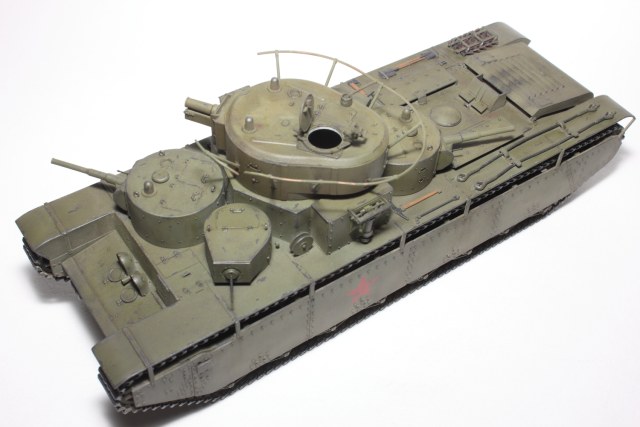 Сборка почти полностью искоробочная, за исключением пулемёта главной башни (он из иголочки и проволоки) и пары петель на корме танка. Башня многострадальная, пару раз упала, что привело к поломке пулемёта. Немного переборщил со сколами (всегда трудно остановиться), но итоговый результат очень понравился. Я очень хотел получить боевой, но не ушатанный танк, в меру потёртый (получилось чуть больше чем надо), в меру запылённый.