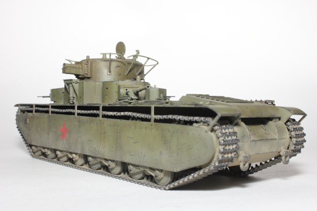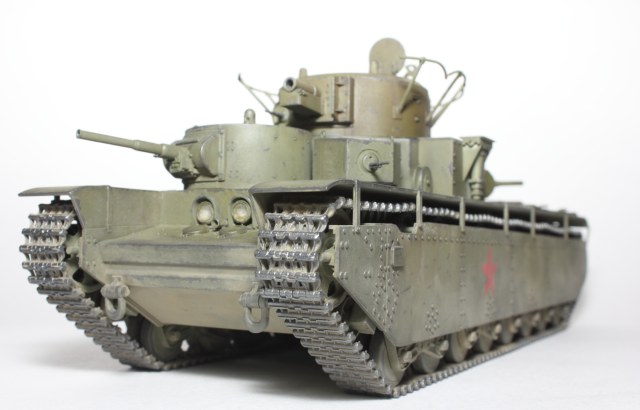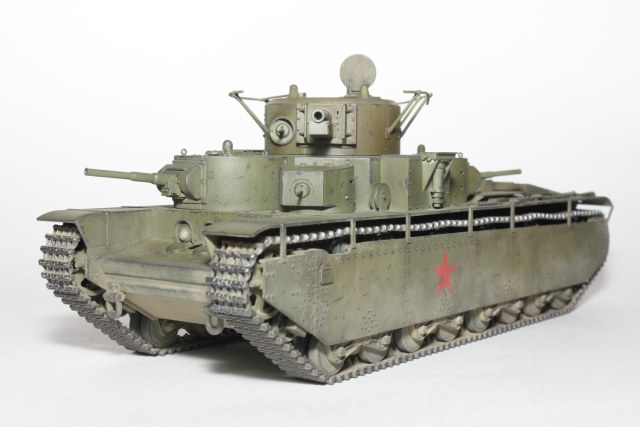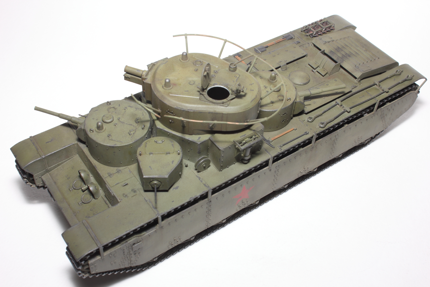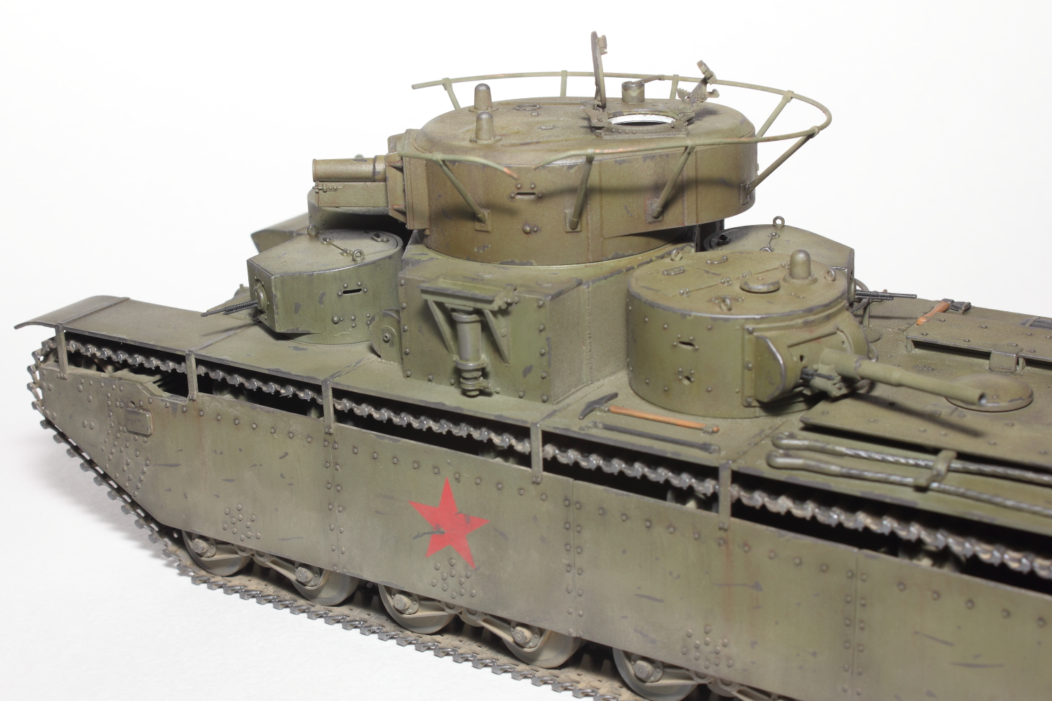 Добрый день, коллеги. Спешу представить вам моё очередное творение: модель советского тяжёлого пятибашенного серийного танка Т-35. Танк разрабатывался в начале 30-х годов, и имел несколько модификаций, отличавшихся друг от друга рядом элементов, формой башен и надстроек. Успешно красовавшийся на брусчатке Красной Площади, танк не очень хорошо проявил себя на полях сражений Великой Отечественной войны. Сказалась тонкая броня, слабое вооружение и перетяжелённая проблемная ходовая часть танка. Да и вся концепция оказалась устаревшей и не нужной.