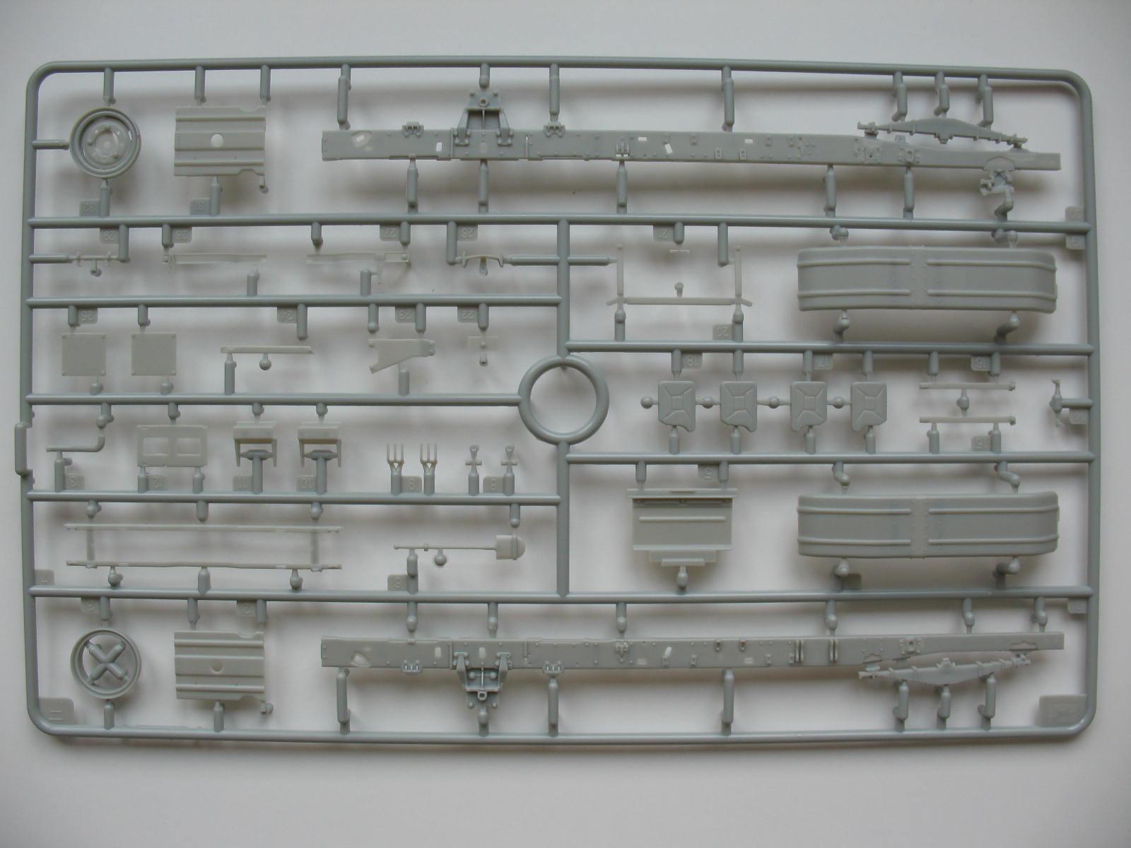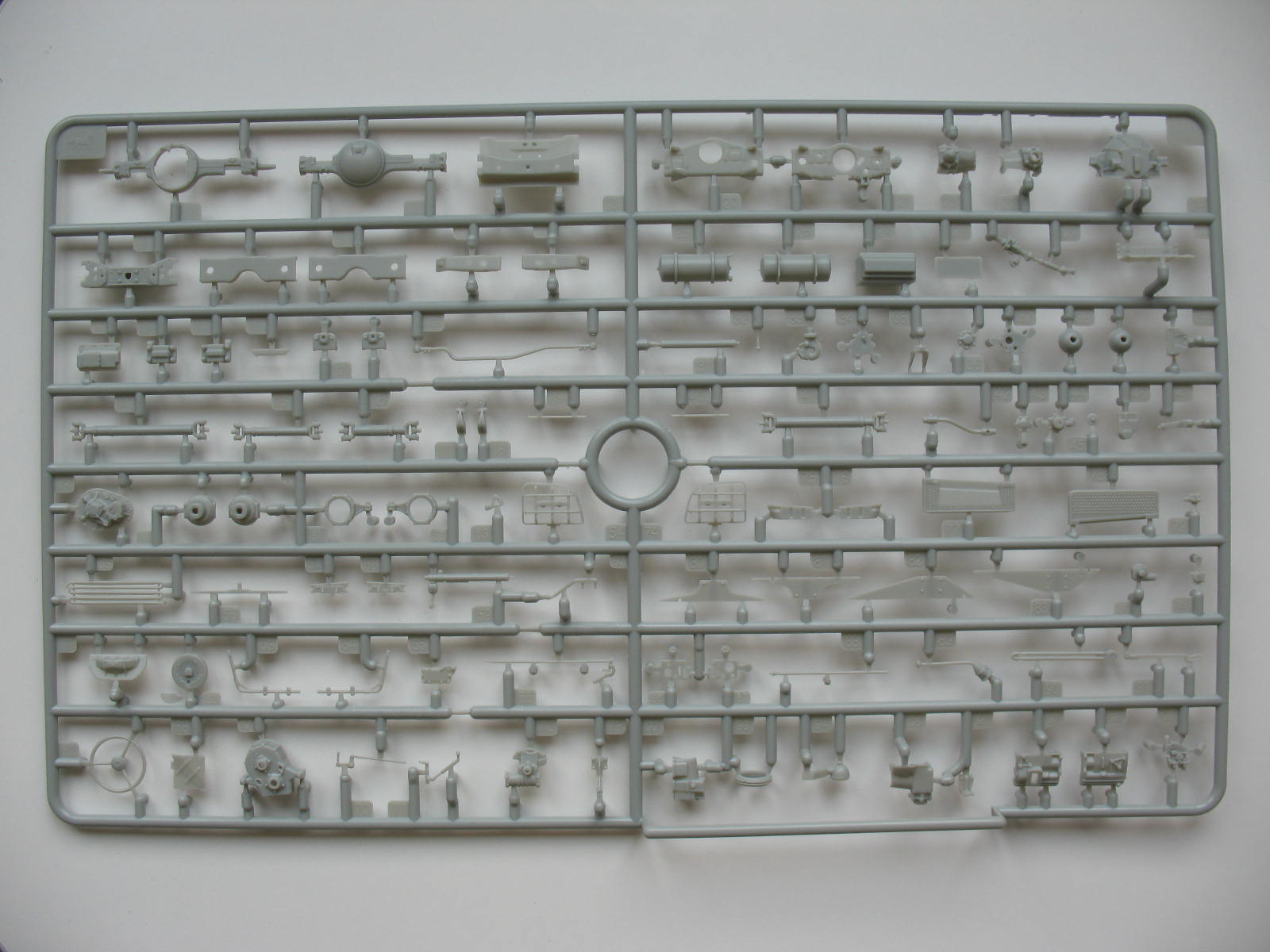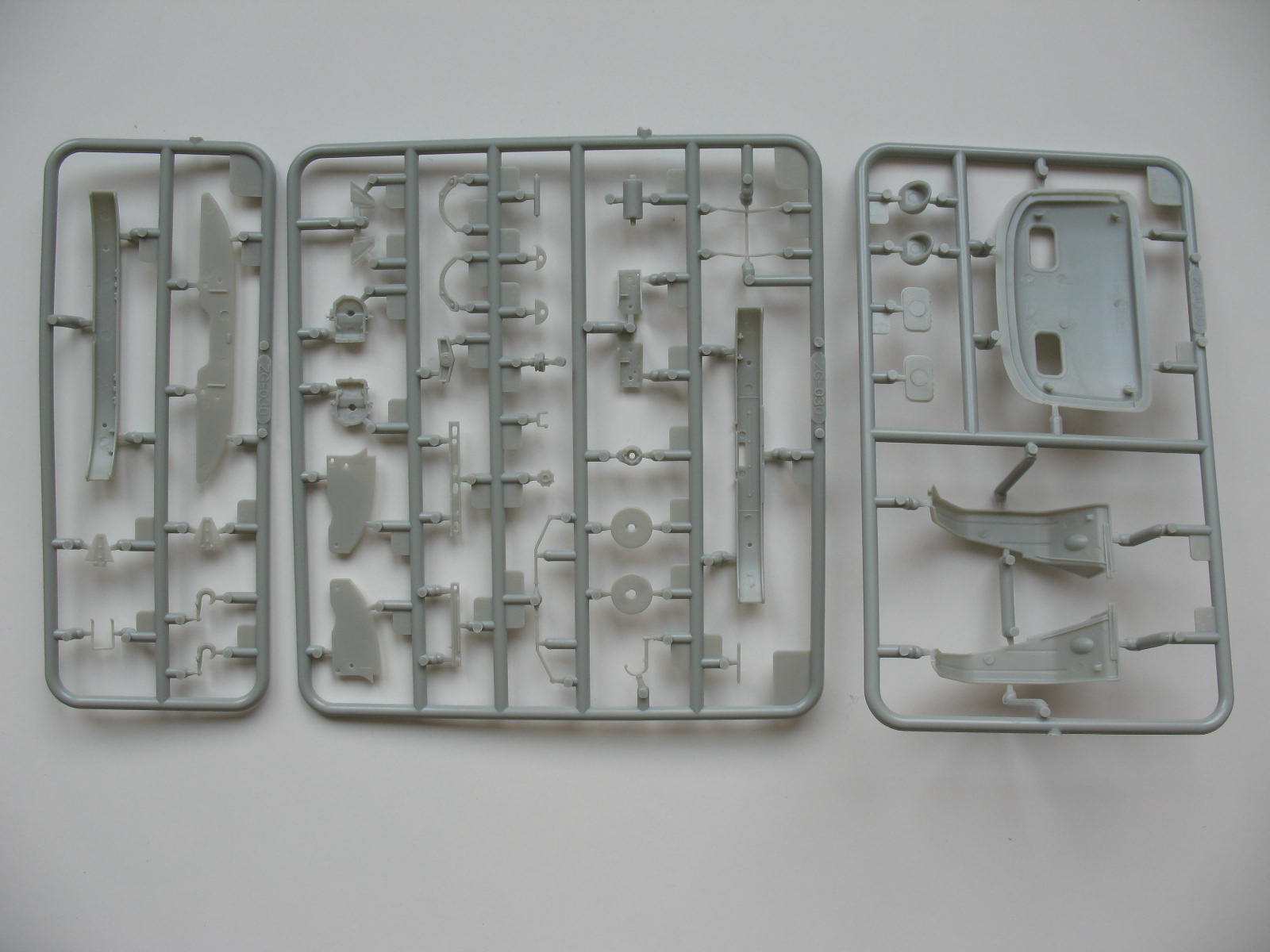 Всего наборсодержит 11 литниковых рамок из пластика светло-серого цвета, рамку из прозрачного материала со светотехникой и стеклами кабины, а также 8 колес из резиноподобного материала. Имеется небольшая платка фототравления.