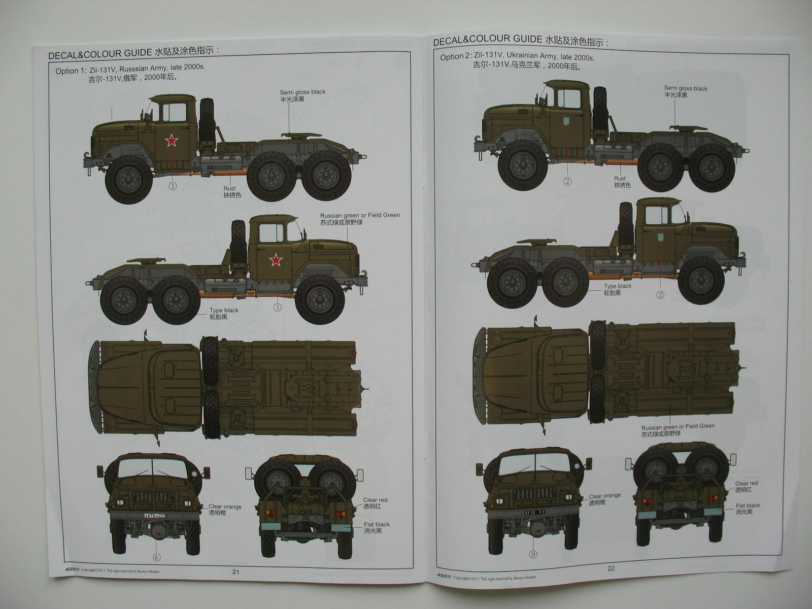 Декаль довольно скромная и включает циферблаты приборов, три комплекта номерных знаков (один на Советскую Армию, один на российскую и один на украинскую), а также эмблемы-кокарды армий ГДР и ЧССР на двери кабины (но без соответствующих номерных табличек). Как и другие производители, Bronco проигнорировала эмблему Знака качества на боковине капота, а ведь он присутствовал на всех машинах семейства ЗиЛ-131 с 1974 года до самого конца советского периода их производства.