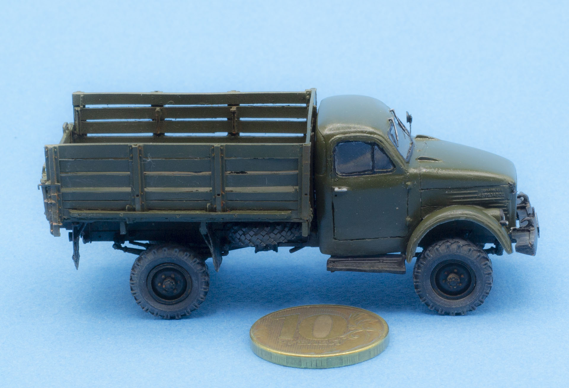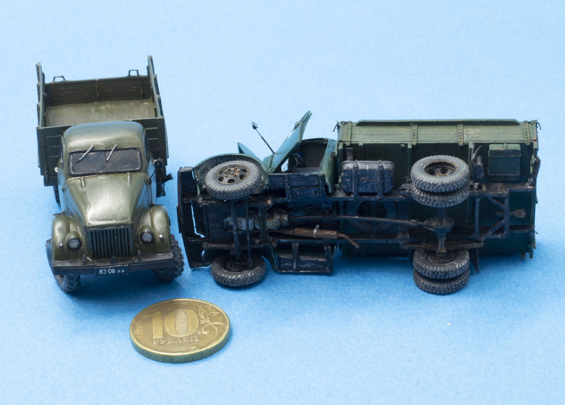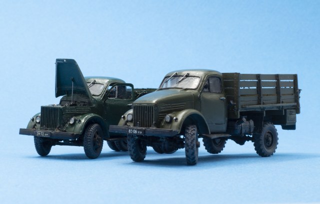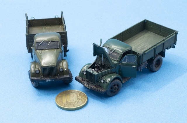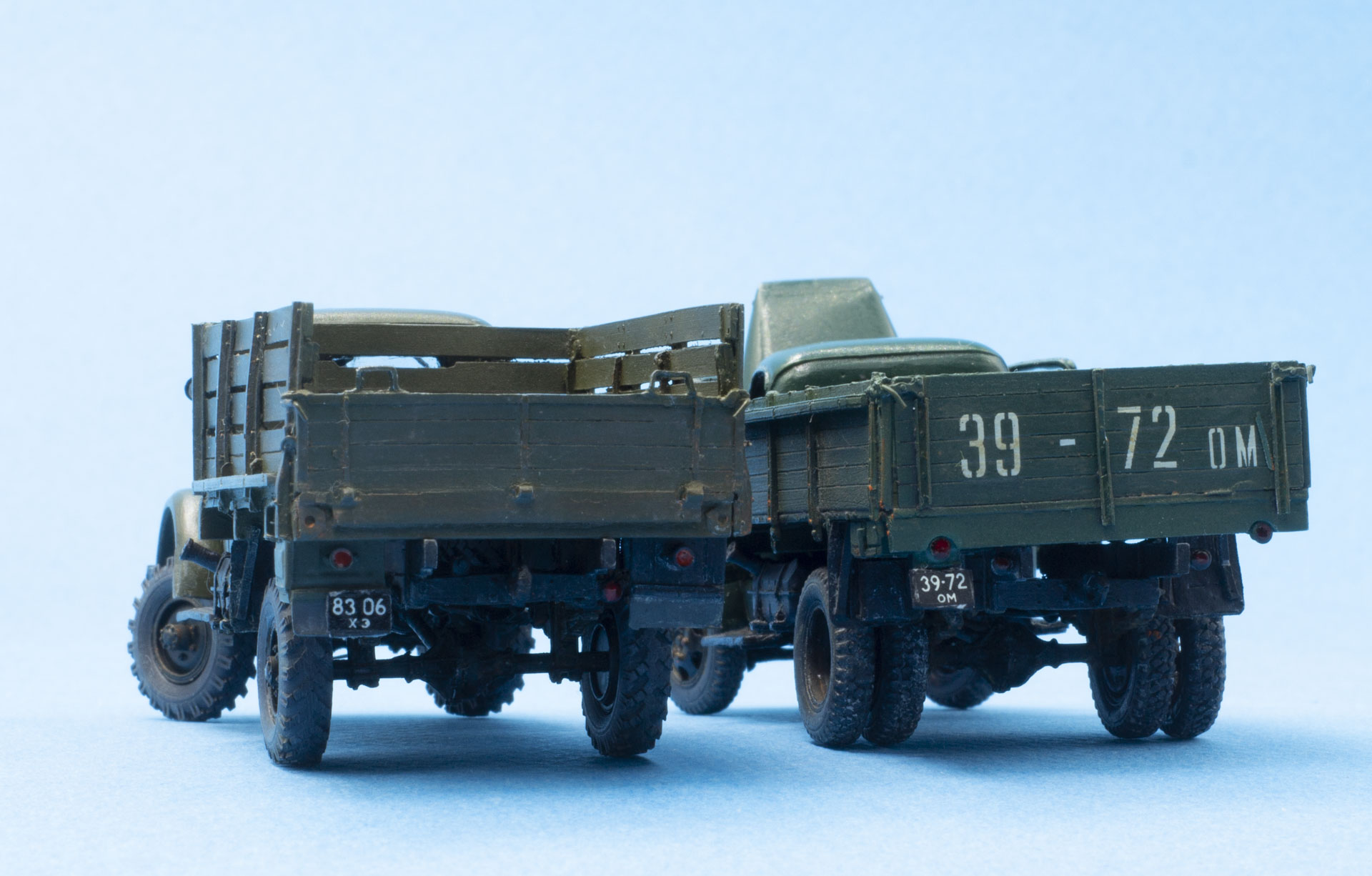 Приветствую, уважаемое сообщество. Хочу предоставить на ваше обозрение свою работу. Тематика не совсем моя, но, тем не менее, иногда я собираю и в этом жанре. Много писать не буду, совсем немного по модели: модель полностью из полиуретановой смолы, отлита кустарным способом самим автором и разработчиком (В. Панков). Как и указано на упаковке, предназначена только для очень опытных моделистов. При огромном желании набор позволяет собрать очень точную модель-копию легендарного грузовика. На этой модели я упростил сборку и не стал делать открывающиеся двери и капот, ибо делал это ранее на ГАЗ-51 (набор того-же автора). Для сравнения я прилагаю фото обоих мини-грузовичков. Окраска- АКАН (тематические наборы). На ГАЗ-63 колёса "Танкоград". Да, капот потерял- пришлось пилить самому. Всё остальное- из набора. Приятного просмотра!
