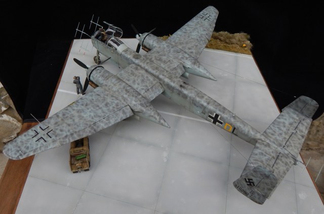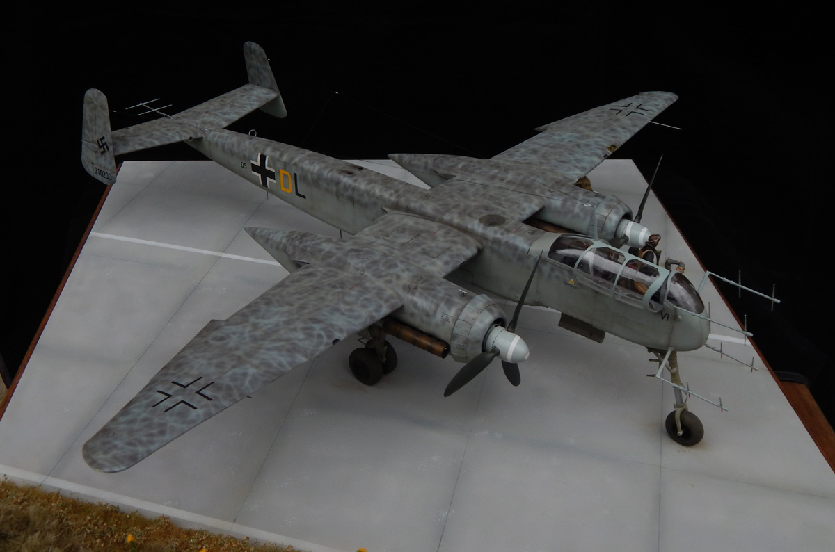 Модель я загрунтовал 1200 грунтом Gunzeиз баллона, нанес прешейдинг черной краской по линиям расшивки. Окраску проводил в два этапа – сначала верх в RLM75, затем боковые и нижние поверхности RLM76 и, после, начал наносить сетку RLM76 на темно-серые верхние поверхности, формируя «обратный моттлинг» - процедура трудная, но интересная. Модель задул полу-матовым лаком GunzeTopCoat, нанес декали (свастика от Бегемот) и нанес еще один слой лака Gunze. Провел тонировку масляными красками Gunze.