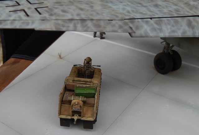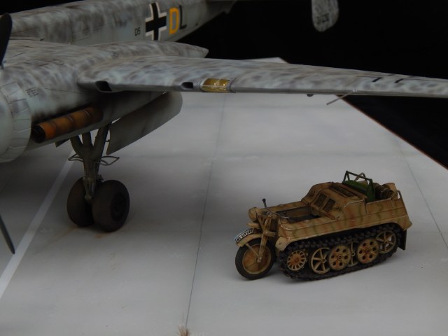 Для дополнения диорамки я решил использовать старый набор от DragonKettenkraftrad. Модель была отмыта и перекрашена в камуфляж, состарена масляными красками, нанесены сколы и добавлен небольшой скарб. Основа диорамы – листовой пластик от Tamiya, размеченный скрайбером и окрашенный красками Tamiya, «зеленка» - маты от MiG, окрашенный сан-тех лен, цветы от Silflor.