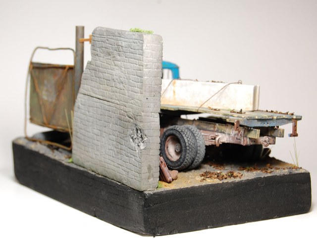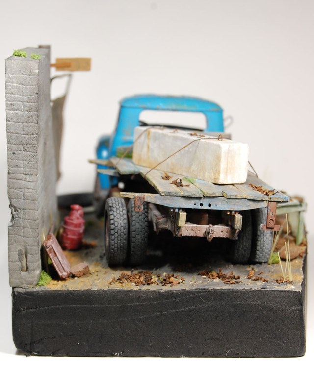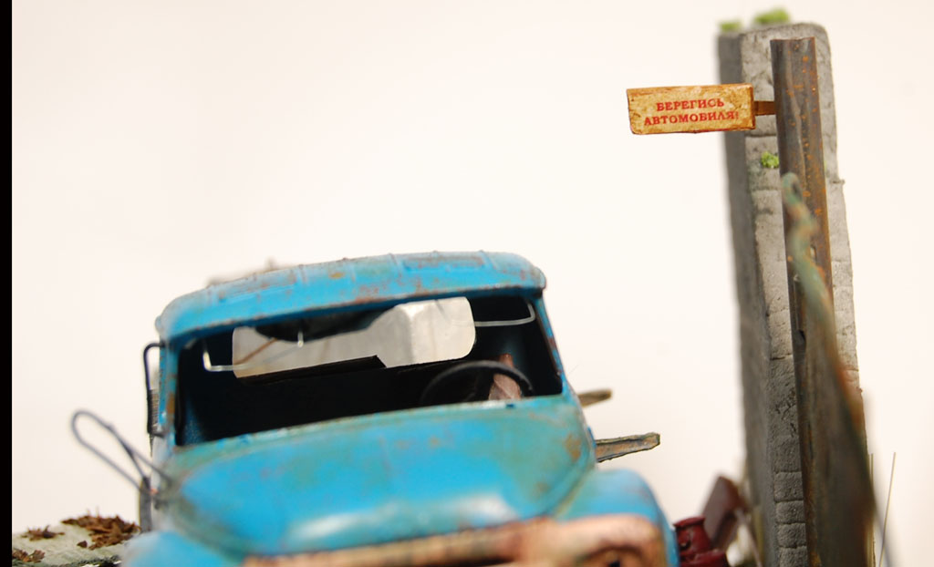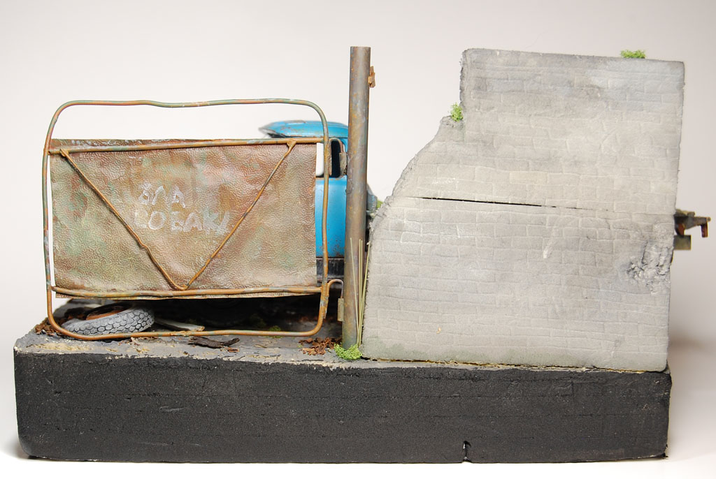 Красиво, но немного не реально. Я про машину. Понимаю: 43й, металл, но напильником можно же изобразить вмятинки и глубокие царапины. А уж капот и крыша на брошенной технике страдают в первую очередь.