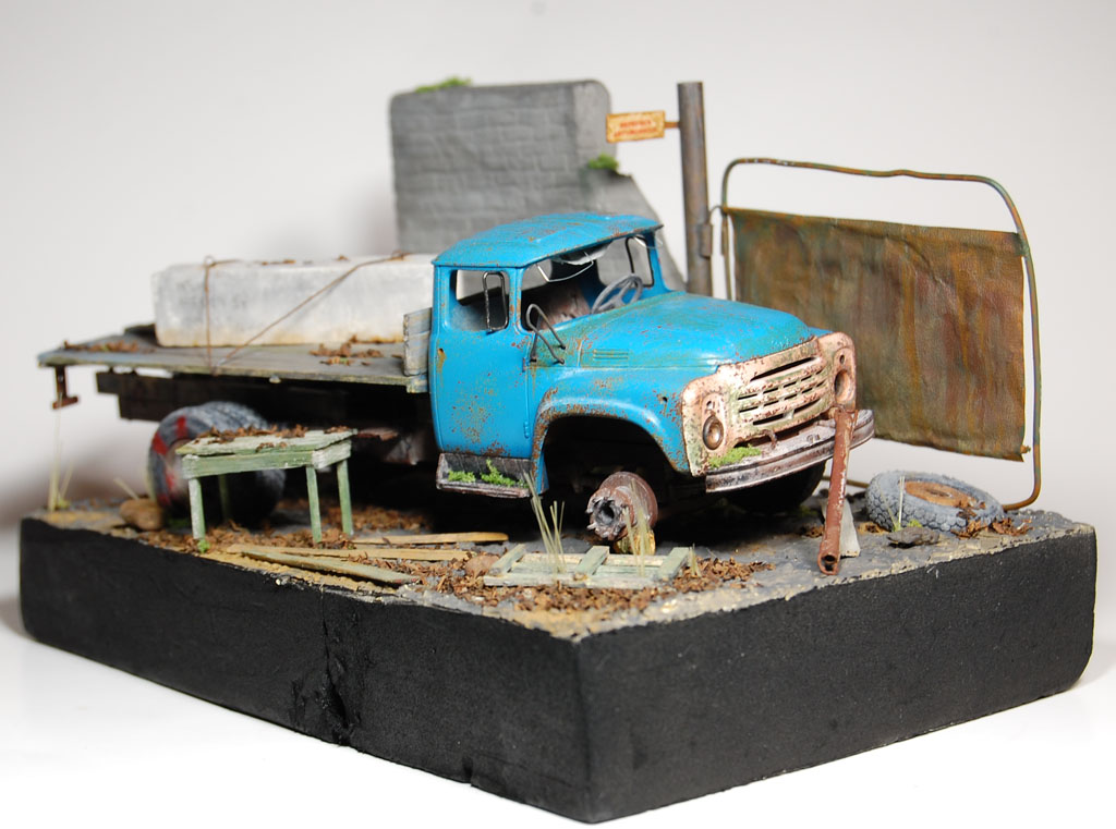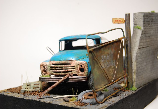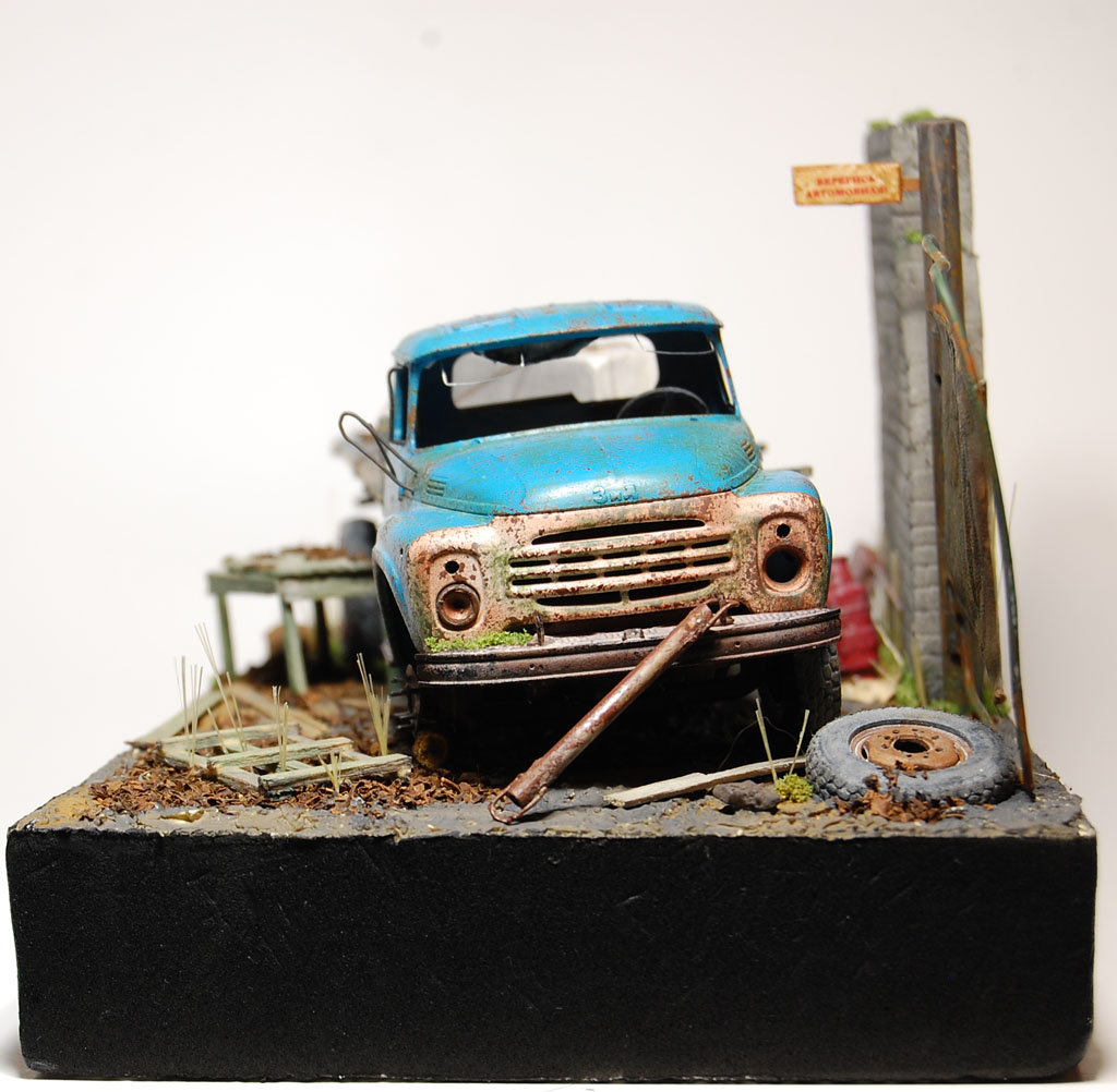 Зх за что же его так то?он же рабочая лошадка был)-мне понравилось, мне кажется надо бы капот открыть или приоткрыть-но лучше бы он был целый пусть ржавый но рабочий)-мне нравятся ваши работы