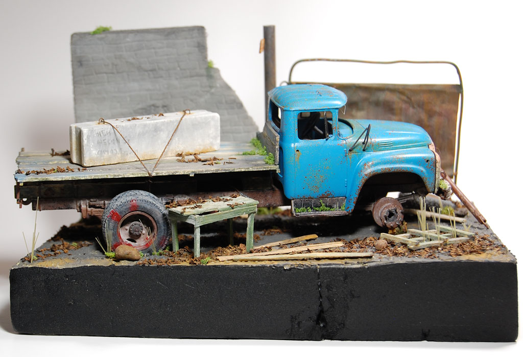 Анатолий, отличная работа как всегда! ЗиЛ зачетный, антураж тоже. А улучшать конечно можно : спущенные колеса, кривоватые перекладины ворот, ржавчина, надпись на блоке, следы замшелости и т.д. и т.п. Но так можно и до бесконечности выискивать недоработки. Работа очень атмосферная. Единственное, что сильно режет глаз - кривая кладка на стене и зависшие в петлях крюки ворот, ну не дотягивает это до Вашего уровня исполнения. С уважением.