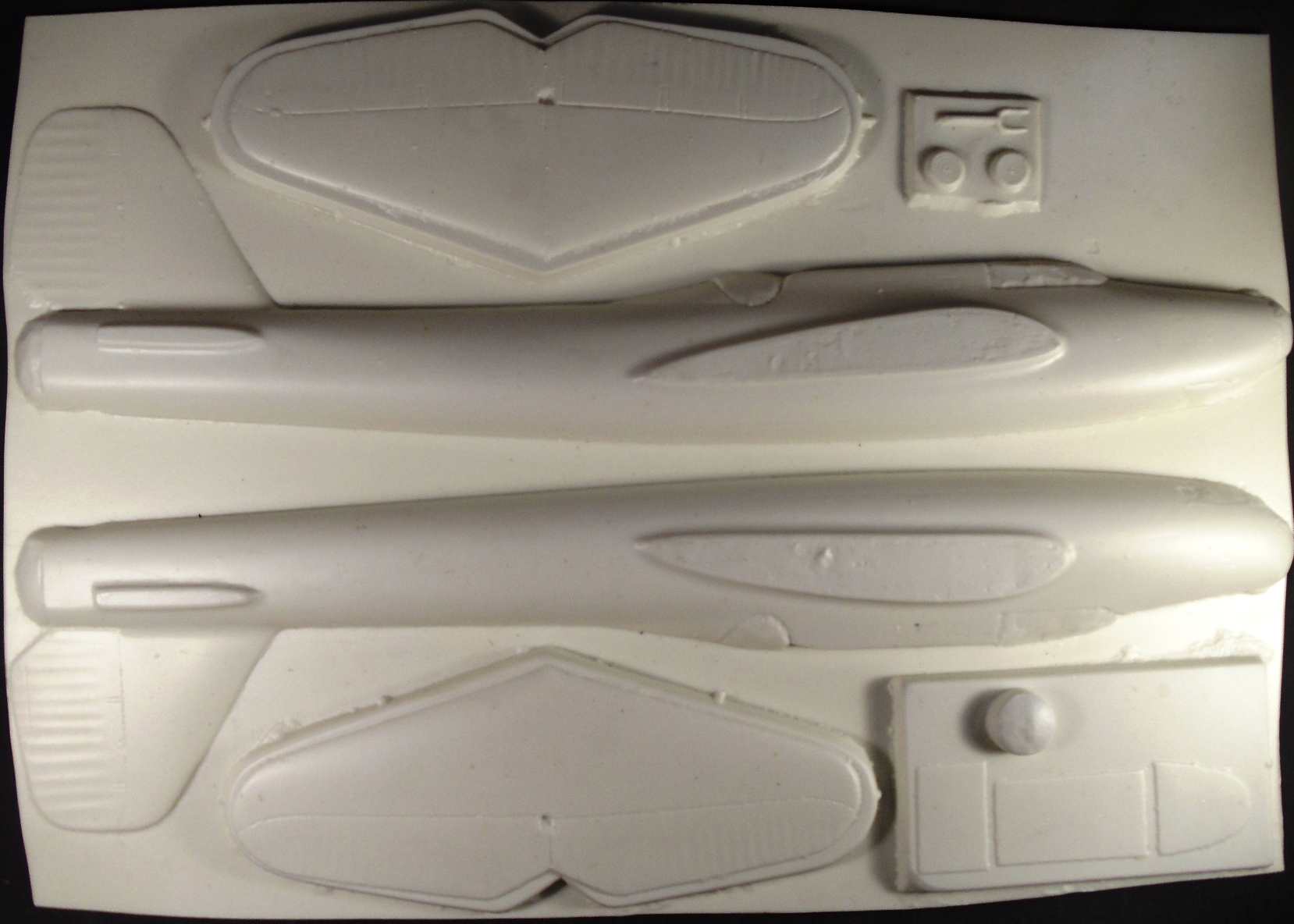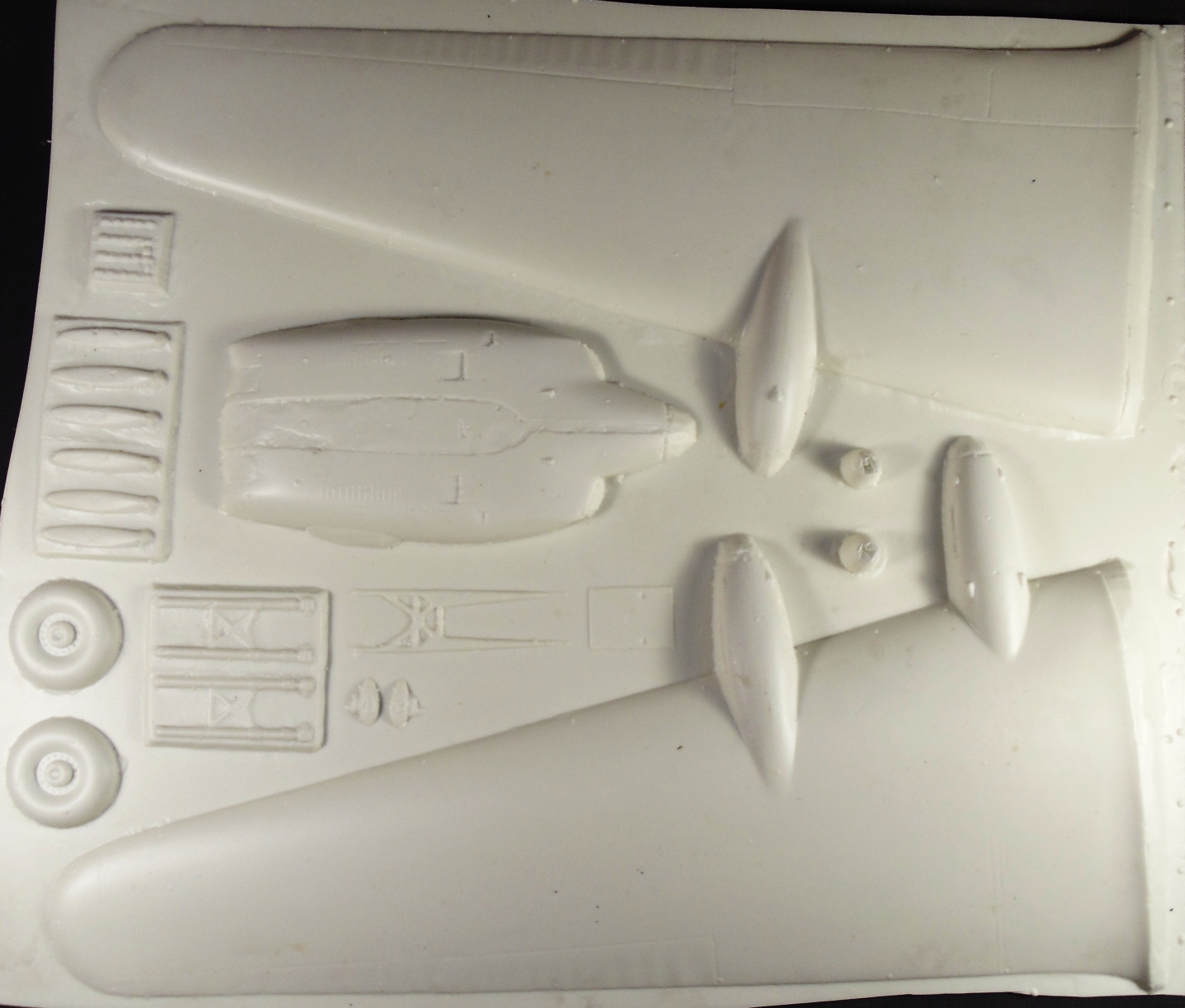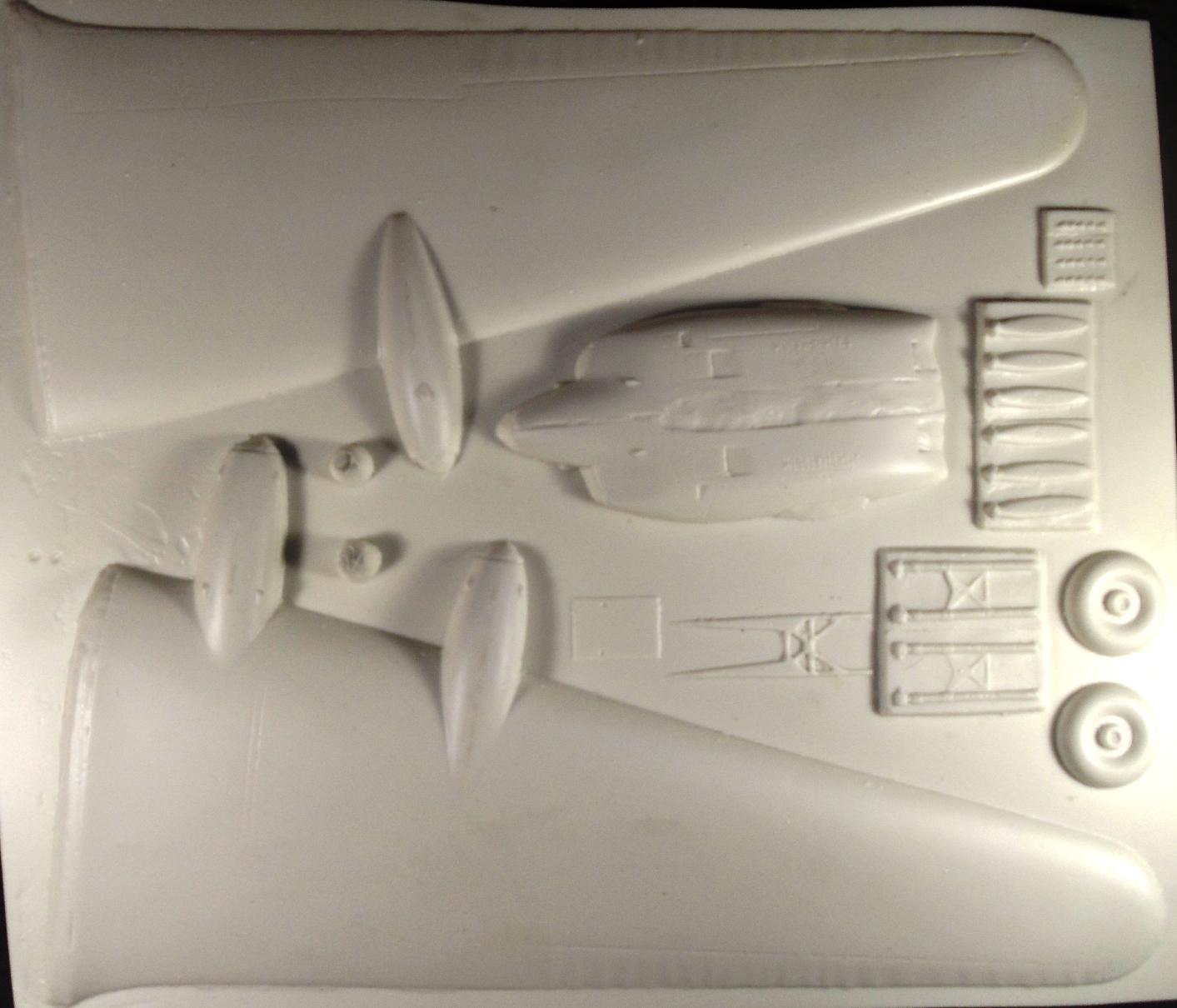 МОДЕЛЬ состоит из листа с фюзеляжем, двух зеркальных листов с крыльями и стекляшки, выполненных методом вакуумной формовки а затем криво обрезанных. Сделана из толстенного пластика, изобилующего порами, следами от трещин и шероховатостями. Сам планер гладенький (почти гладенький) как яичко, что видно на фото. Никакой тонкой расшивки и деталировки. Провис полотна на управляющих поверхностях выполнен терпимо, хотя местами есть перебои с шагом нервюр. Узлы навески этих самых поверхностей показаны некими прямоугольниками из внутренней расшивки, видимо на эти места предполагается клеить то, что сам выточишь, но прямоугольники придется при этом шпаклевать. Линии, отделяющие элероны, рули и закрылки представляют из себя прерывистые траншеи с которыми тоже придется что-то делать... Мелкие детали отсутствуют как класс. Коки винтов, несмотря на исходную толщину пластика продавились почти насквозь. Стекляшки тоже немного корявые, но тонкие и прозрачные, не пожелтевшие от времени. Инструкция лаконична. Декали в моем наборе уже не было, или вообще никогда не было.