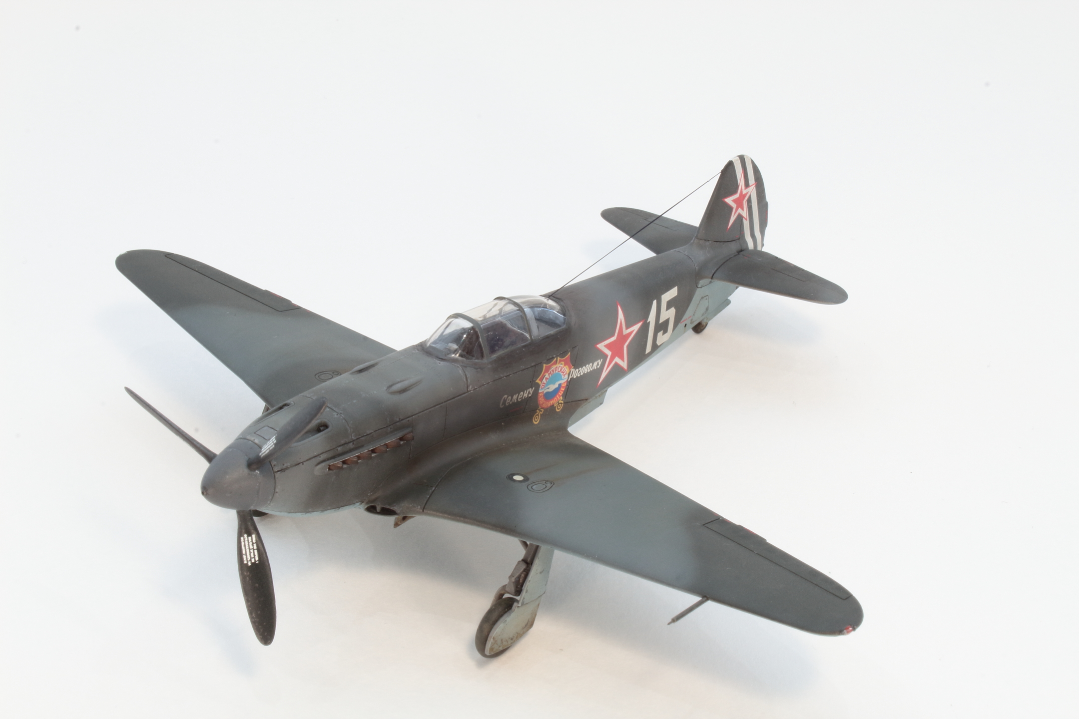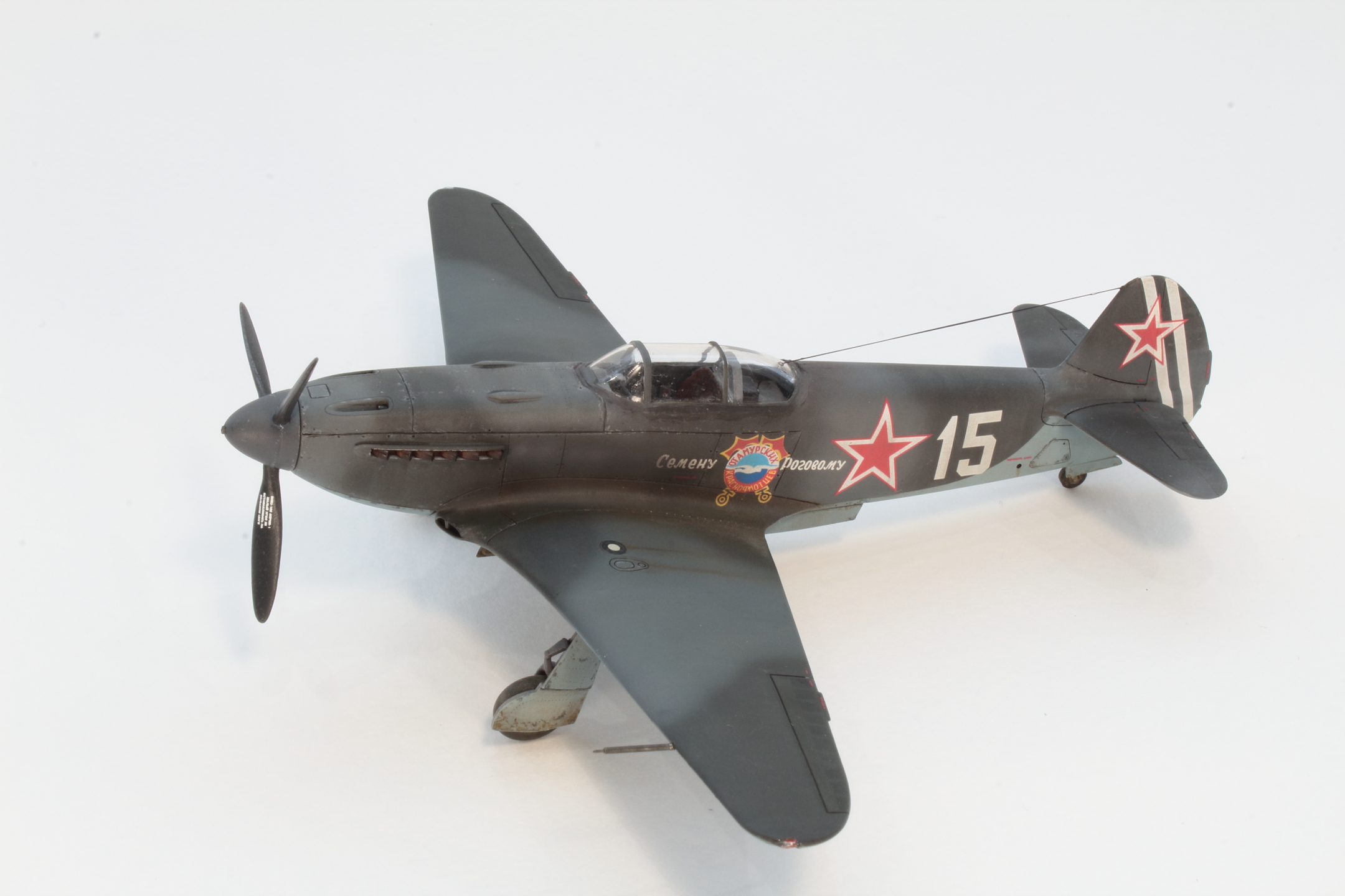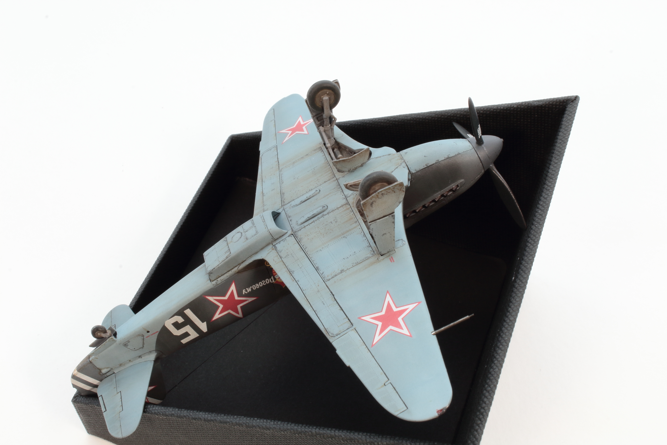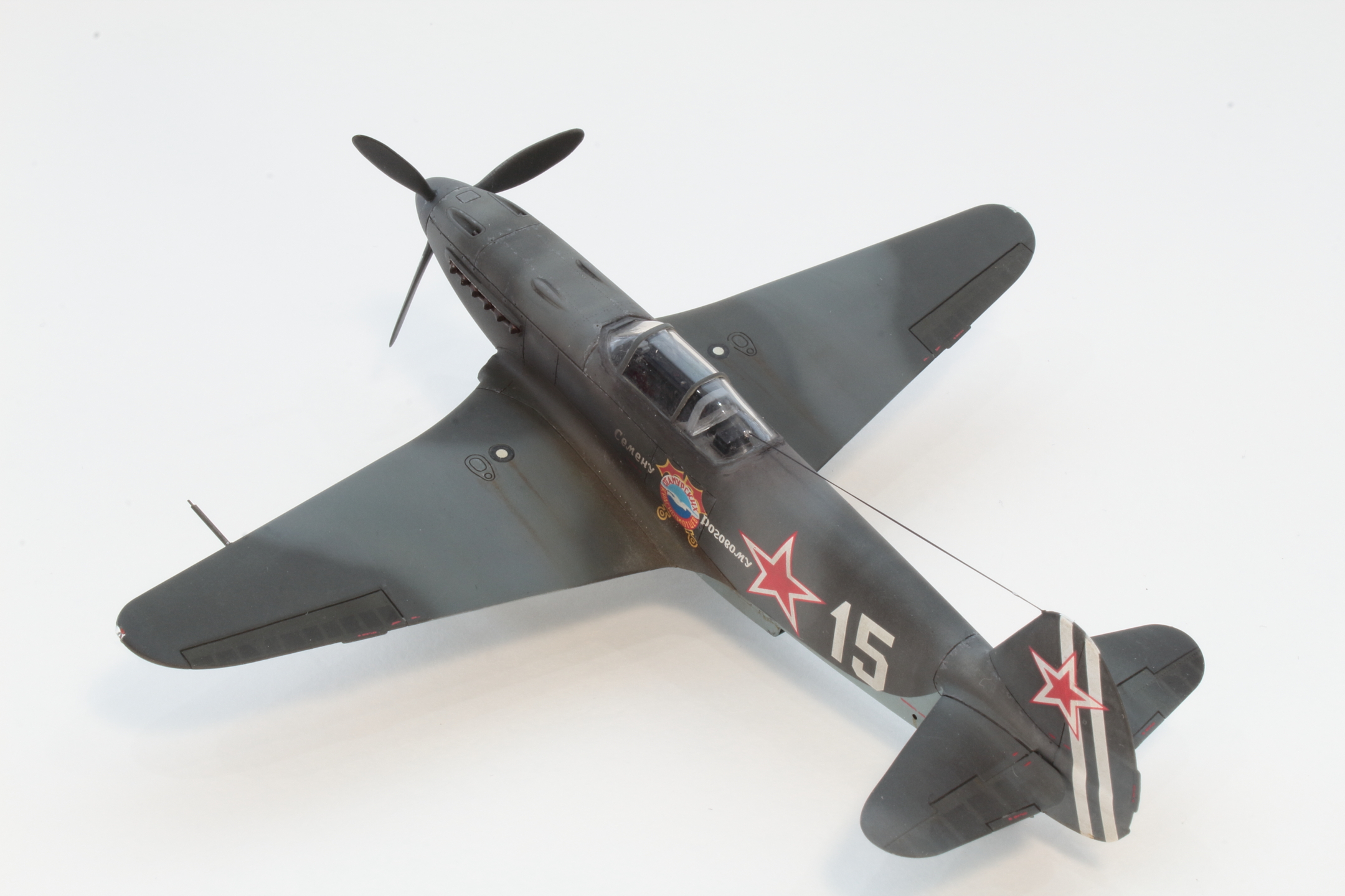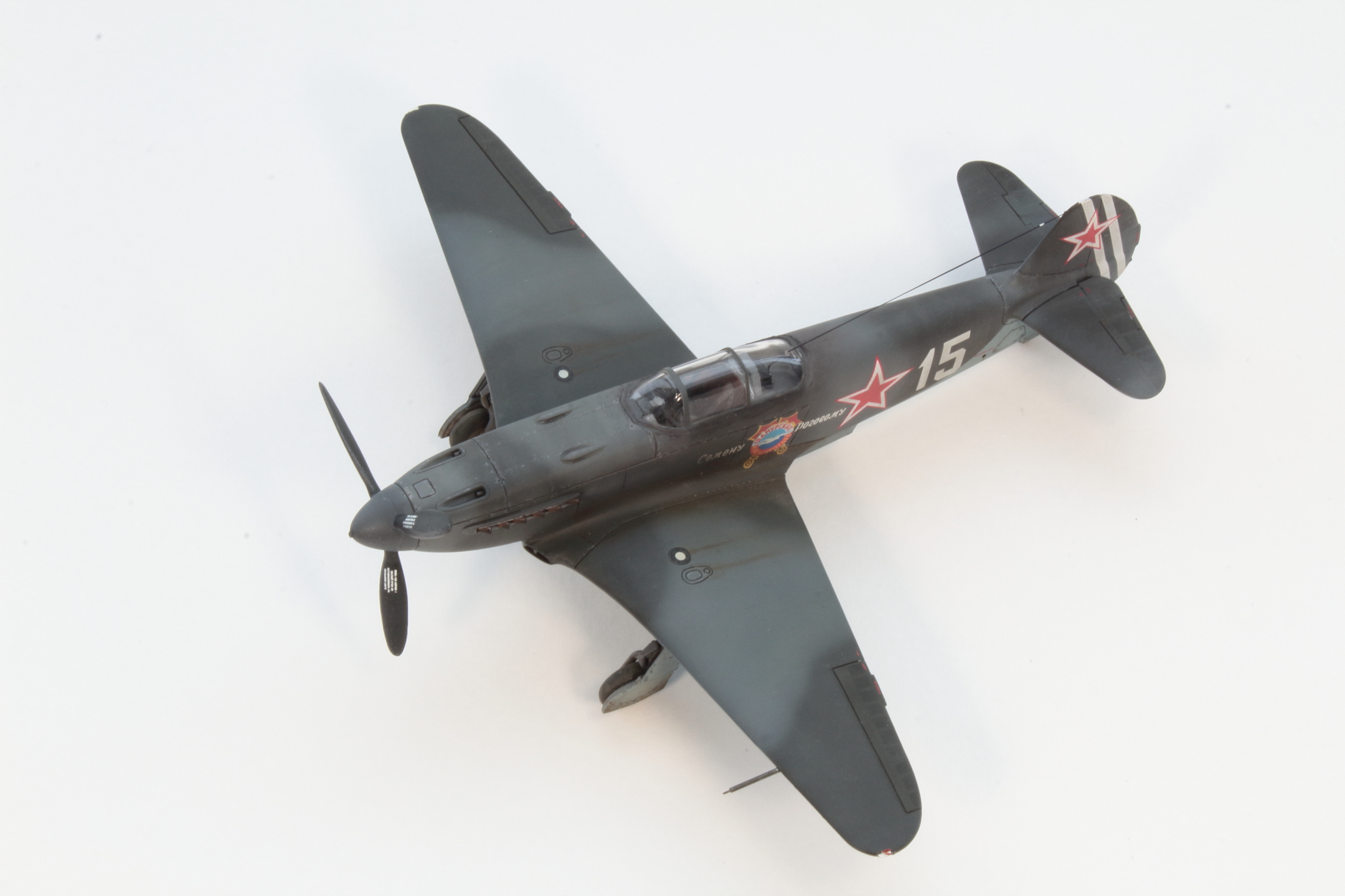 Хорошо получилась модель, в том числе окраска и тонировка, на что был сделан упор. А вот БАНО у Як-3 несколько иные, капелькой. Зря вы такие делали, тем более в 72 масштабе.