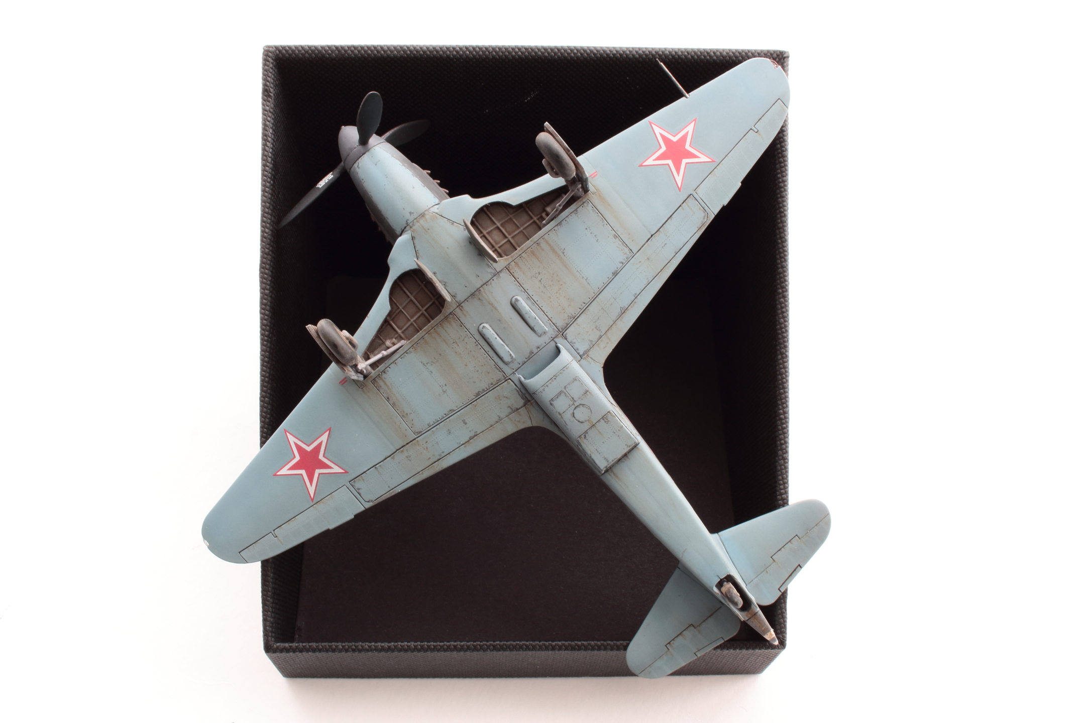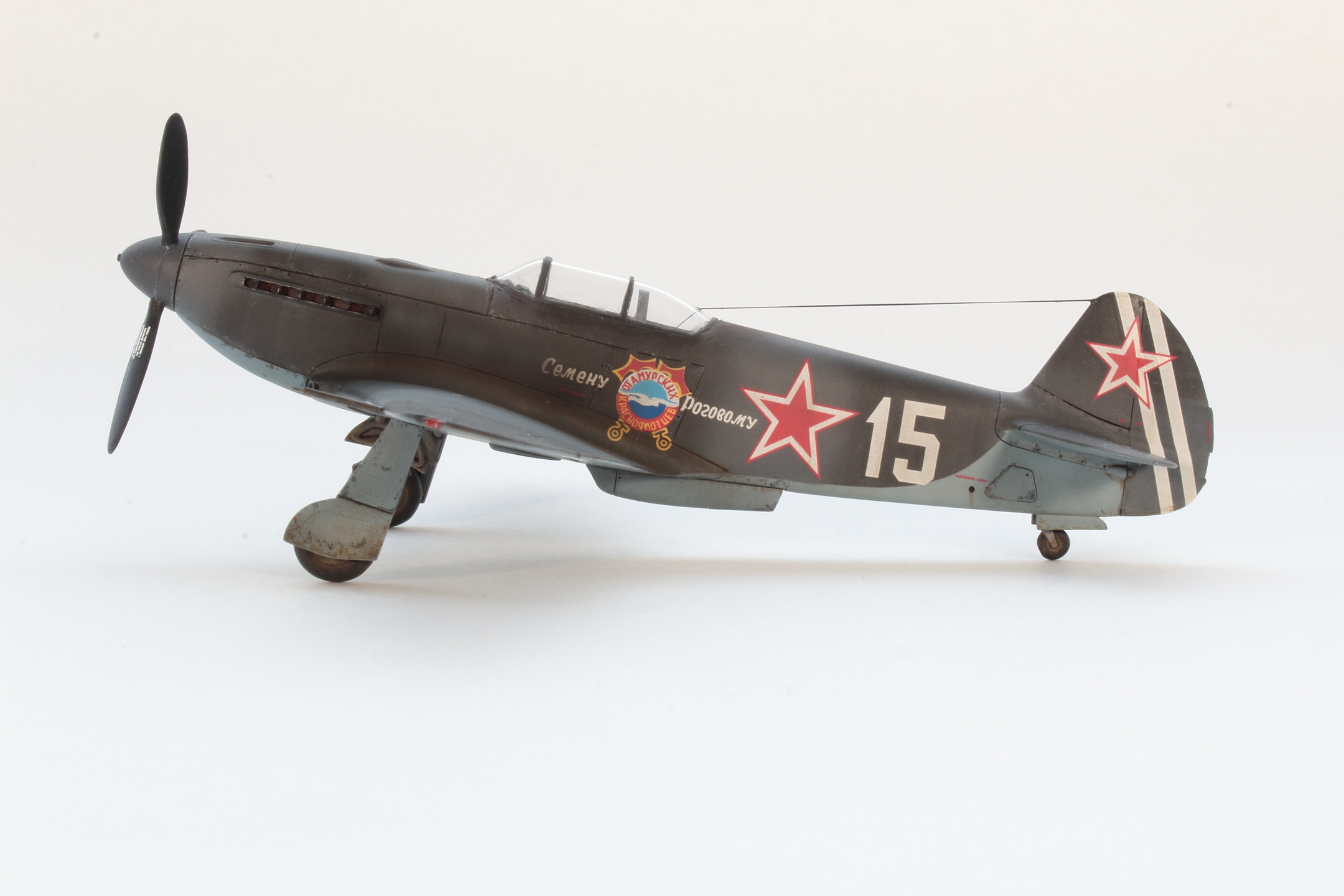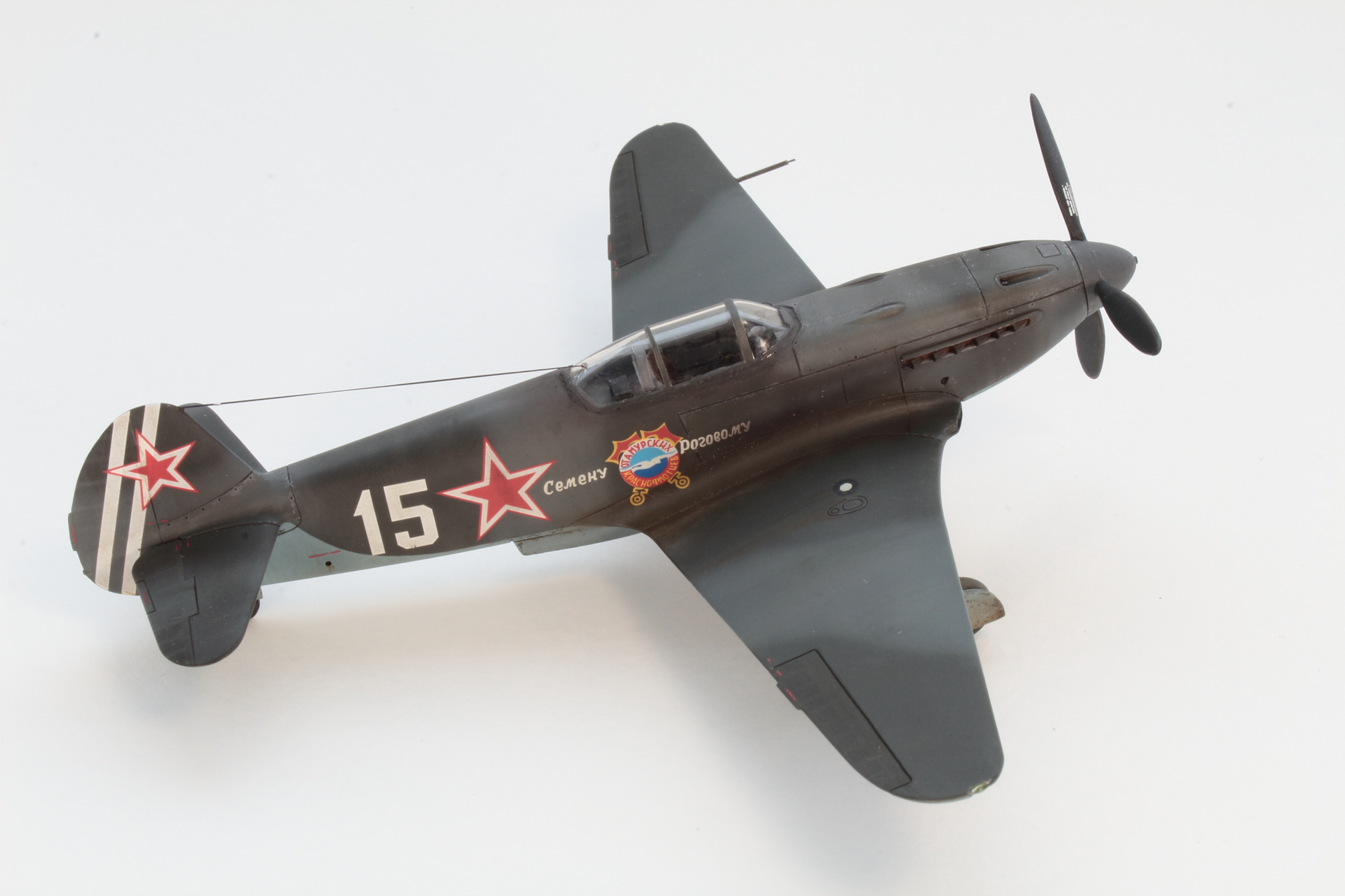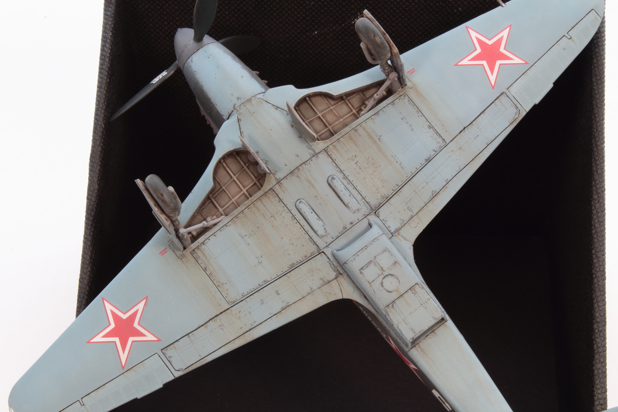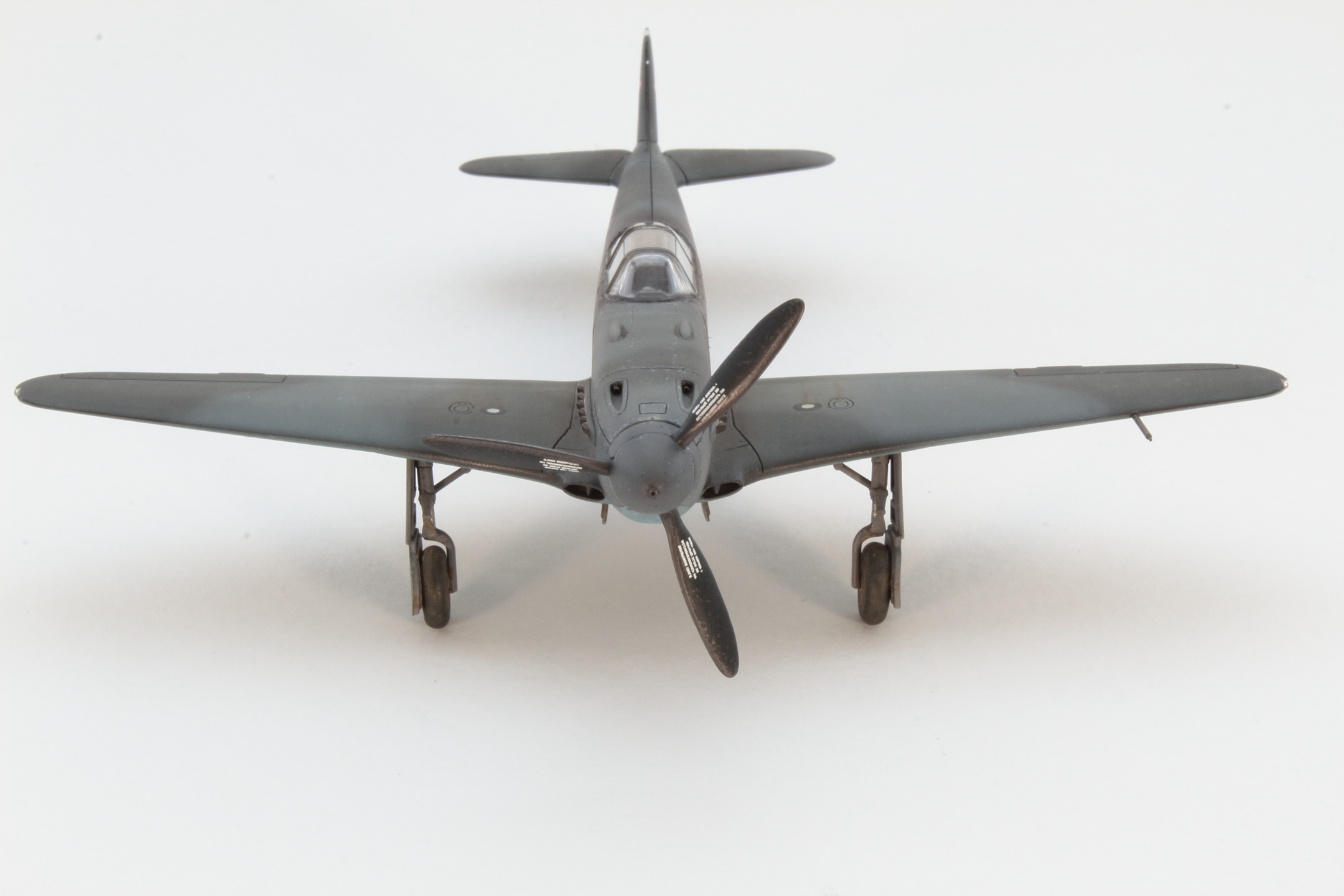 Хорошо получилась модель, в том числе окраска и тонировка, на что был сделан упор. А вот БАНО у Як-3 несколько иные, капелькой. Зря вы такие делали, тем более в 72 масштабе.