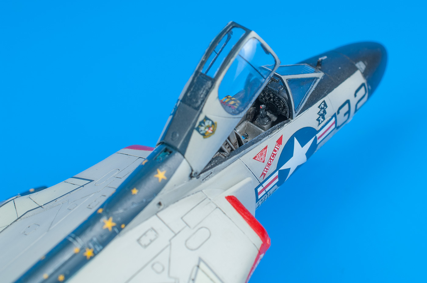 Да.. так и есть. Я из-за этого сначала синим цветом выкрасил, там где это нужно. Точнее, на баках, на законцовках крыла и на гаргроте с килем.А потом, на киле, вырезал с небольшим запасом обозначения, а звездочки потом переводил. Благо на отдельной декали они даны на прозрачной подложке.