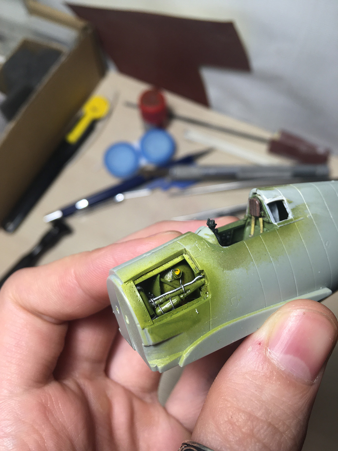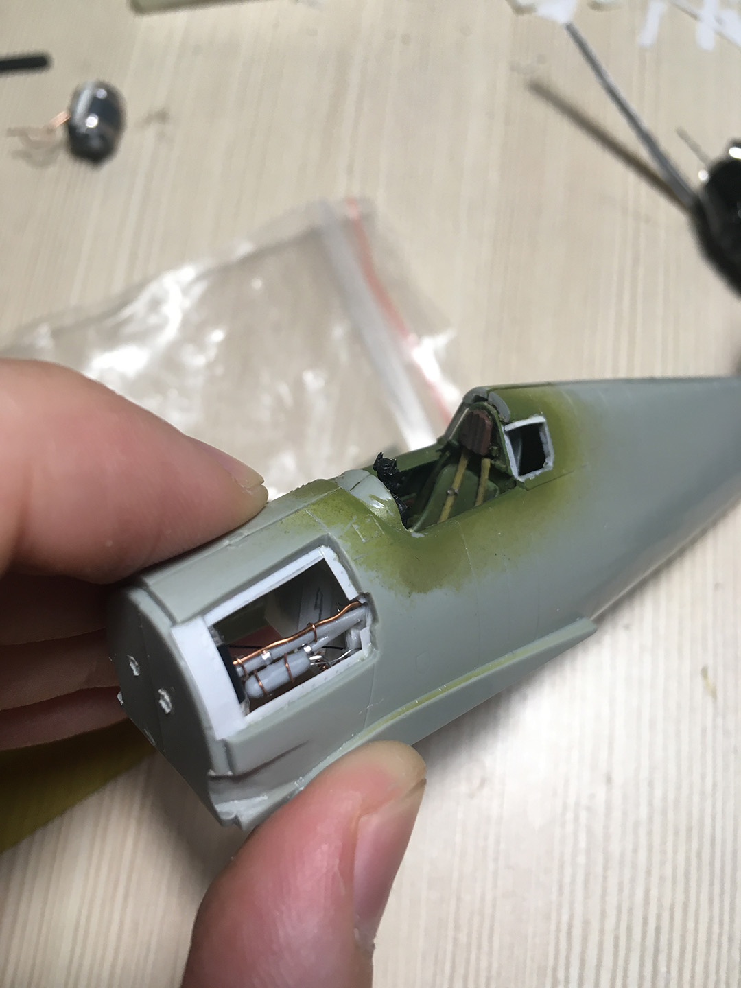 Всем привет! Давно было желание поработать с мелочевкой. В итоге мой взгляд пал на ведьму, тем более, что к ней у меня уже была кабина, ниши шасси, колеса, а так же, я подумал, что надо бы найти к ней двигатель. Впервые попробовал расклепать модель, хотя на 72 масштабе это выглядит не особо заметным. Сначала хотел открыть лишь двигатель и пулеметные ящики, но в итоге сделал и отсек с маслобаком. Вся краска - тамия, мешал на глаз. Также пришлось сделать новый фонарь, тк стандартный рассчитан только на закрытую кабину, получилось невнятно...