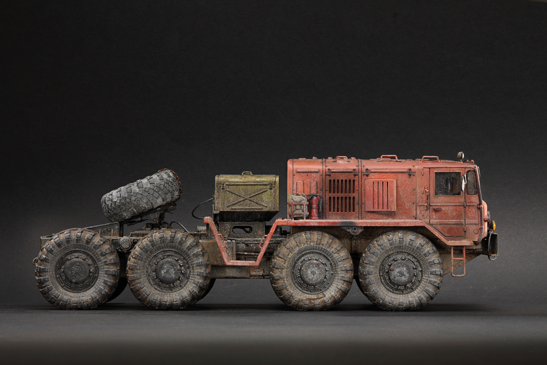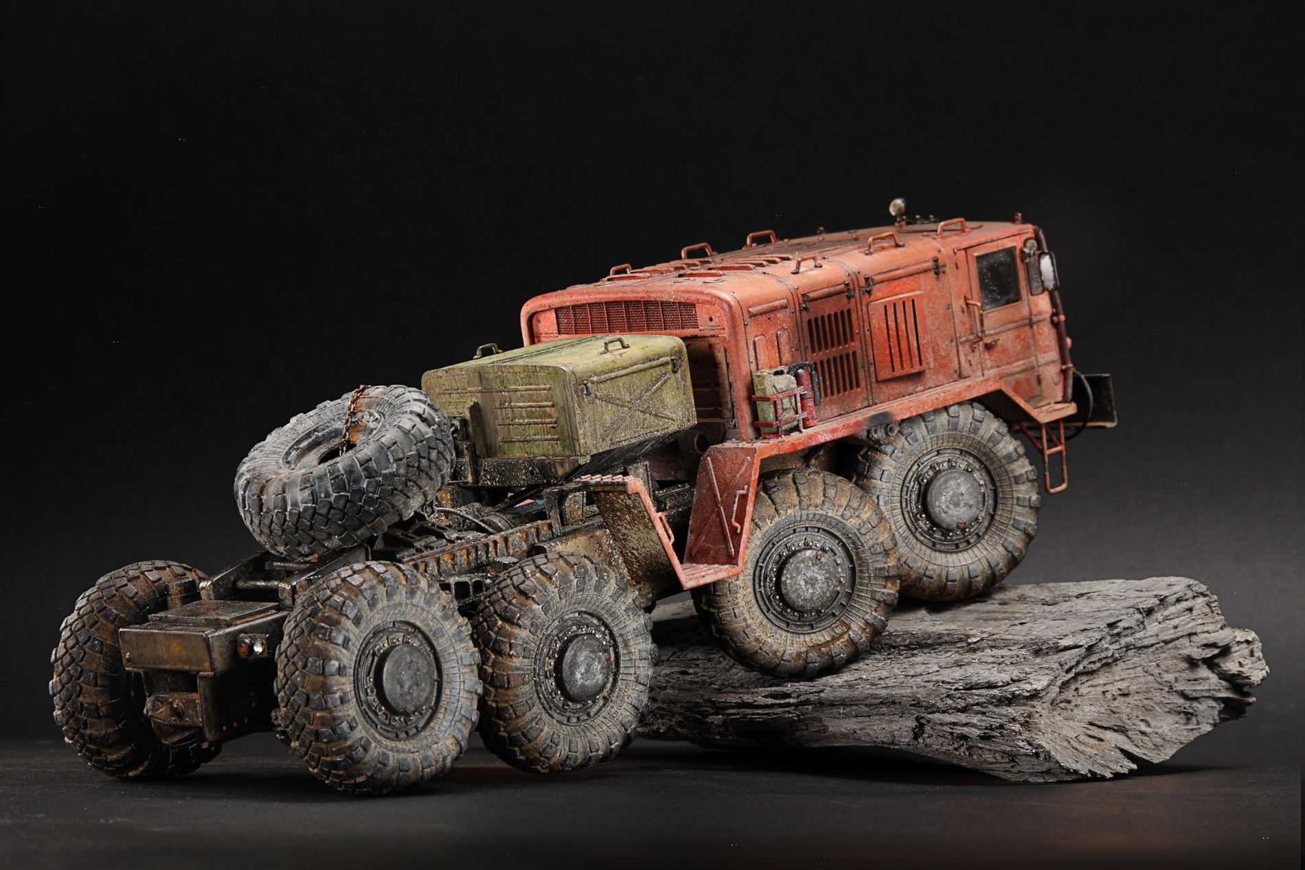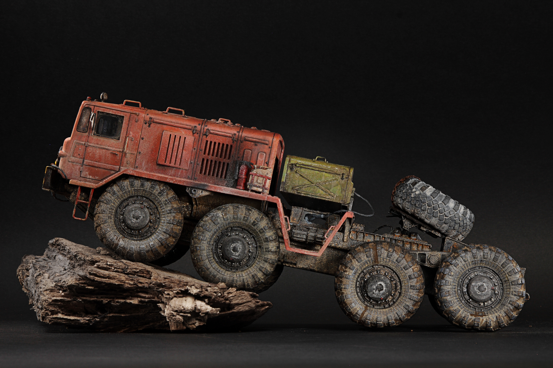 Если честно, подсматривал на прототипы тут и там, но задачей сделать 1 в 1 не ставил. Немного доработал раму и проводку, сделал рабочей подвеску. Заменил колеса из коробки на трамповские с другого маза, вкрутил в них шурупы чтоб осели. Ну вроде все, передняя фара запил, тросы и все, вроде. :)