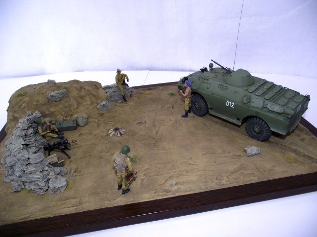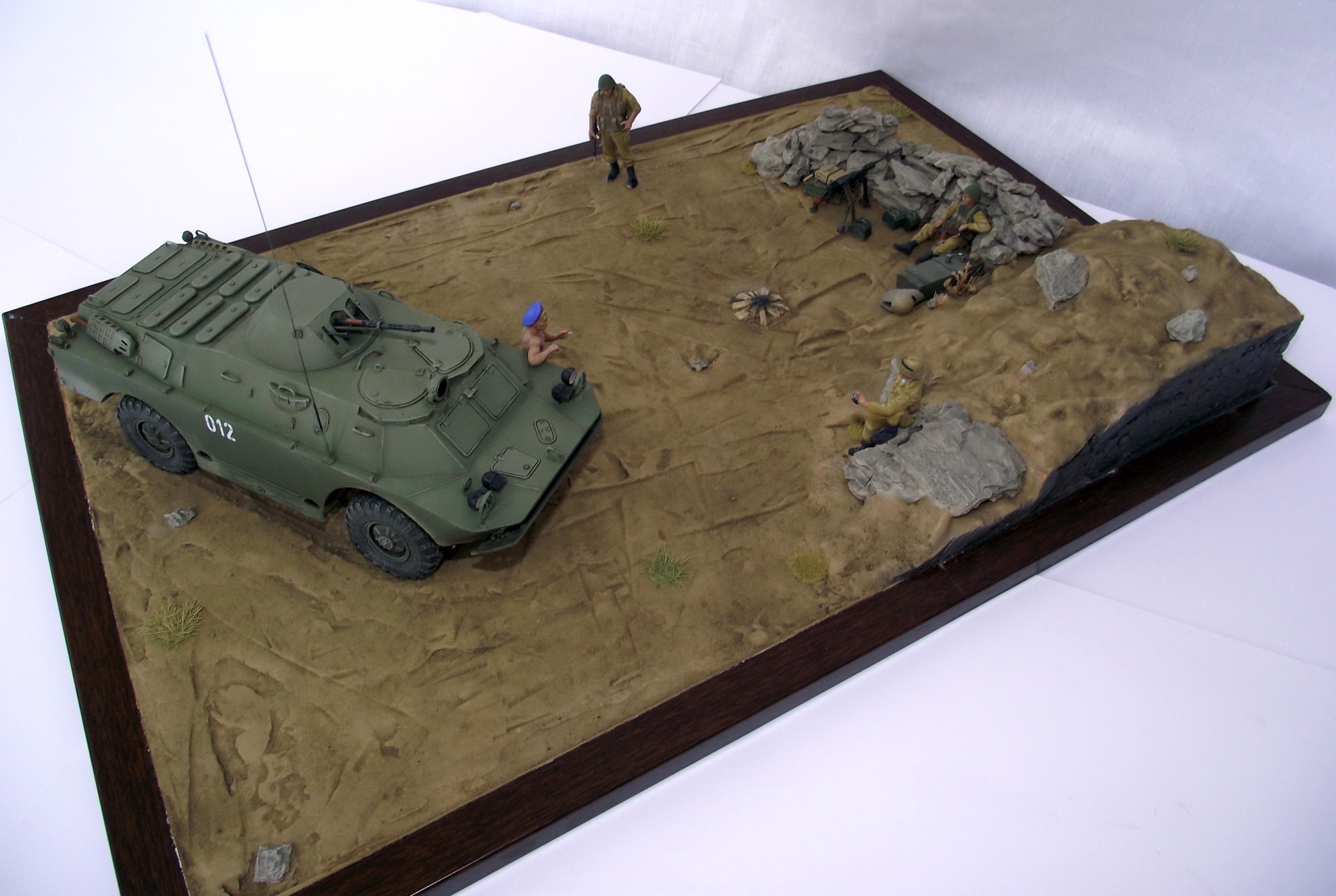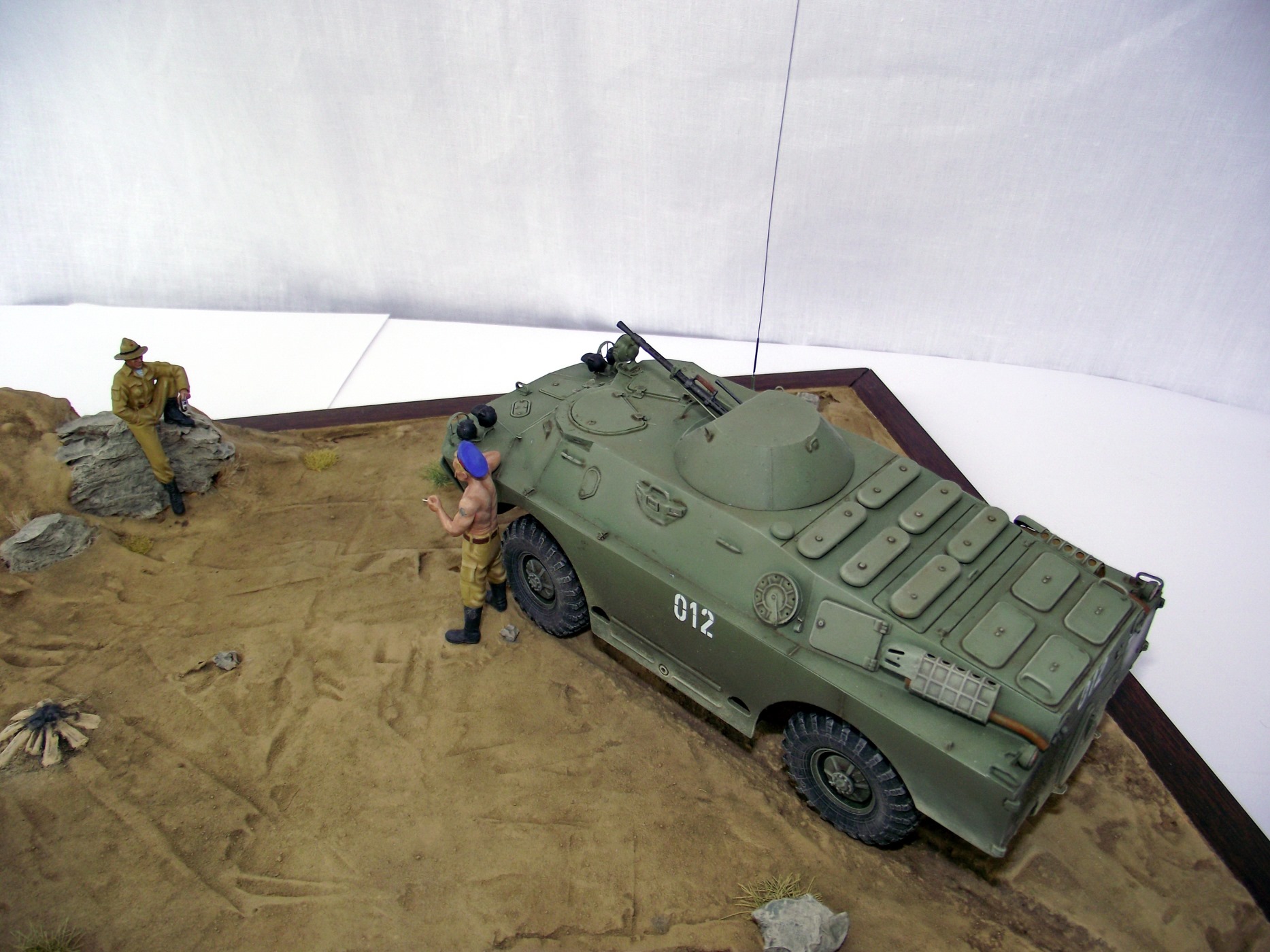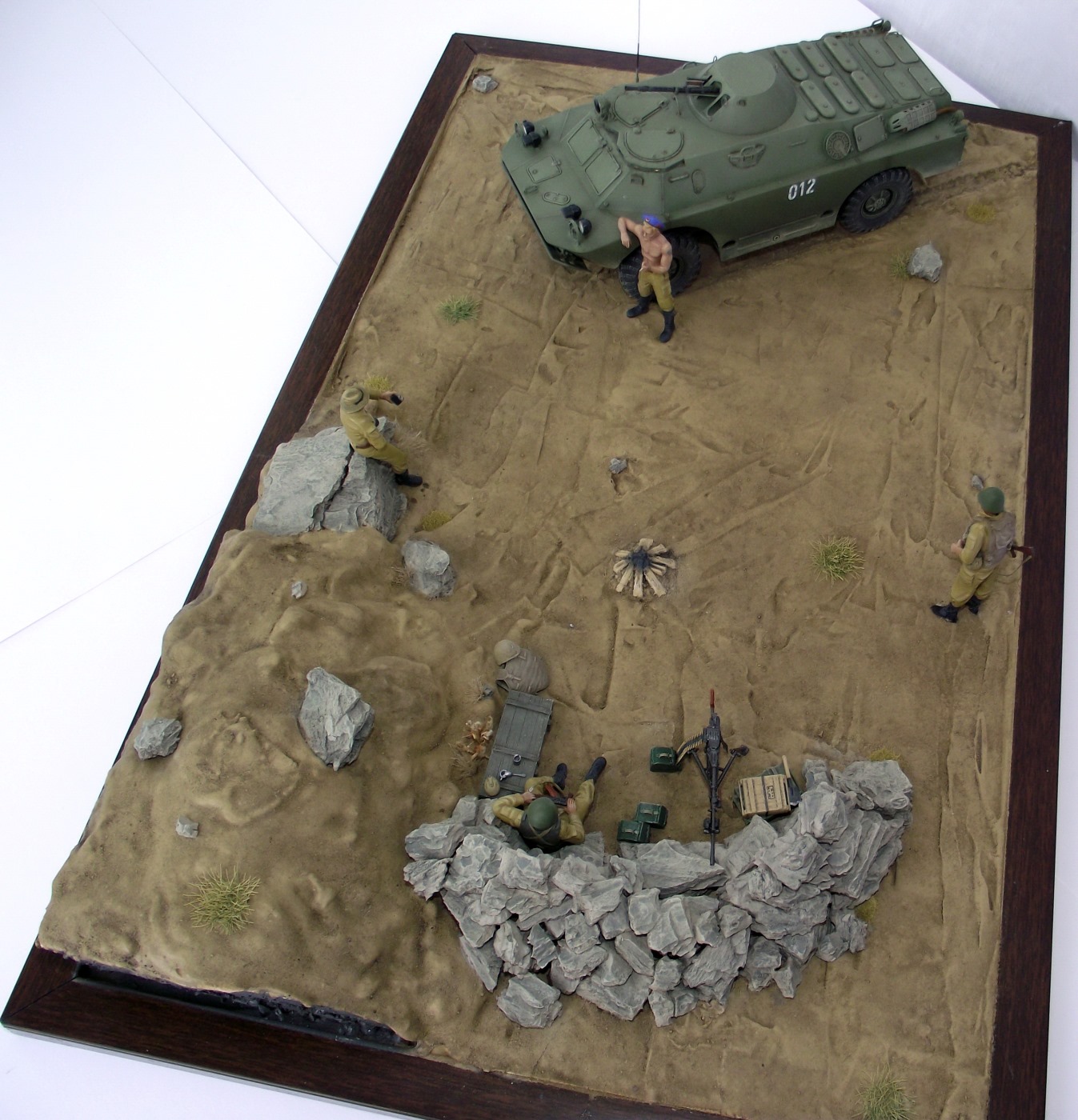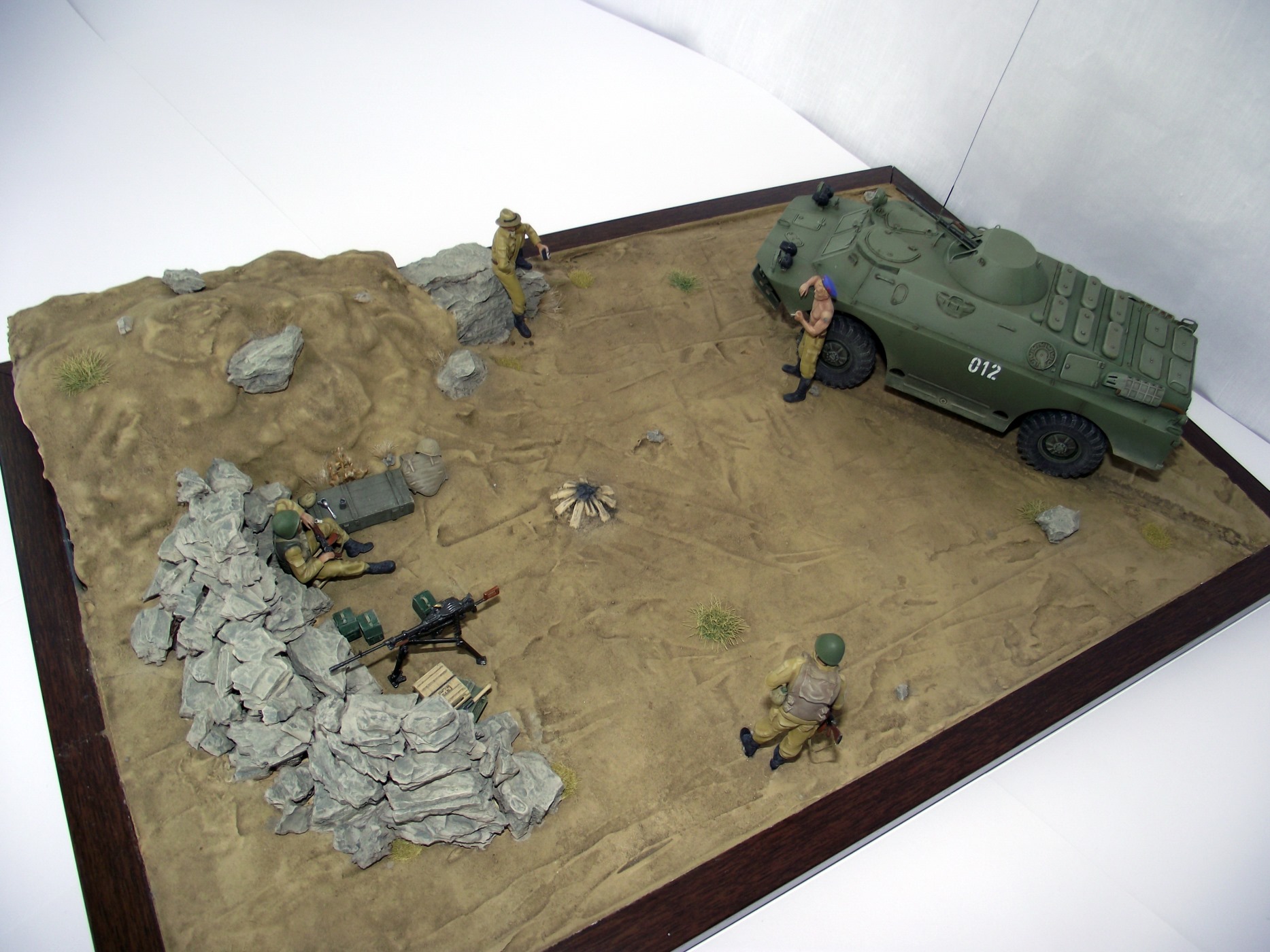В целом - красиво! Каждый элемент по отдельности выполнен хорошо. Но в целом неколько не бьется, уже указали почему. Судя по воспоминаниям ветеранов- афганская пыль это нечто, она буквально покрывает и забивает все, что можно. А БРДМка словно только что из боксов Хименеса например)