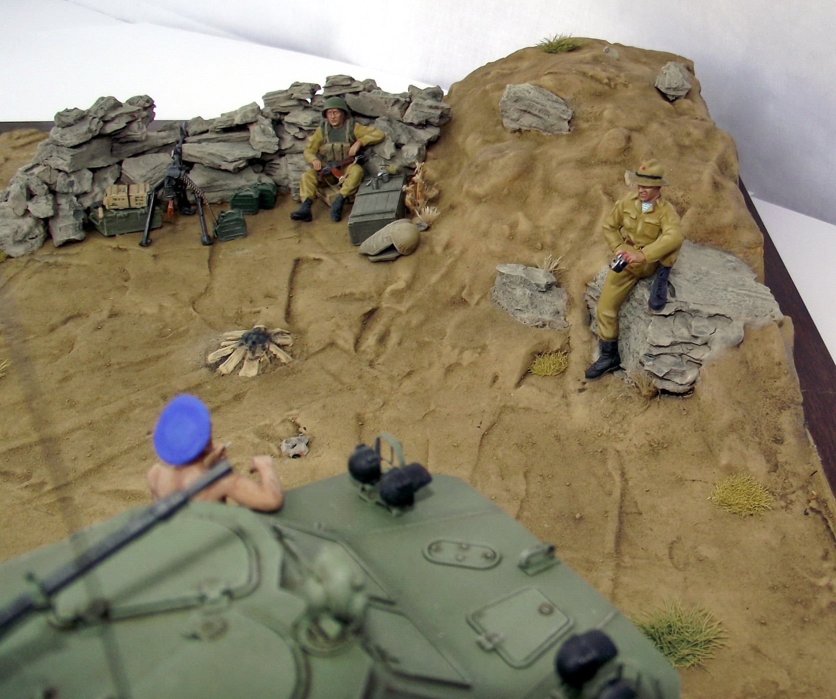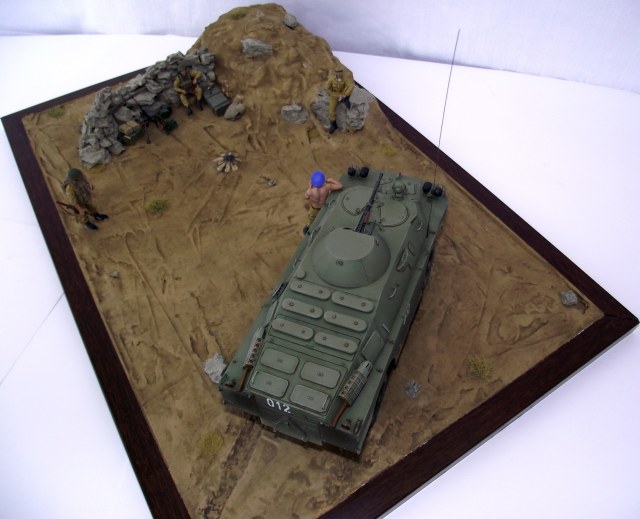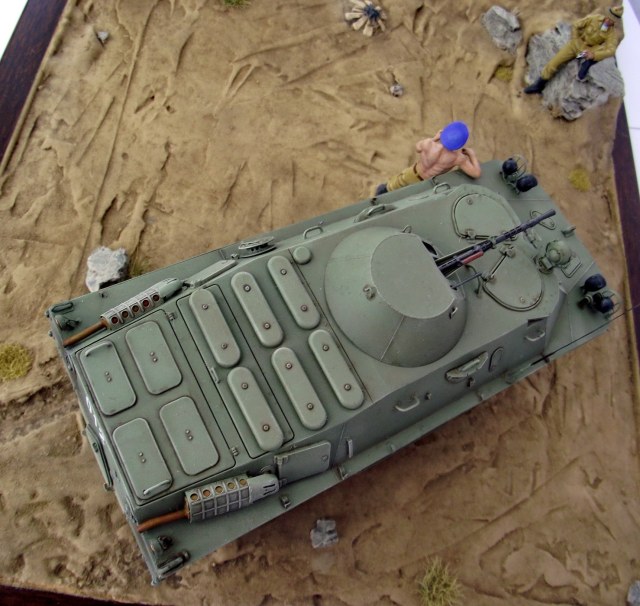 Изобразил я нехарактерную ситуацию нарочно, так как, на мой взгляд, наглухо пыльные модели выглядят бедновато и скучно, вся художественная часть и большинство доработок просто погибает под слоем пыли. Например как на моей БМП с диорамы "На Саланг".